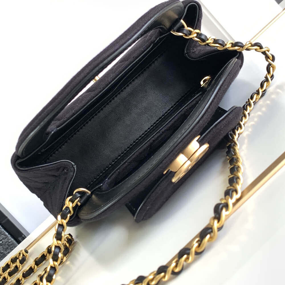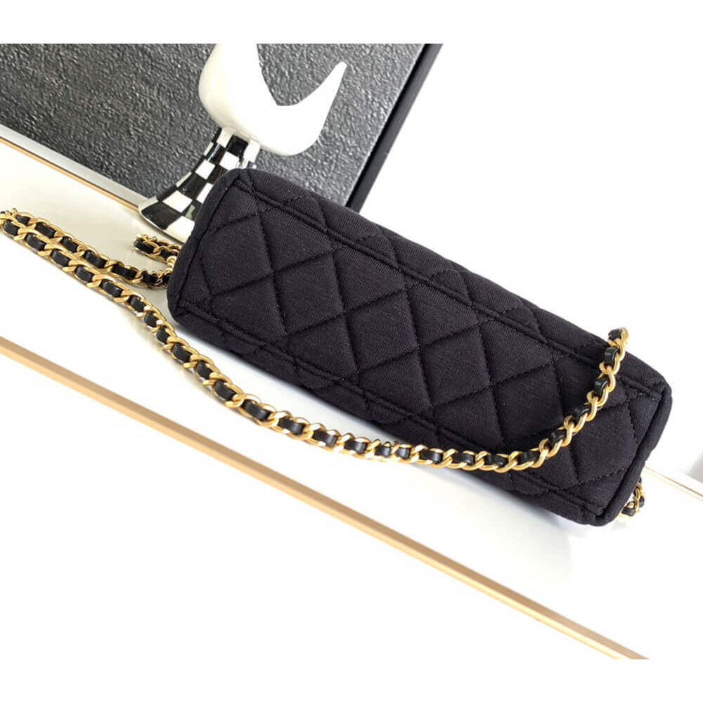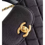 Introducing the Chanel Mini Kelly in Black Jersey fabric, adorned with Brushed Gold Hardware.