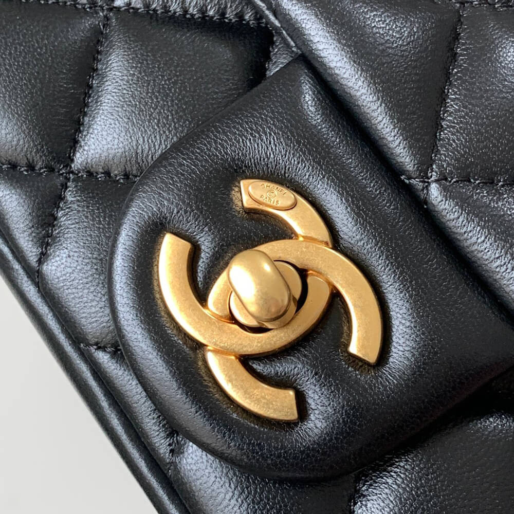 Chanel 24P series bag, referred to in the text as a “pearl square fatty” ― a playful way to describe the shape and design of the bag that features a pearl handle. The description suggests it is perfect for spring and summer, offering an elegant choice that combines practicality with beauty. The text mentions that the bag is particularly well-suited for slimmer women due to its less bulky design, and highlights the treated lambskin material that is more durable than previous versions. The author expresses a strong affection for the bag and recommends it highly, despite noting that the only downside might be the price.