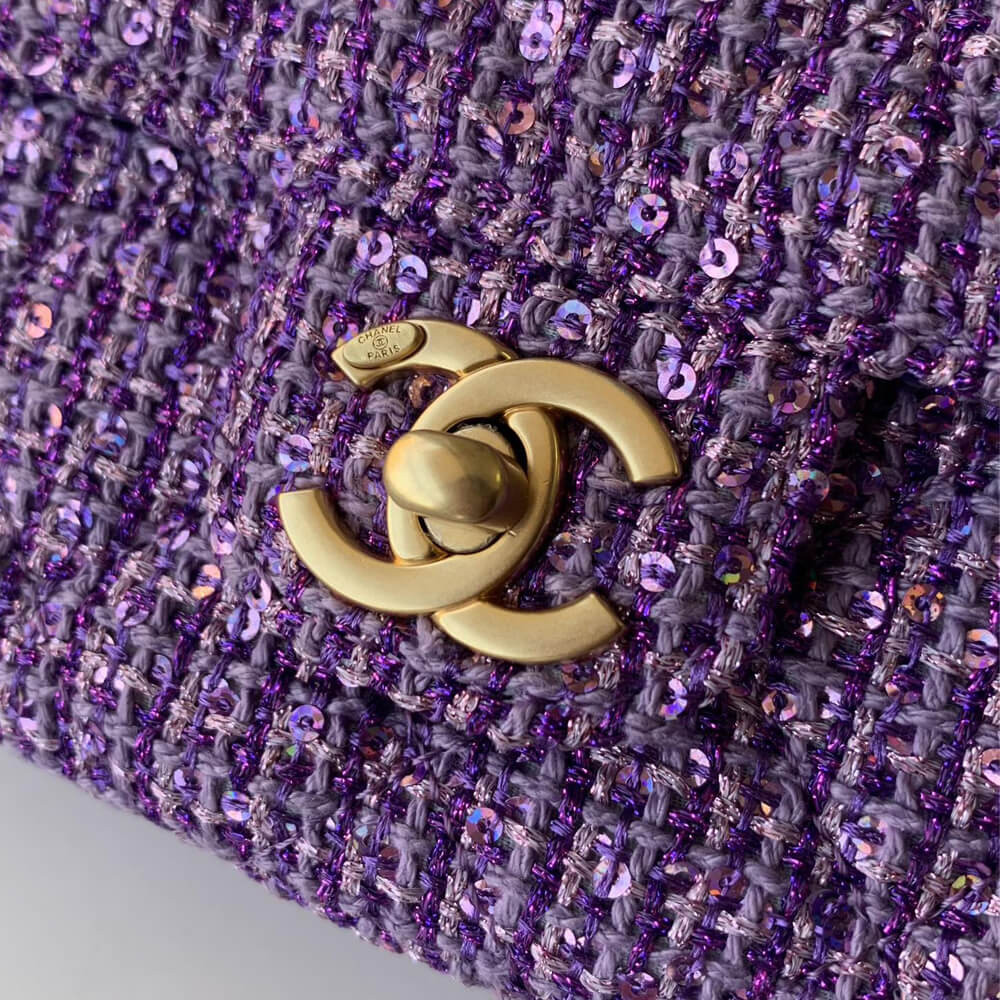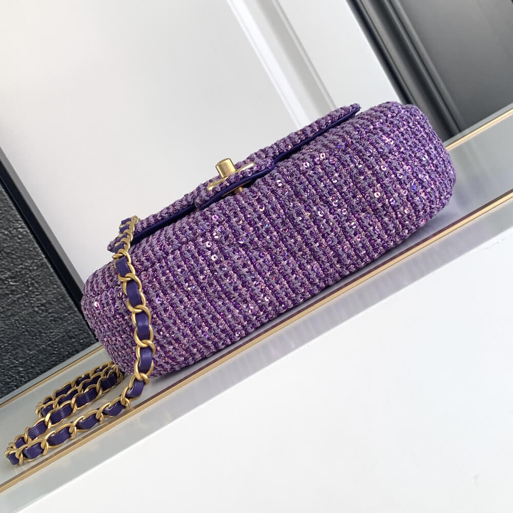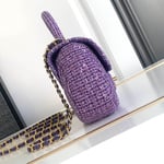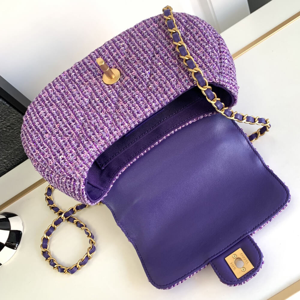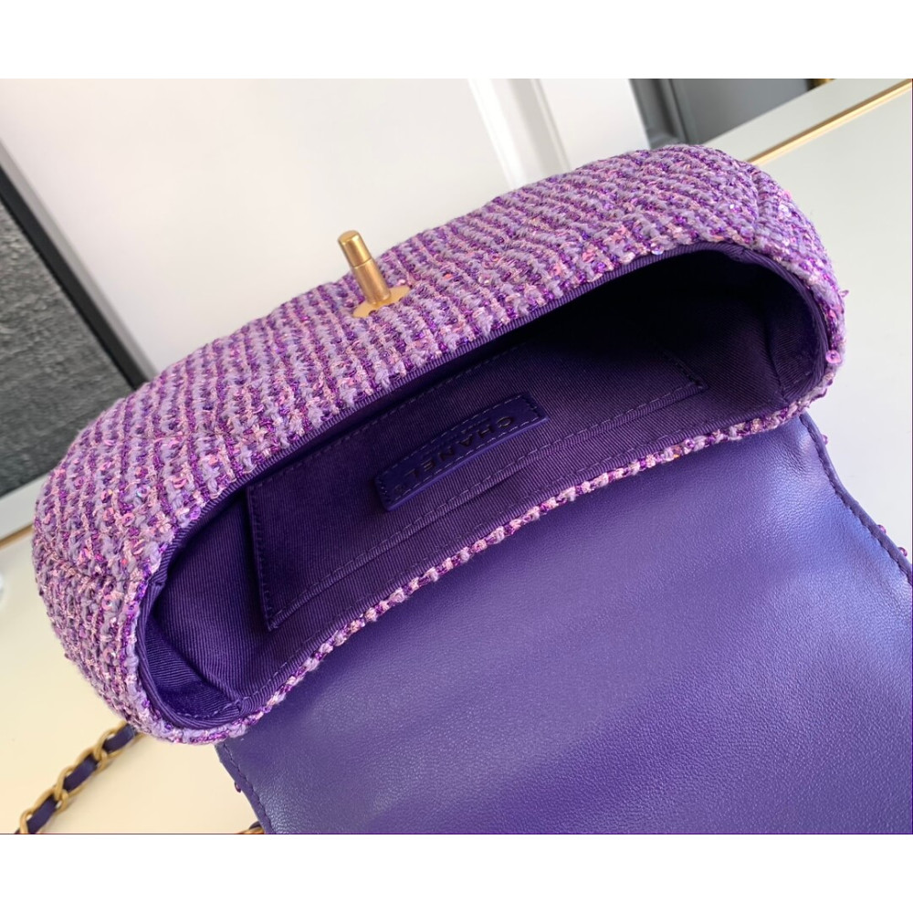 This Mini flap bag is in purple tweed with antique gold tone hardware and has a front flap with signature CC turnlock closure, a round shape structure, CC turnlock closure, one single rolled tweed handle and interwoven purple leather and antique gold tone chainlink crossbody/shoulder strap.
