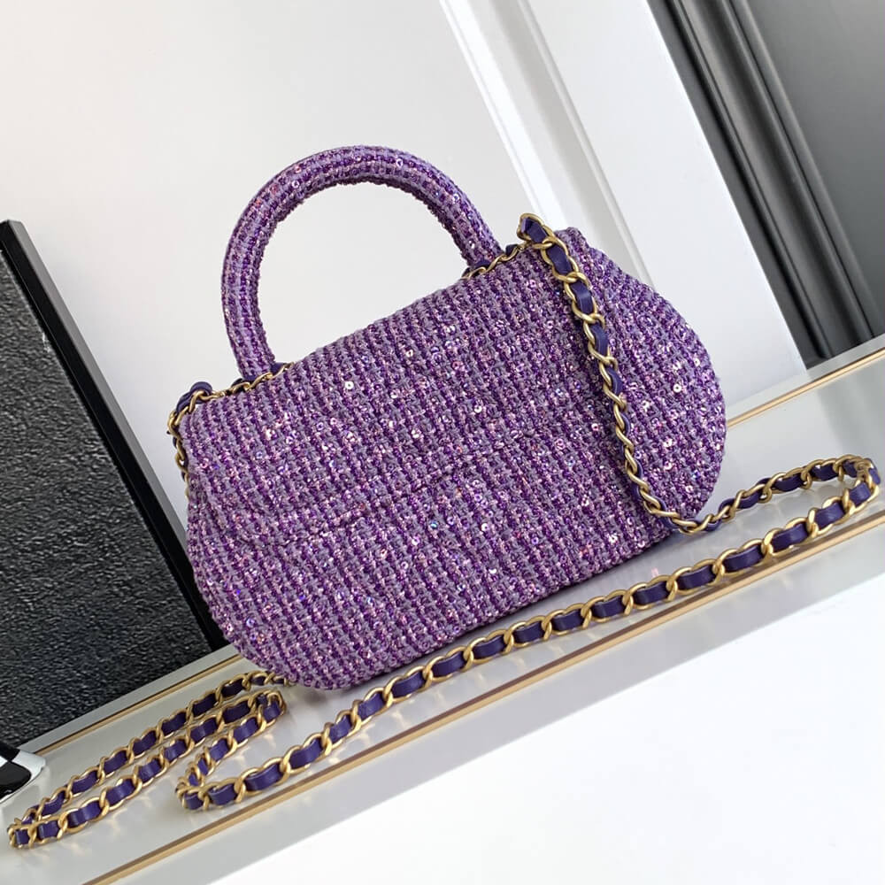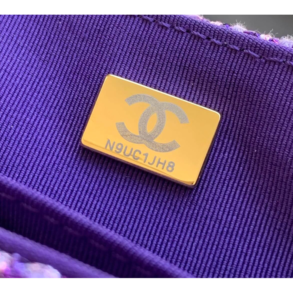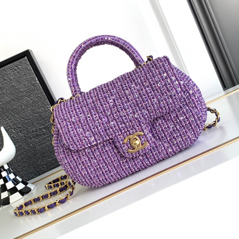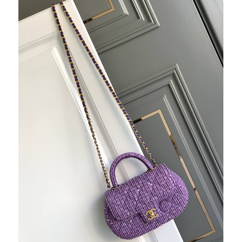 This Mini flap bag is in purple tweed with antique gold tone hardware and has a front flap with signature CC turnlock closure, a round shape structure, CC turnlock closure, one single rolled tweed handle and interwoven purple leather and antique gold tone chainlink crossbody/shoulder strap.