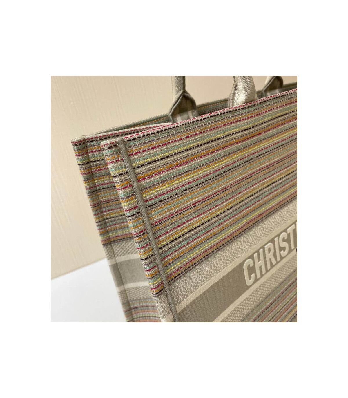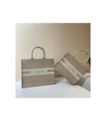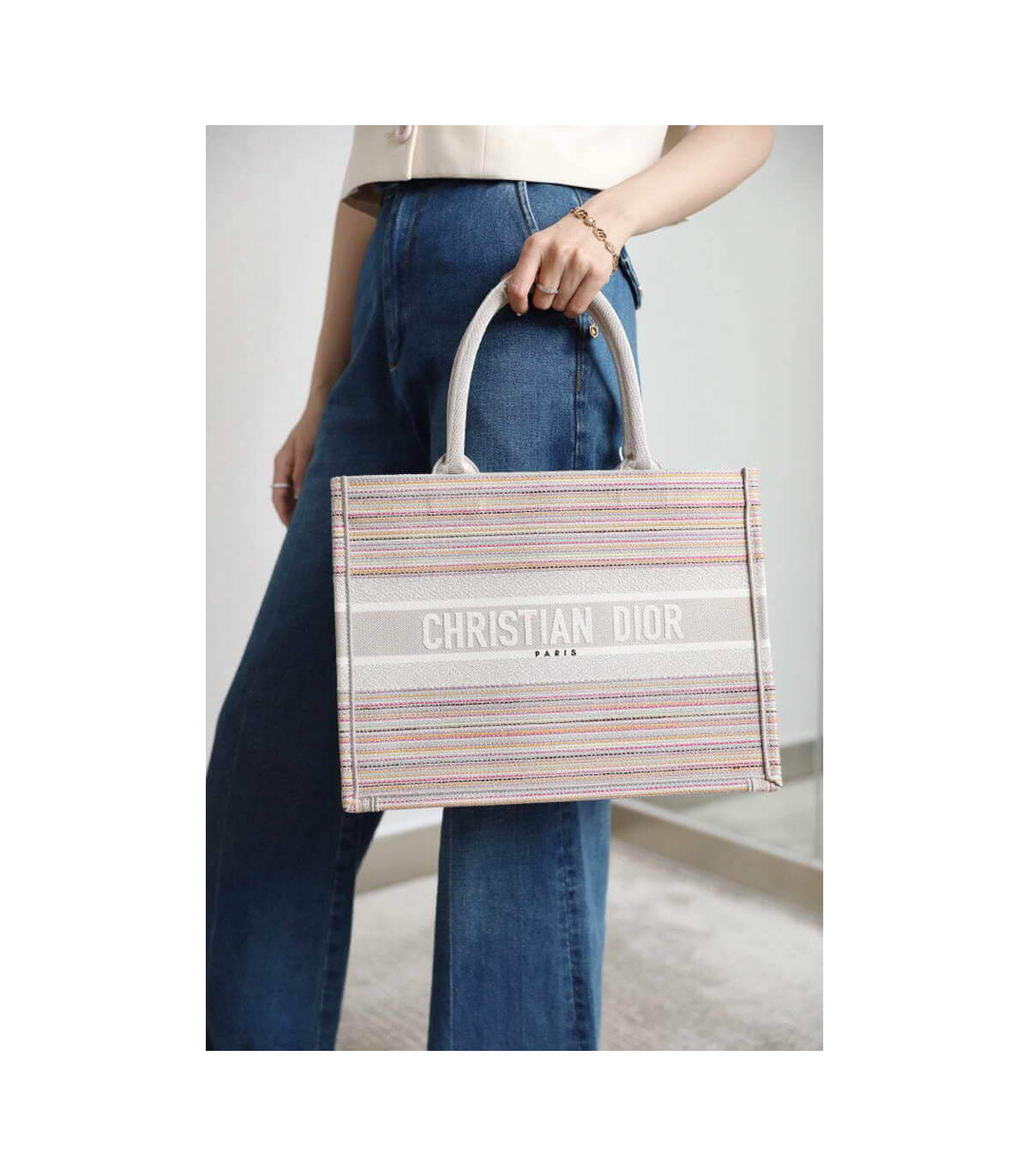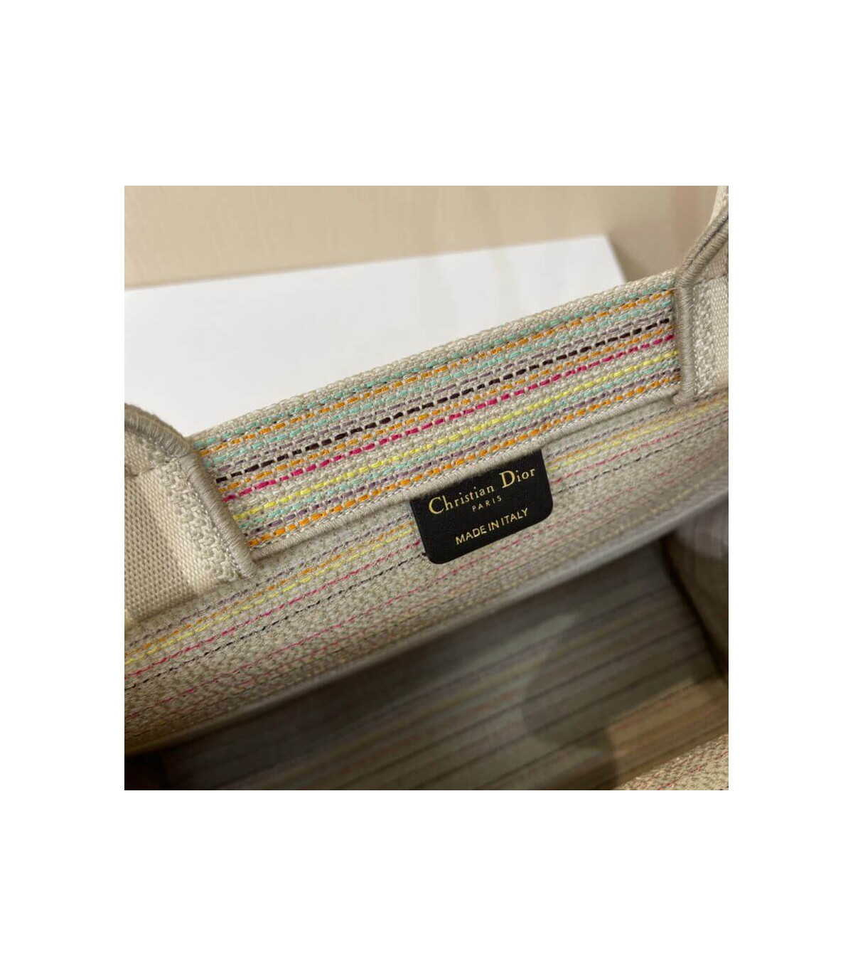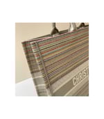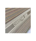The Dior Book Tote, an original style introduced by Creative Director Maria Grazia Chiuri, has become a staple of the Dior aesthetic. This small style is part of the Dior Gold capsule collection and can hold all the daily essentials. It is fully embroidered with thin multicolor pastel stripes and enhanced with metallic thread. Adorned with the ‘Christian Dior’ signature on the front, the Dior Book Tote exemplifies the House’s signature savoir-faire and can be paired with other Dior Gold creations from the collection.