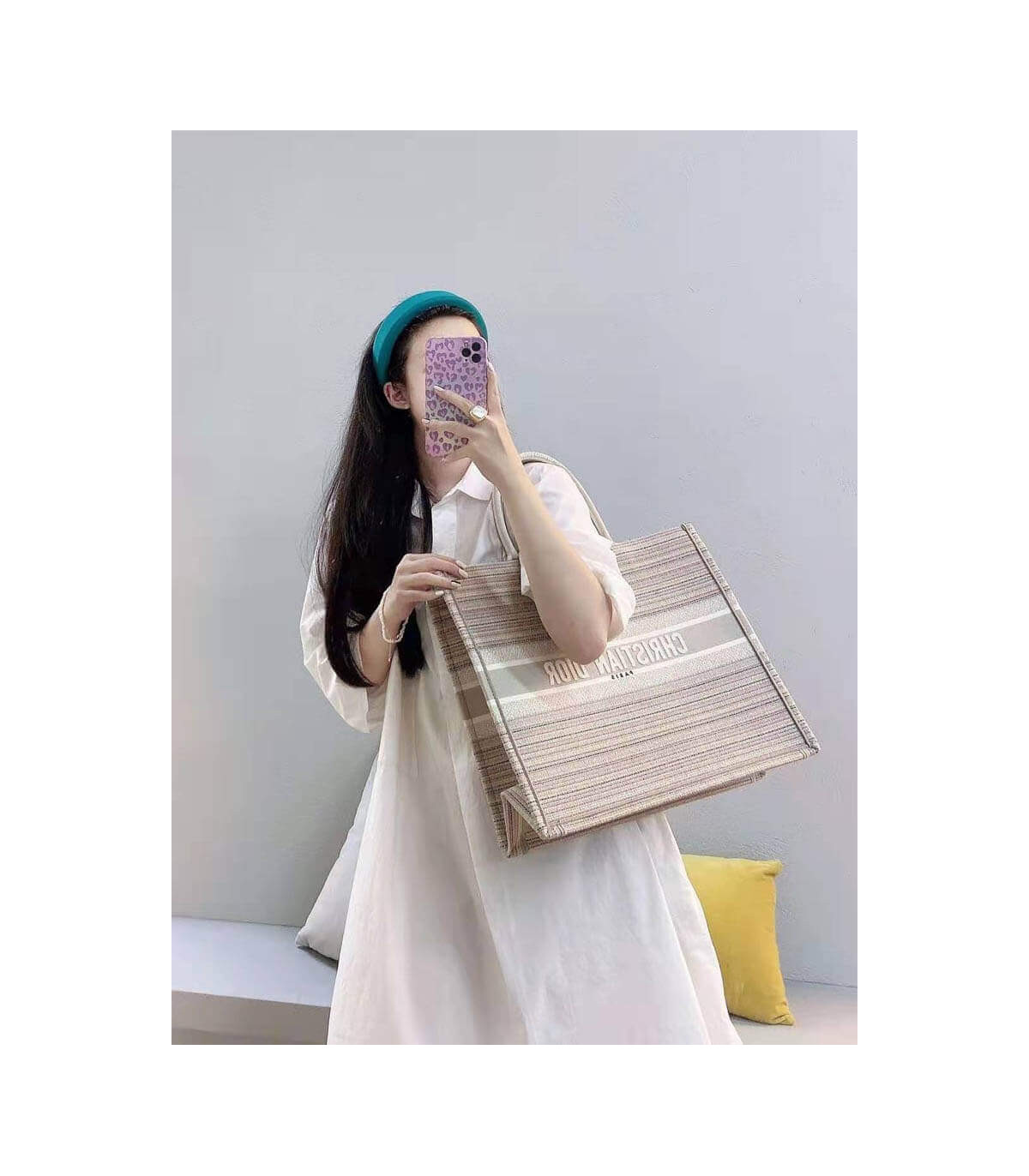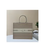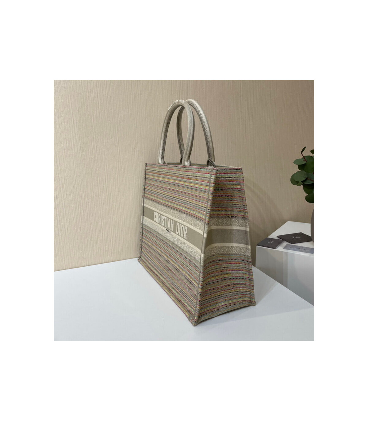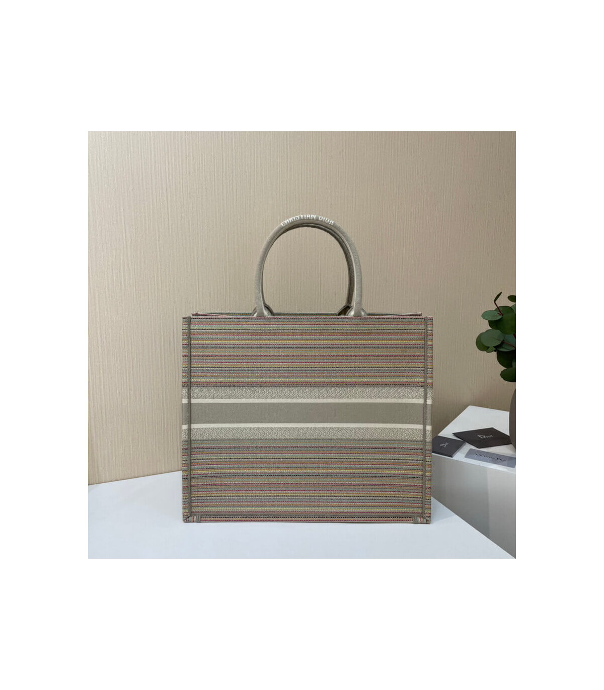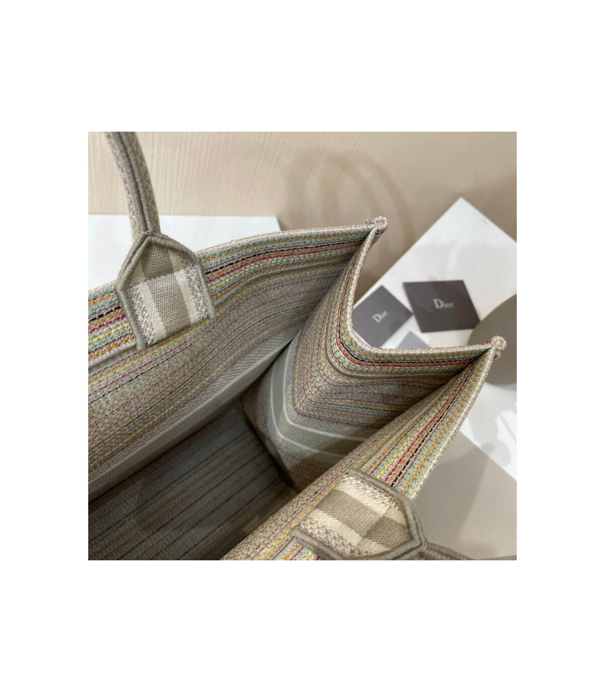 The Dior Book Tote, an original style introduced by Creative Director Maria Grazia Chiuri, has become a staple of the Dior aesthetic. This small style is part of the Dior Gold capsule collection and can hold all the daily essentials. It is fully embroidered with thin multicolor pastel stripes and enhanced with metallic thread. Adorned with the ‘Christian Dior’ signature on the front, the Dior Book Tote exemplifies the House’s signature savoir-faire and can be paired with other Dior Gold creations from the collection.