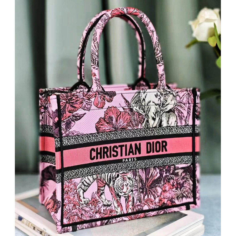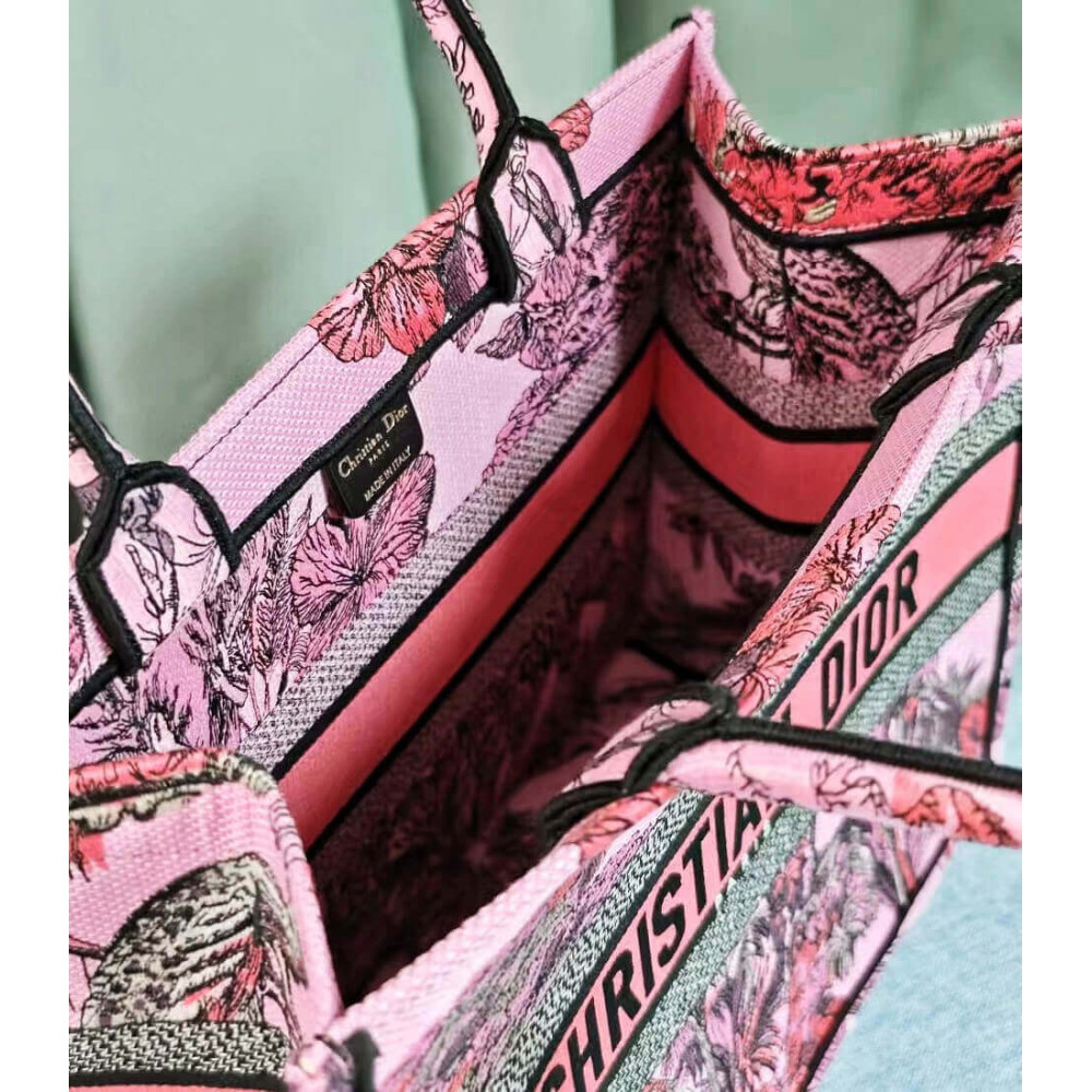 Introduced by Maria Grazia Chiuri, Creative Director of Christian Dior, the Dior Book Tote has become a staple of the Dior aesthetic. Designed to hold all the daily essentials, the pink multicolor style is fully embroidered with the Toile de Jouy Voyage motif by Pietro Ruffo, setting Mr. Dior’s iconic pattern into the heart of Indian flora and fauna. Adorned with the Christian Dior Paris signature on the front, the large tote exemplifies the House’s signature savoir-faire and may be carried by hand or worn over the shoulder.