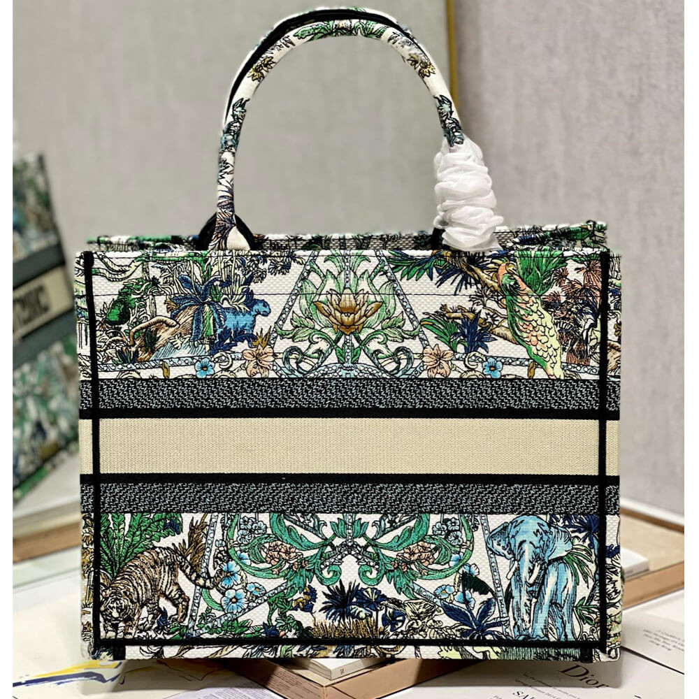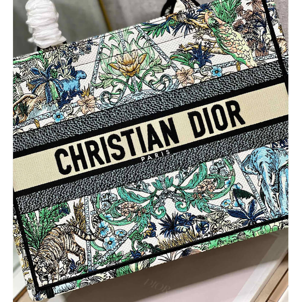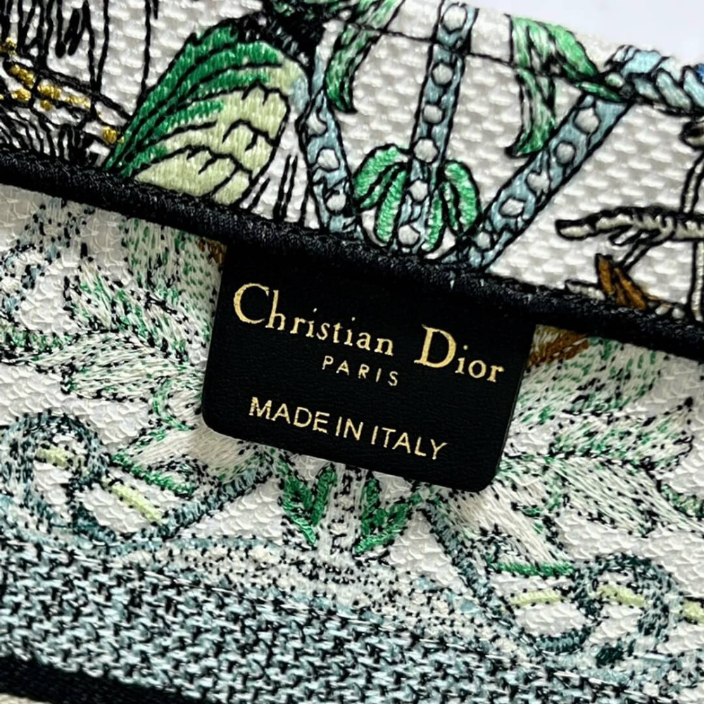 The Dior Book Tote is an original creation introduced by Dior’s Creative Director, Maria Grazia Chiuri, and has become a staple of the Dior aesthetic. Designed to hold all the daily essentials, the style is fully embroidered with the white multicolor étoile de Voyage motif by Pietro Ruffo, which features a harmonious immersion into the heart of Indian flora and fauna set in a star. Adorned with a Christian Dior Paris signature on the front, the medium tote exemplifies the House’s signature savoir-faire and may be carried by hand or worn over the shoulder.