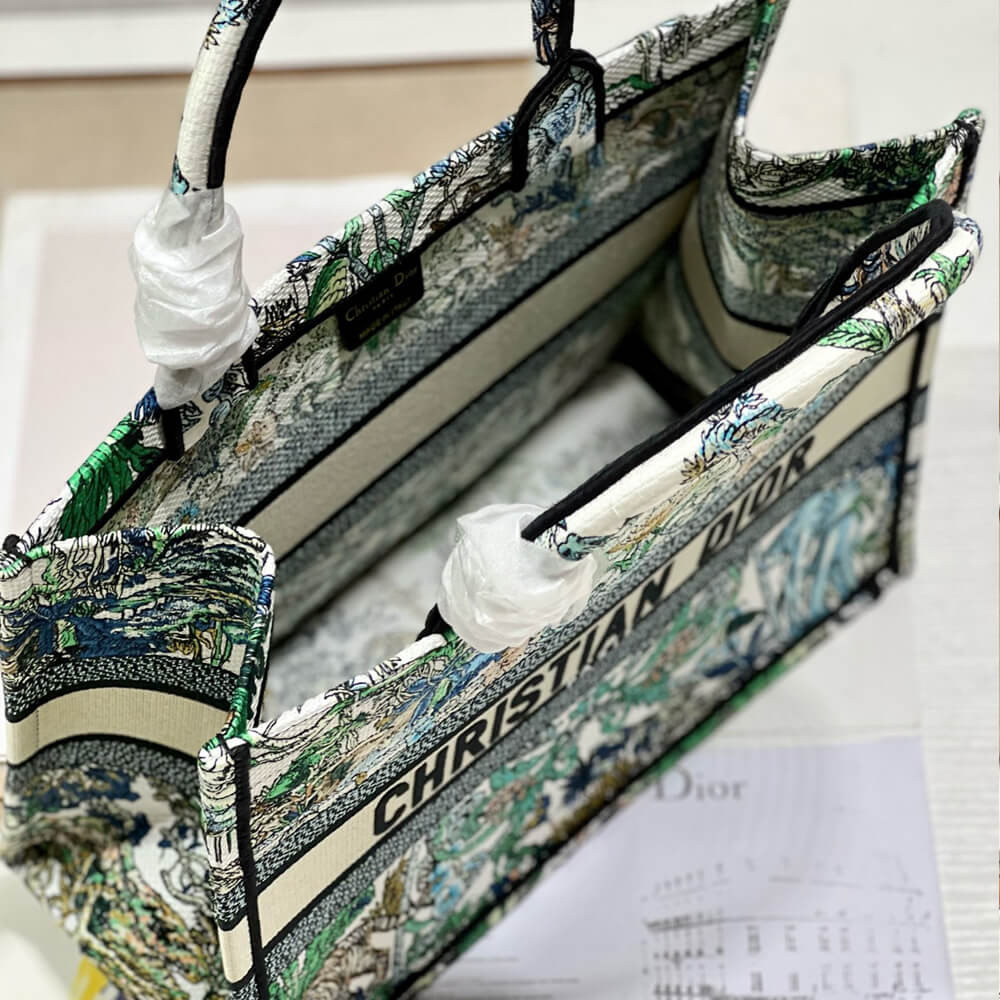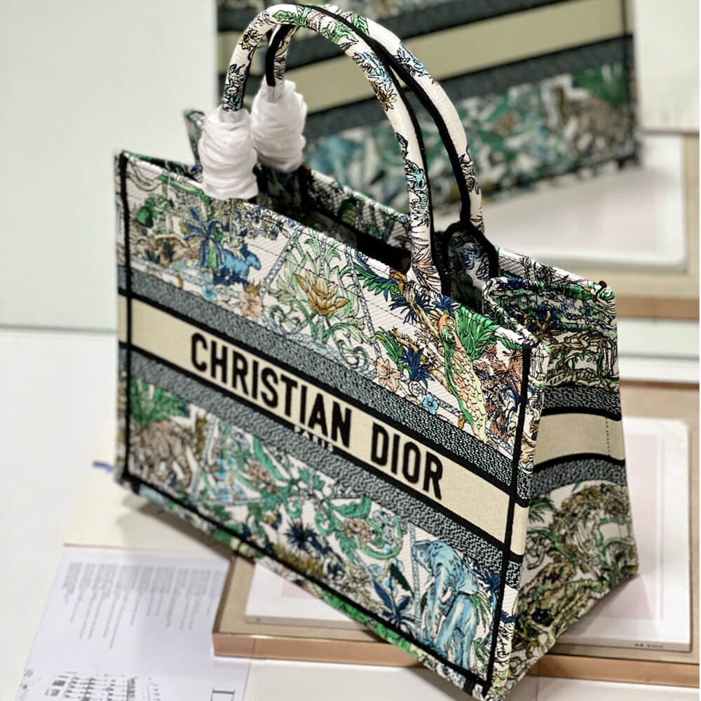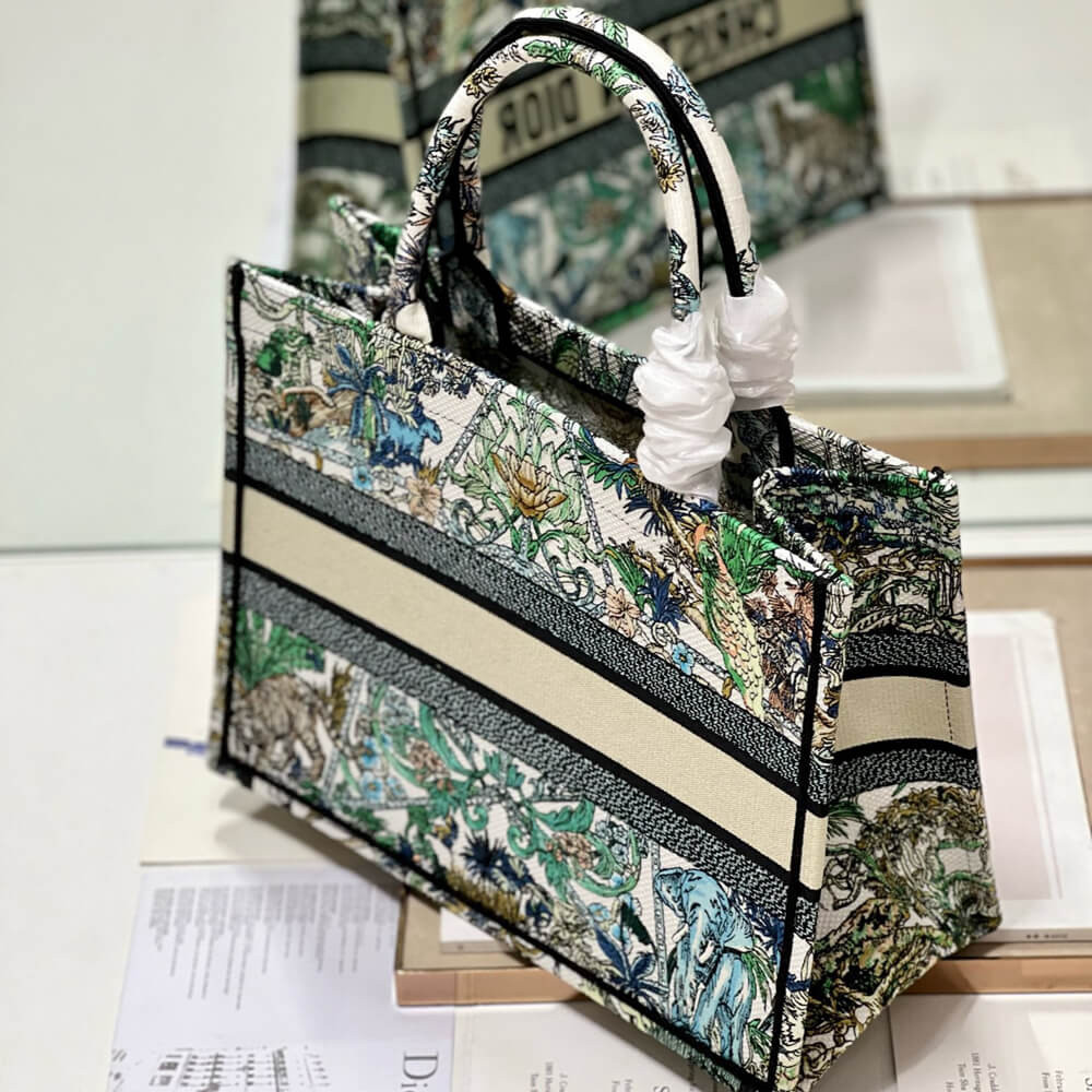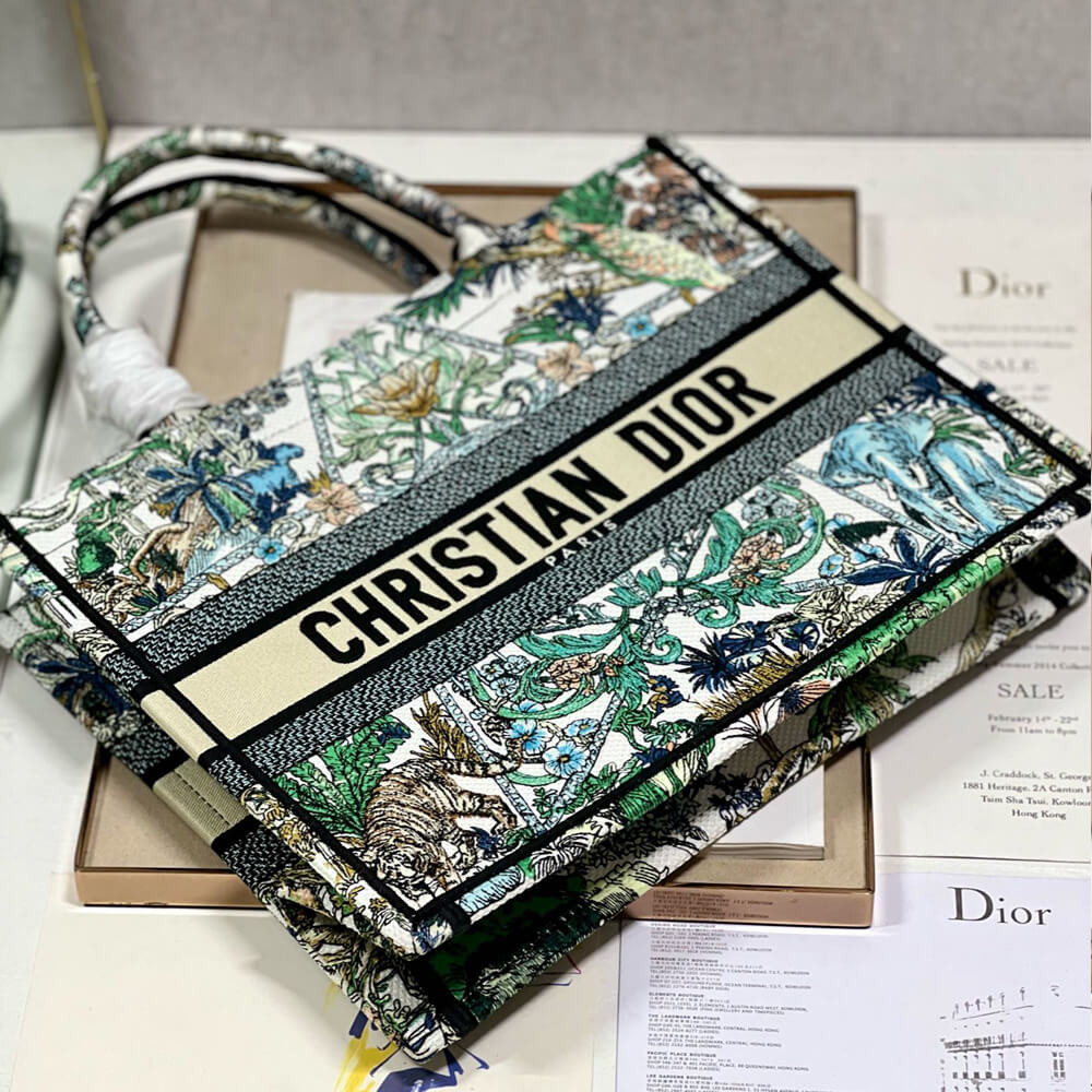 The Dior Book Tote is an original creation introduced by Dior’s Creative Director, Maria Grazia Chiuri, and has become a staple of the Dior aesthetic. Designed to hold all the daily essentials, the style is fully embroidered with the white multicolor étoile de Voyage motif by Pietro Ruffo, which features a harmonious immersion into the heart of Indian flora and fauna set in a star. Adorned with a Christian Dior Paris signature on the front, the medium tote exemplifies the House’s signature savoir-faire and may be carried by hand or worn over the shoulder.