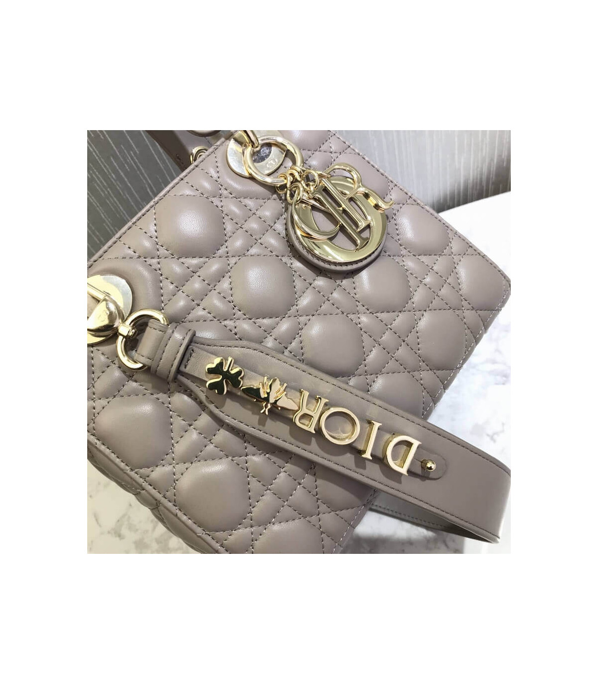 The Lady Dior My ABCDior bag epitomizes the House’s vision of elegance and beauty. Sleek and refined, the timeless yet relevant style is crafted in black lambskin with Cannage stitching, creating the instantly recognizable quilted texture, while the pale gold-finish metal ‘D.I.O.R.’ charms offer an elegant allure. Featuring a shoulder strap that can be customized by adding pins, this unique style may carried by hand, worn over the shoulder or crossbody.