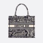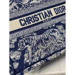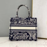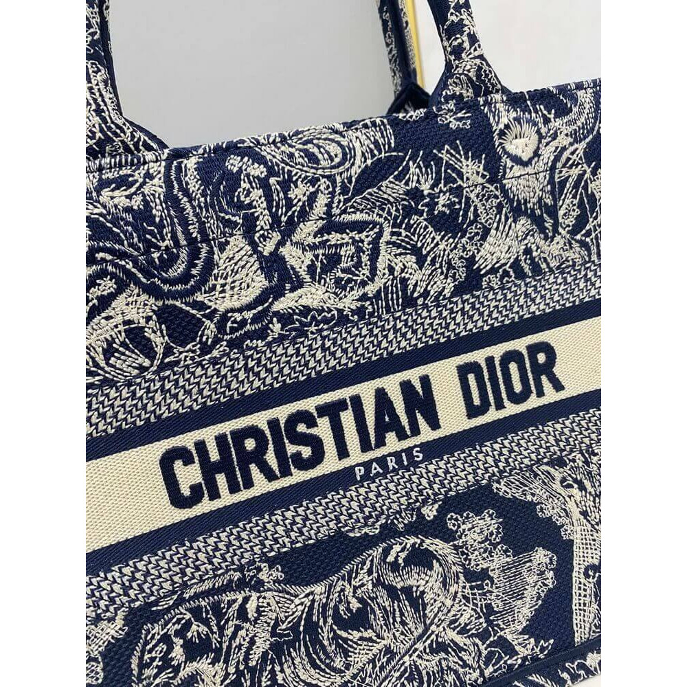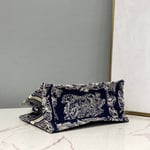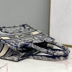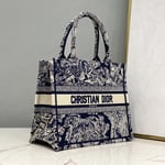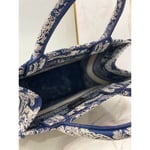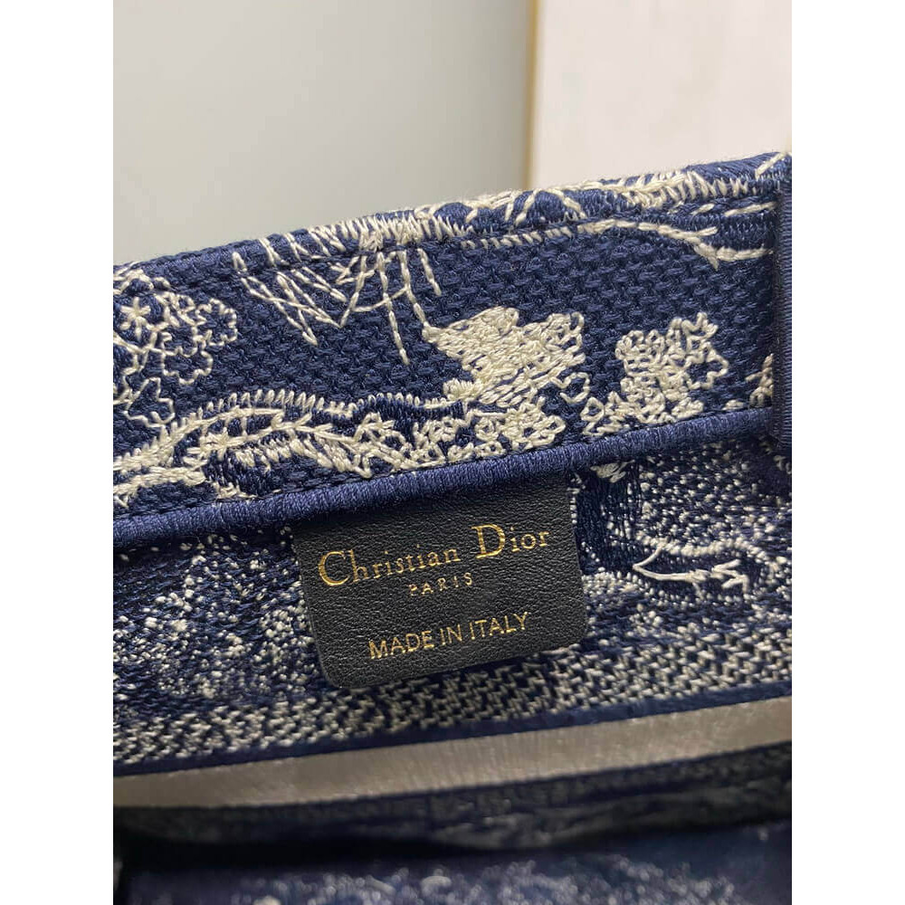 Introduced by Maria Grazia Chiuri, Creative Director of Christian Dior, the Dior Book Tote has become a staple of the Dior aesthetic. Designed to hold all the daily essentials, the style has been fully embroidered with a blue Toile de Jouy Reverse motif, a variation of the House’s hallmark pattern with a play on reversed colors. Adorned with the ‘CHRISTIAN DIOR PARIS’ signature on the front, the small tote exemplifies the House’s signature savoir-faire and may be carried by hand.