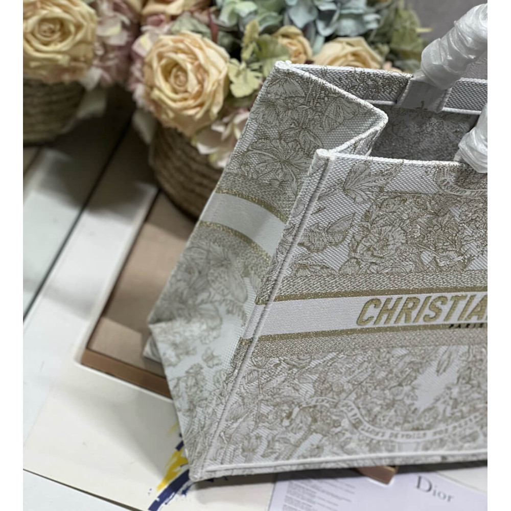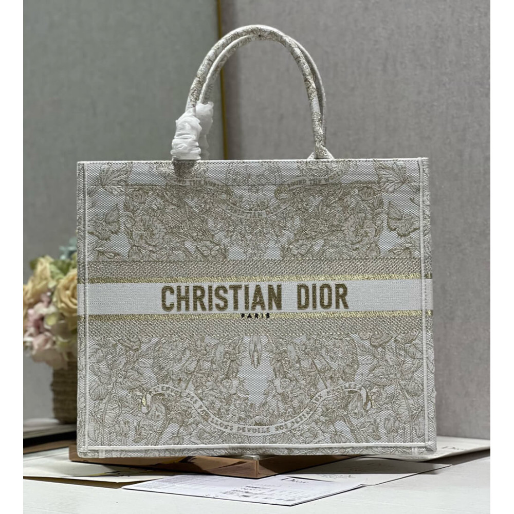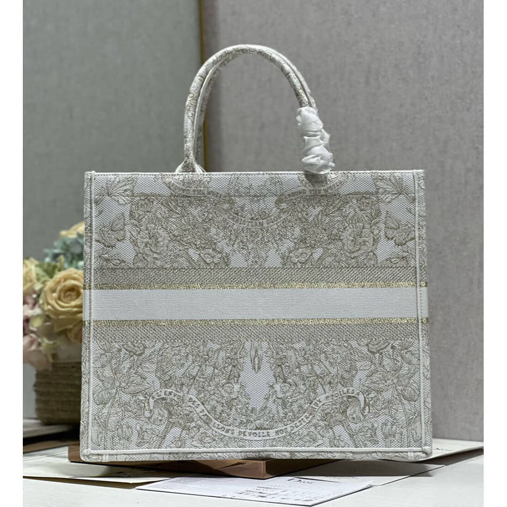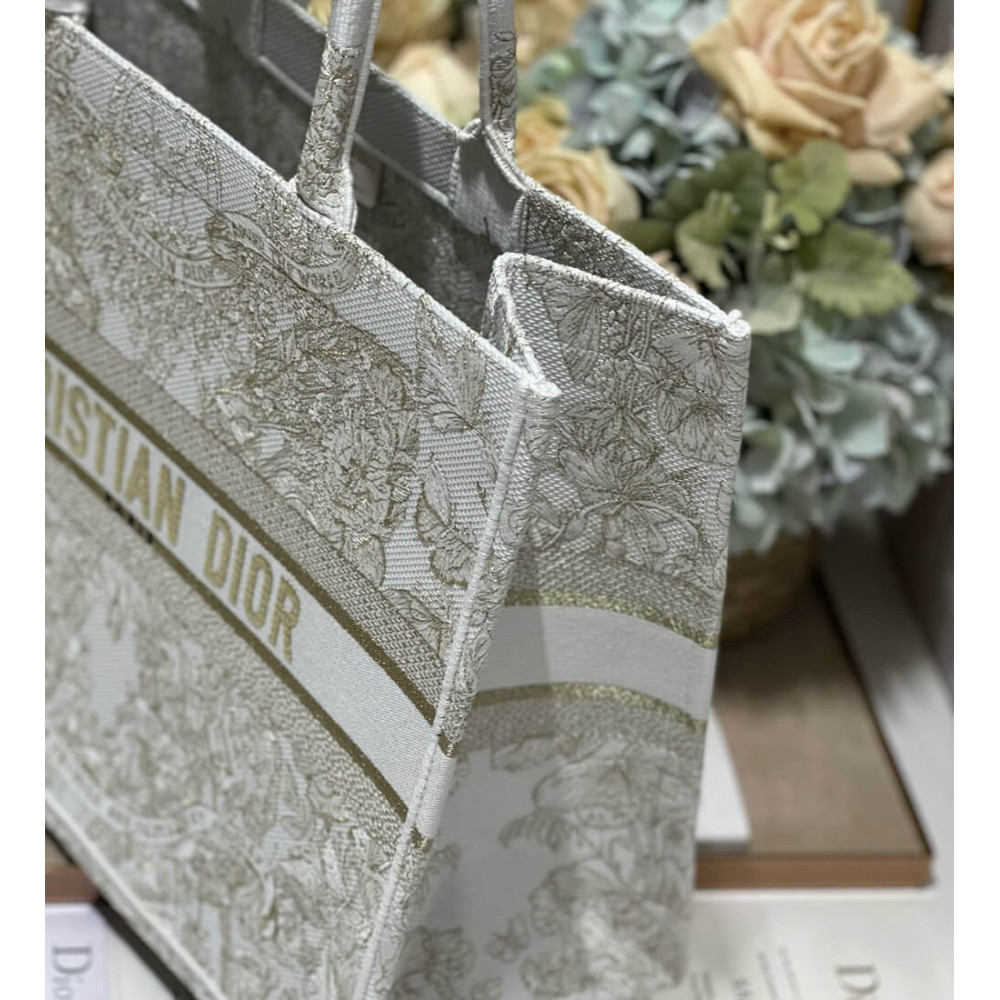 Dior Book Tote Gold-Tone and White Butterfly Around The World Embroidery