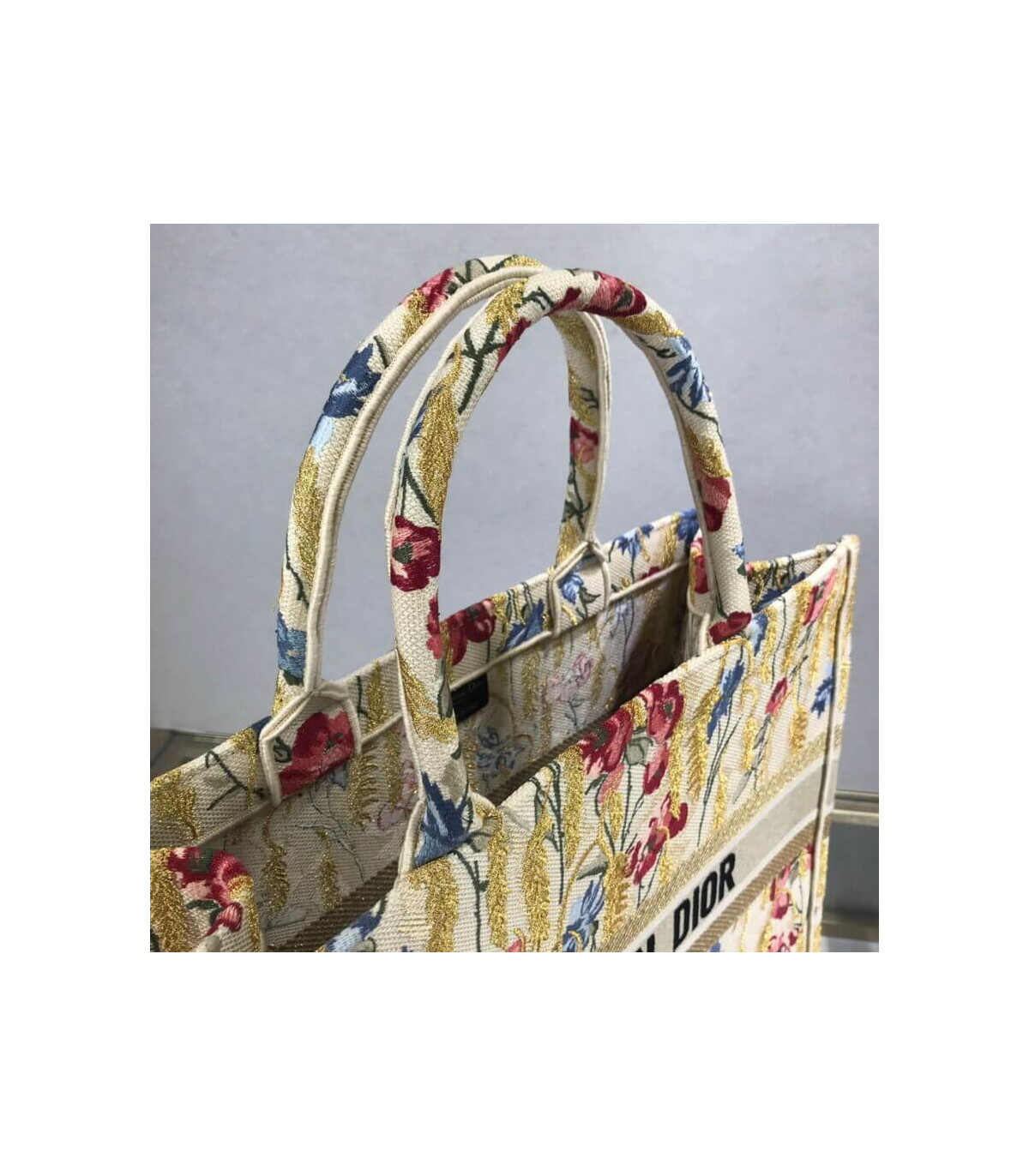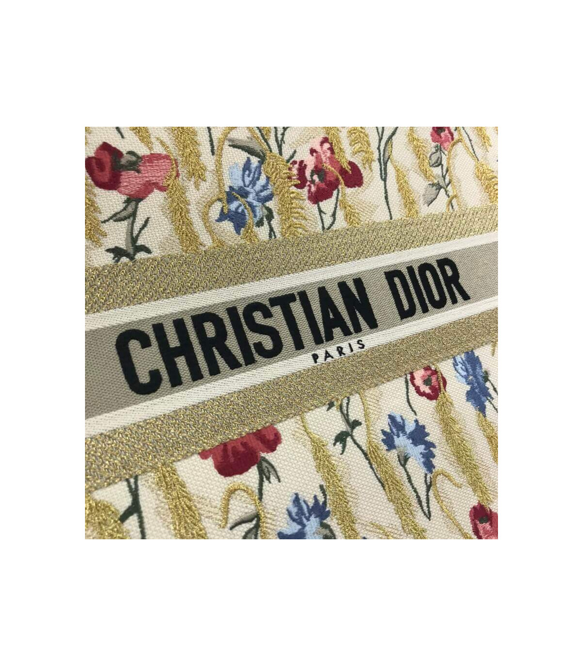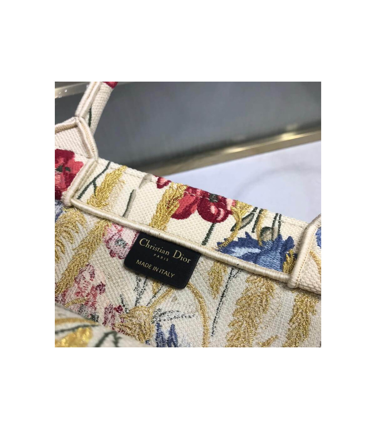 Dior Book Tote in Beige Multicolor Hibiscus Metallic Thread Embroidery