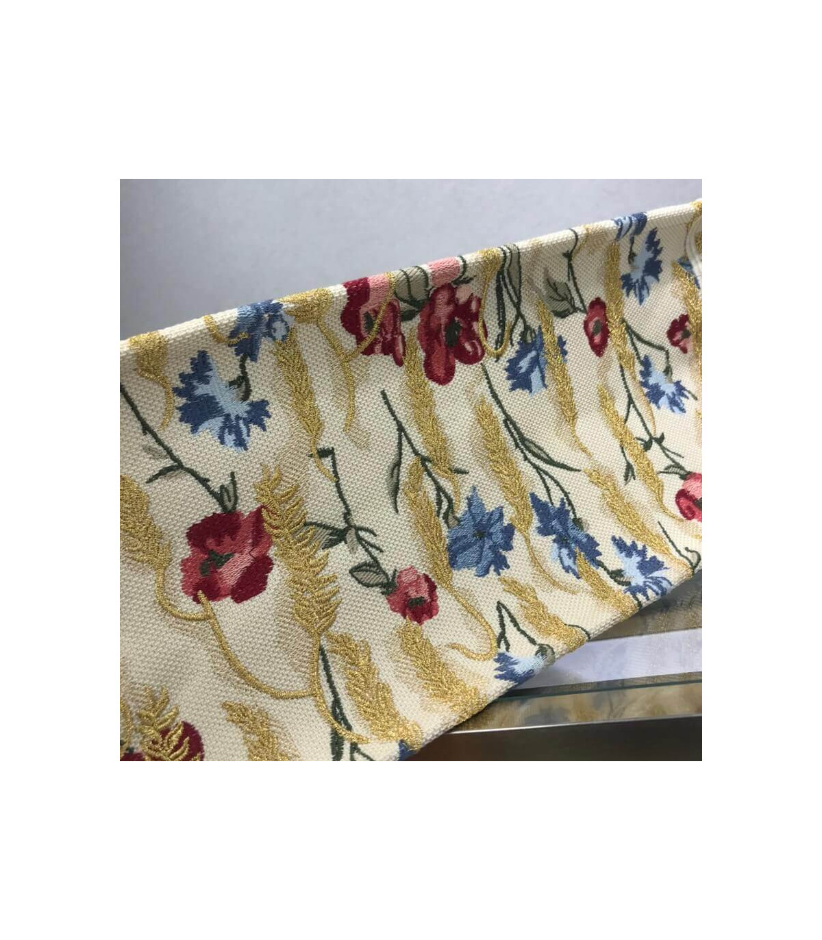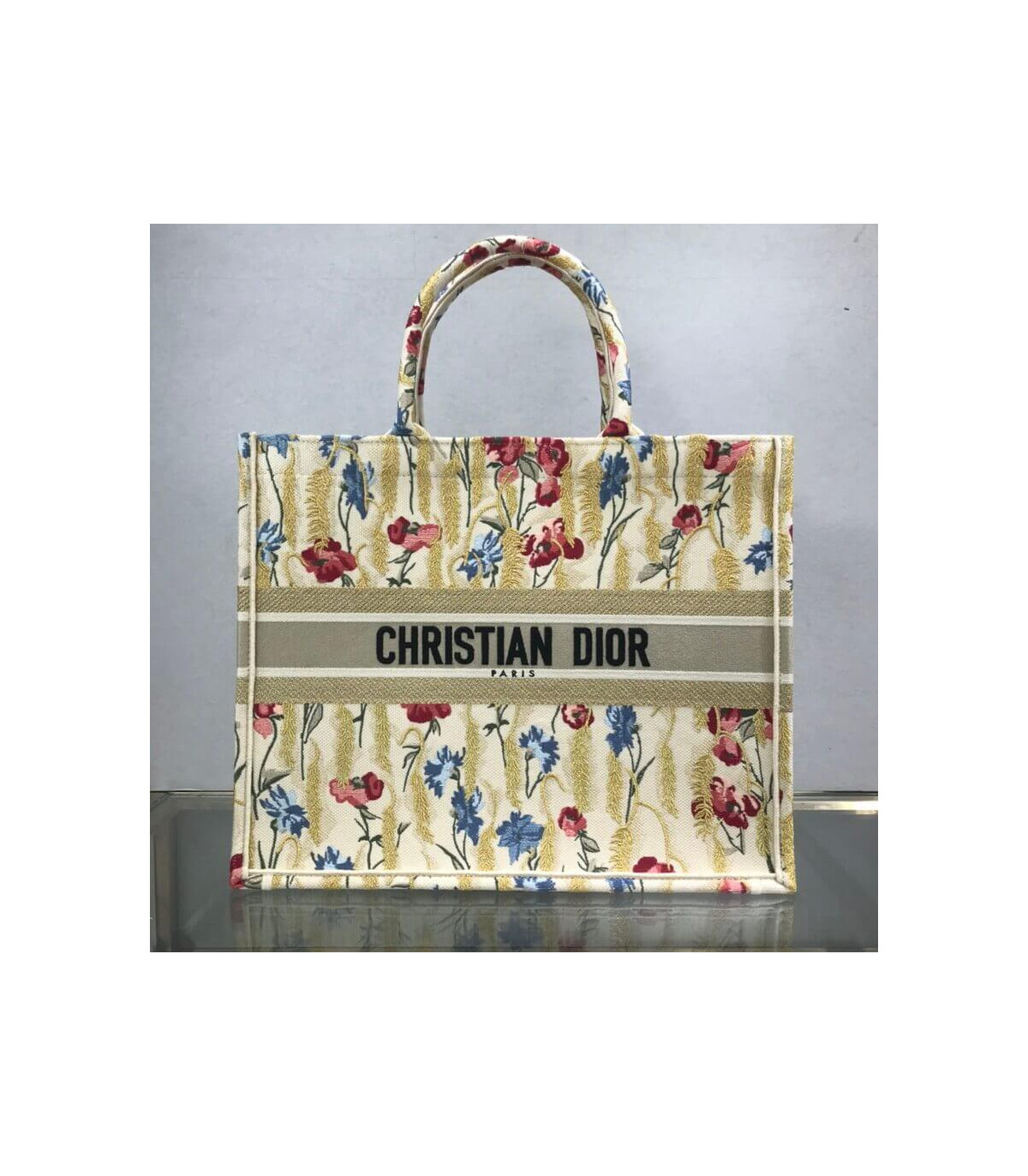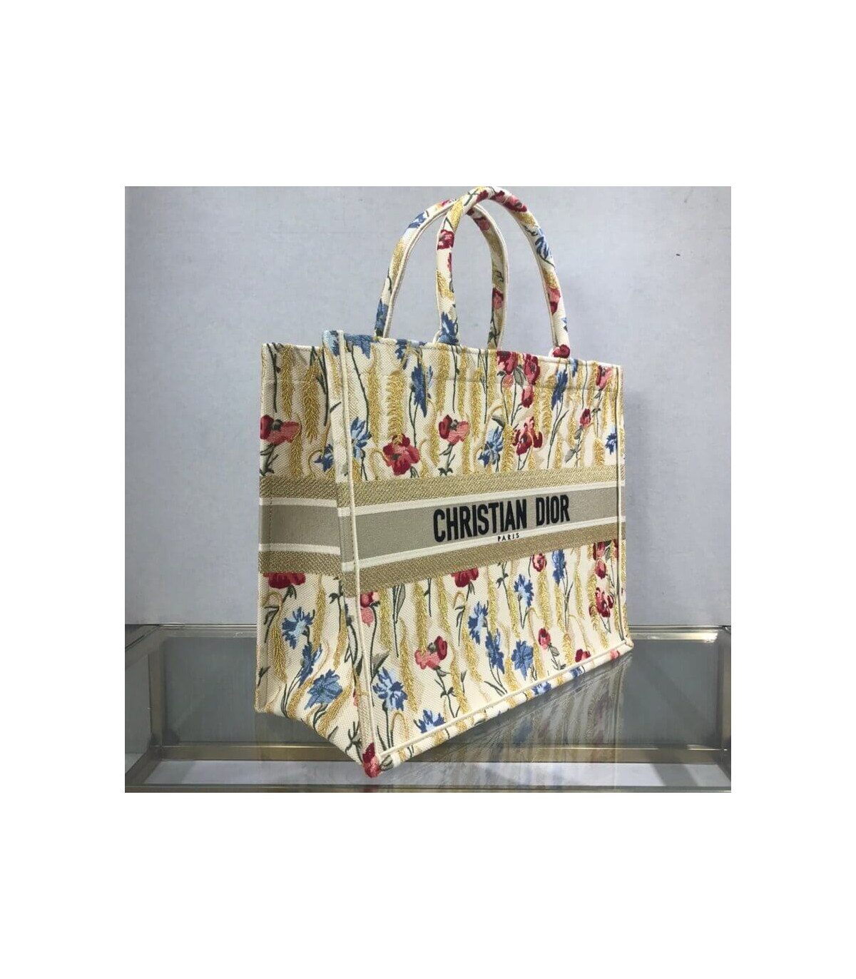 Dior Book Tote in Beige Multicolor Hibiscus Metallic Thread Embroidery