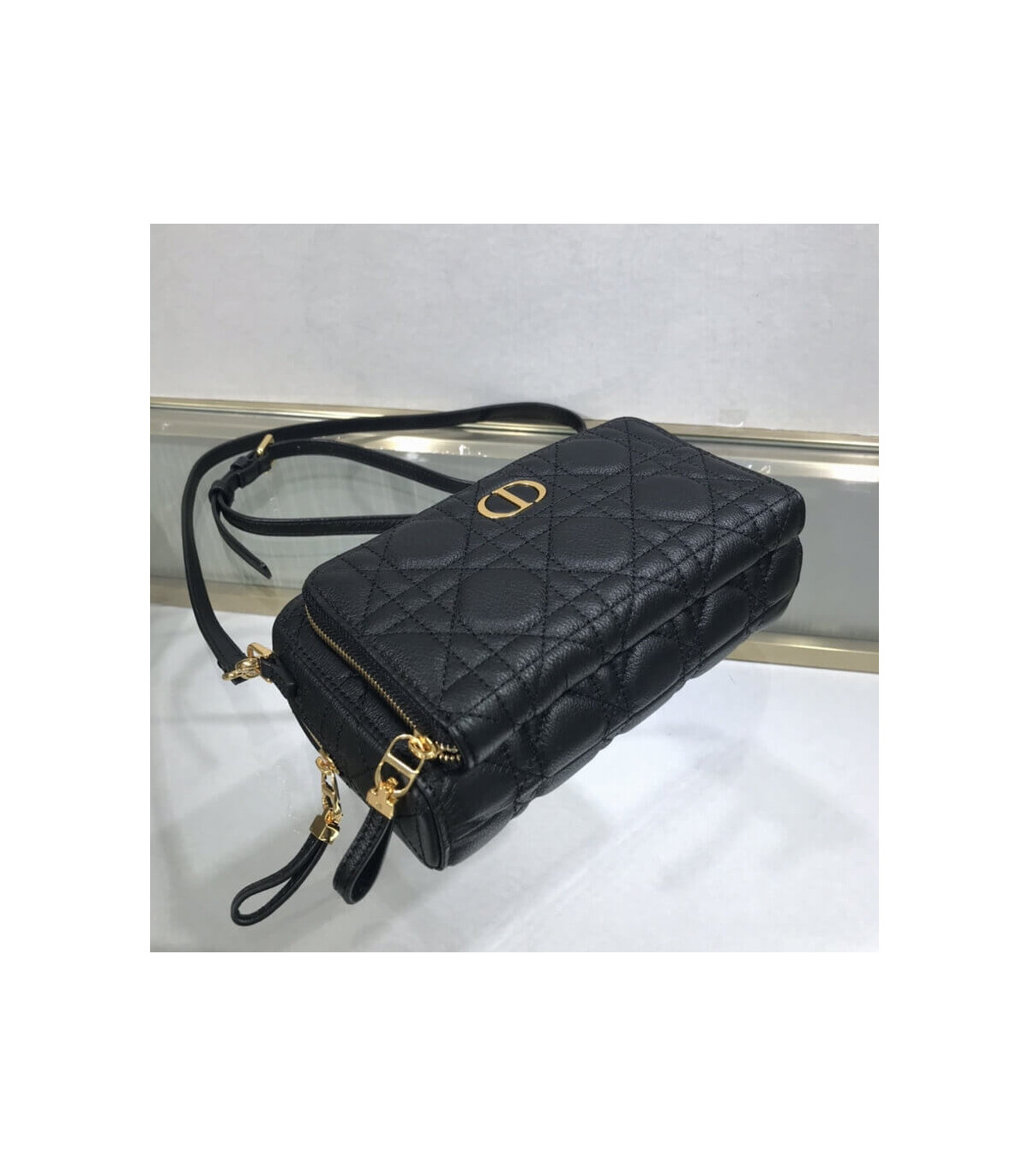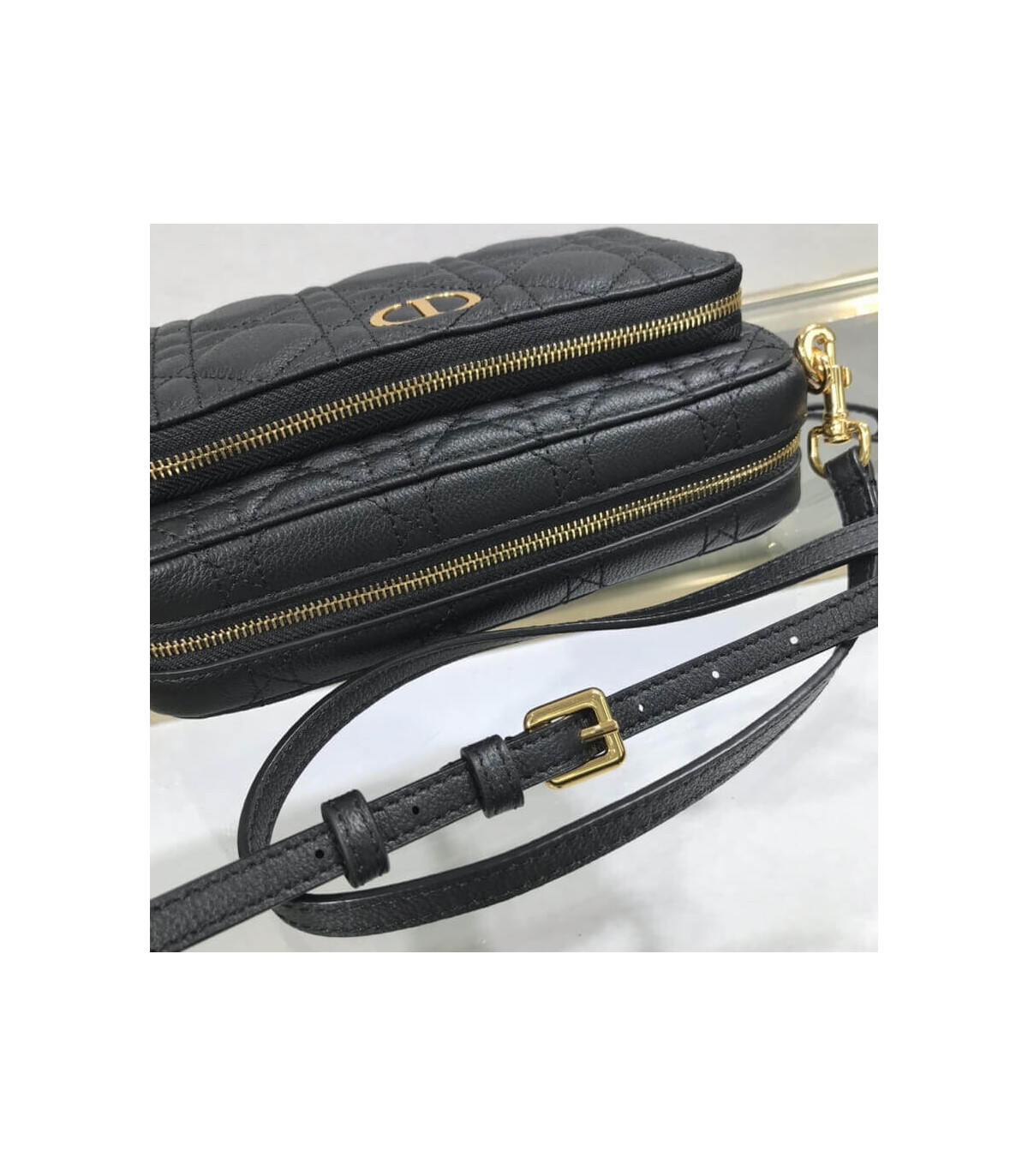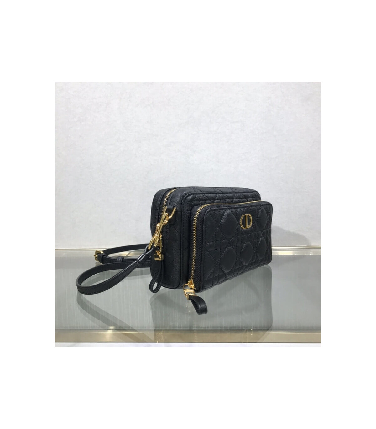 The Dior Caro double pouch, both spacious and compact, is ideal for daily life. Crafted in black calfskin, it is embellished with hallmark Cannage topstitching and features two large compartments, a zipped pocket and two card slots to hold all the essentials. The removable and adjustable strap allows it to be carried by hand, worn over the shoulder or crossbody.