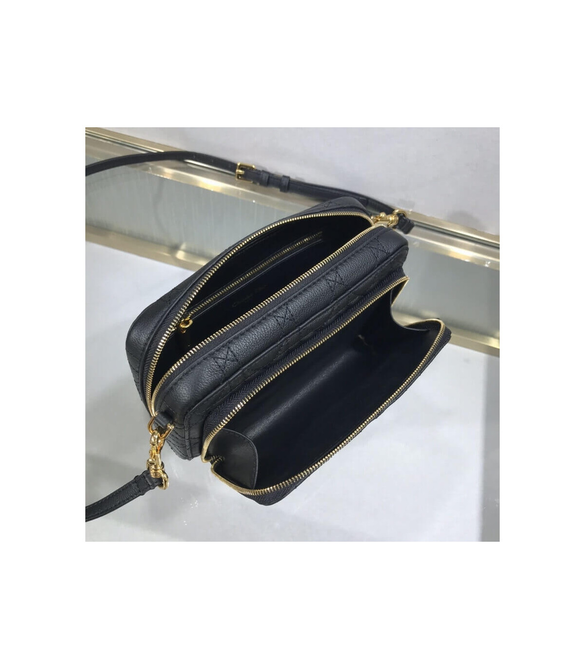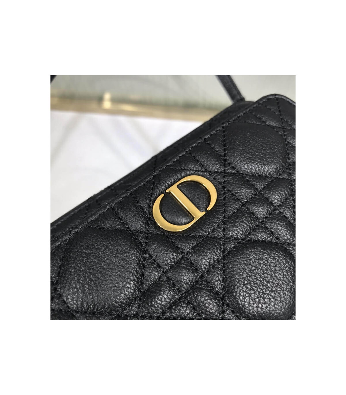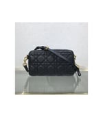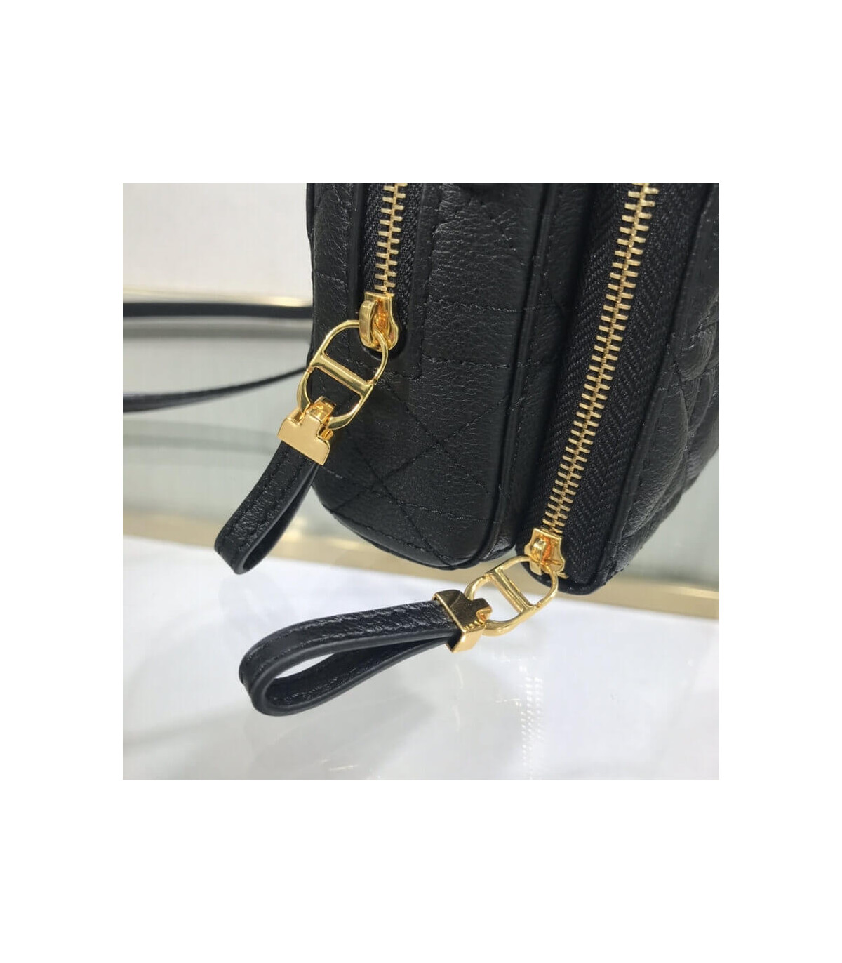 The Dior Caro double pouch, both spacious and compact, is ideal for daily life. Crafted in black calfskin, it is embellished with hallmark Cannage topstitching and features two large compartments, a zipped pocket and two card slots to hold all the essentials. The removable and adjustable strap allows it to be carried by hand, worn over the shoulder or crossbody.