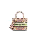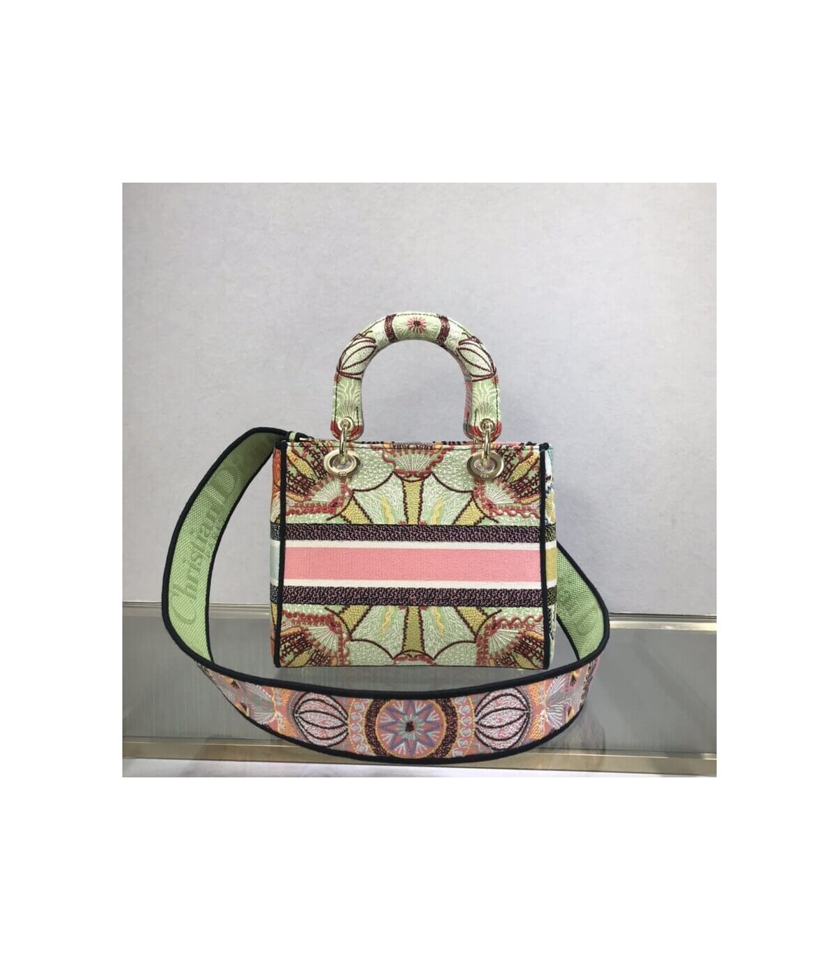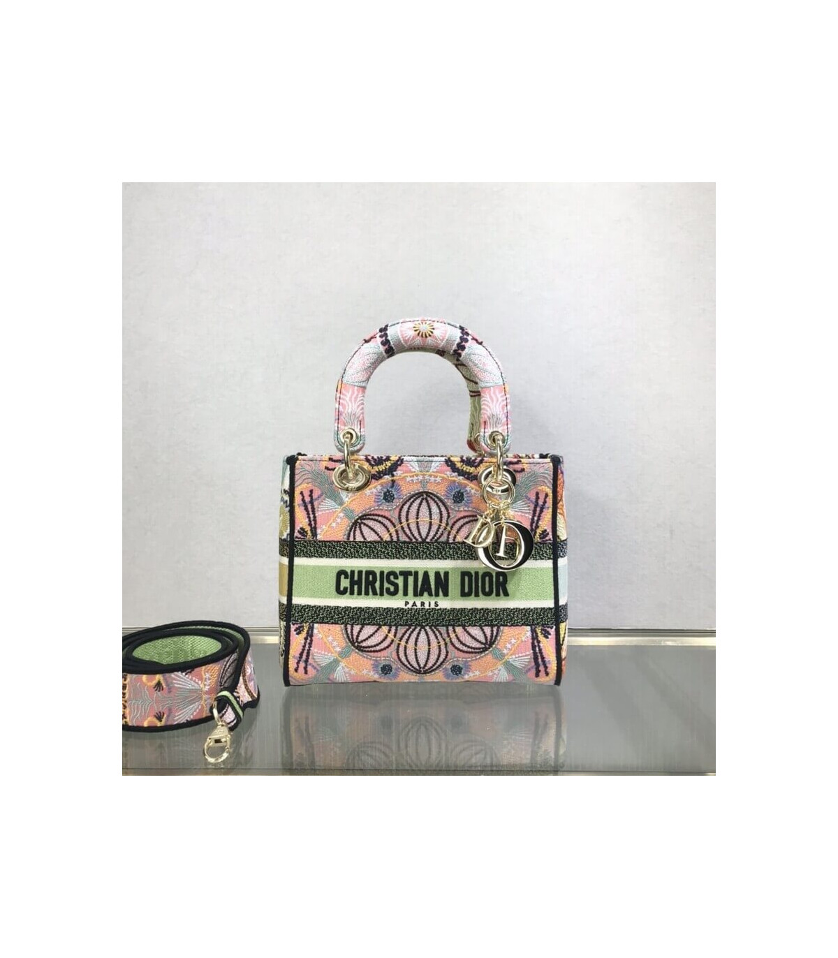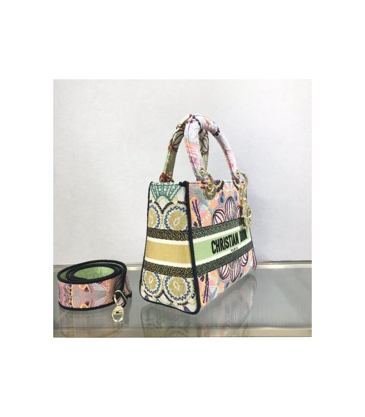The Lady D-Lite bag combines classic elegance with the modernity of the House. This style, fully embroidered with the graphic Dior In Lights motif, is inspired by the light festivals in the south of Italy. Each of the four sides showcases a different color for a patchwork-like look. Featuring a ‘Christian Dior’ signature on the front and thick pale gold-finish metal ‘D.I.O.R.’ charms, it is equipped with a wide, reversible and removable embroidered shoulder strap. The medium bag can be carried by hand, worn over the shoulder or crossbody and pairs easily with other matching Dior In Lights creations of the season.
