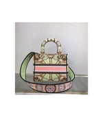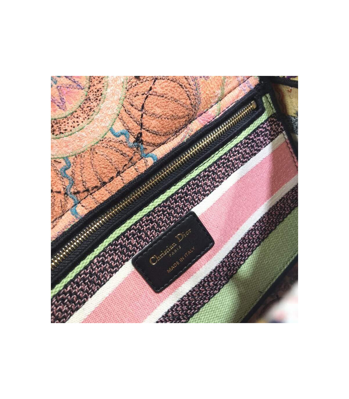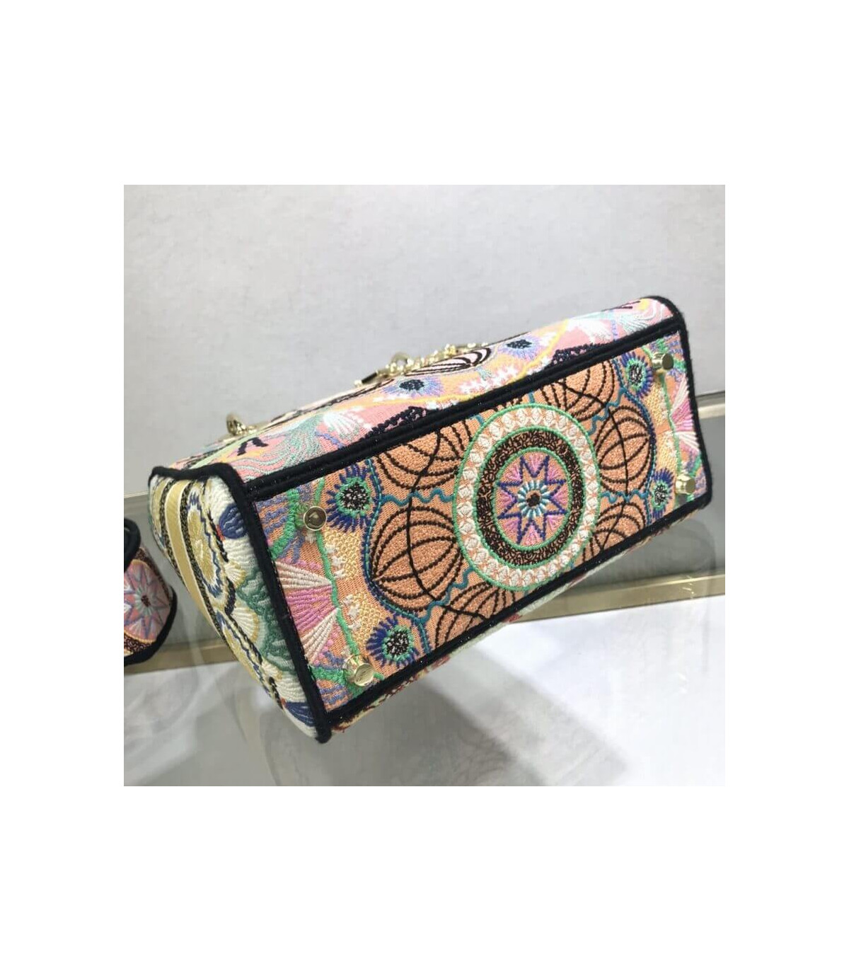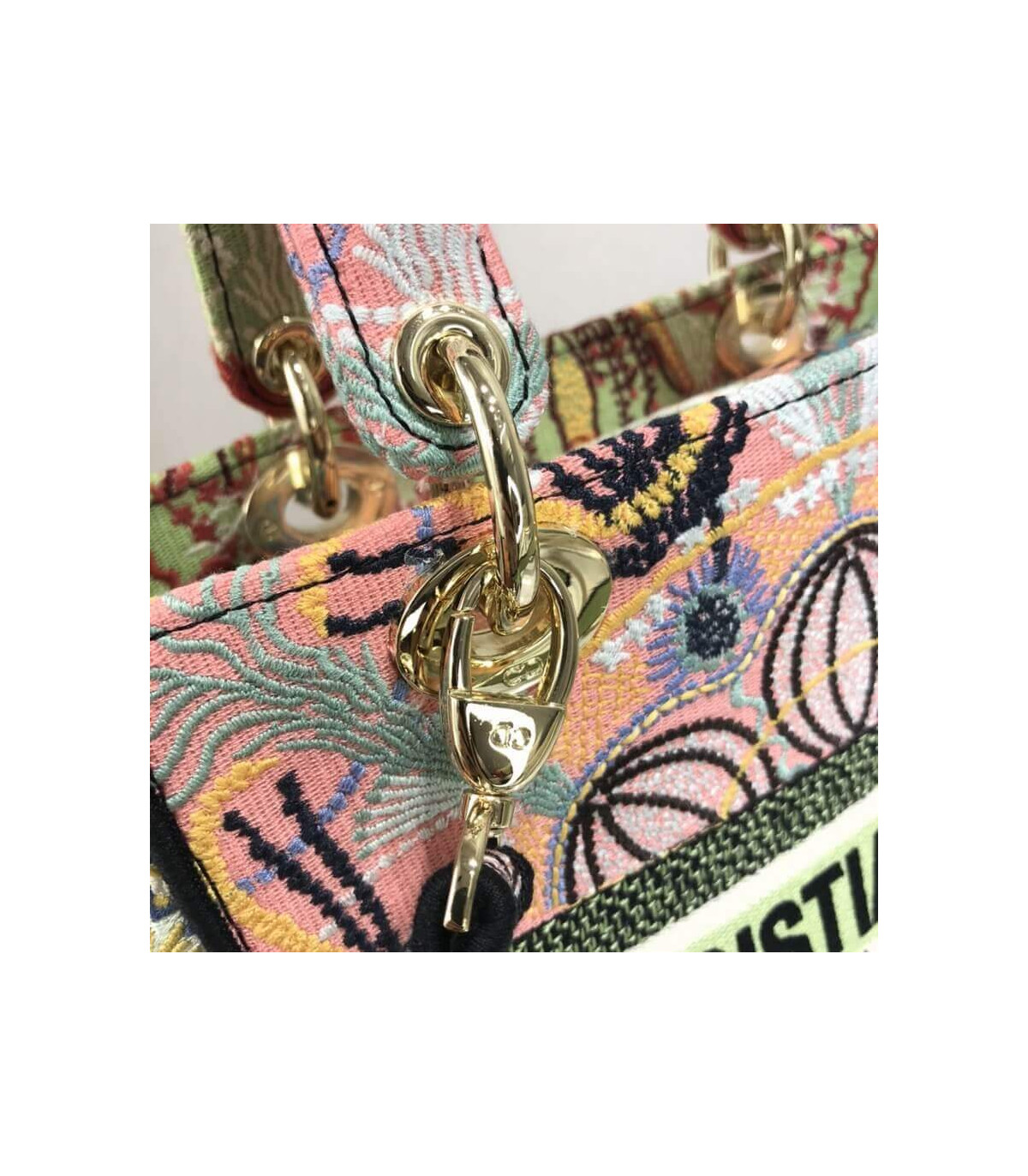 The Lady D-Lite bag combines classic elegance with the modernity of the House. This style, fully embroidered with the graphic Dior In Lights motif, is inspired by the light festivals in the south of Italy. Each of the four sides showcases a different color for a patchwork-like look. Featuring a ‘Christian Dior’ signature on the front and thick pale gold-finish metal ‘D.I.O.R.’ charms, it is equipped with a wide, reversible and removable embroidered shoulder strap. The medium bag can be carried by hand, worn over the shoulder or crossbody and pairs easily with other matching Dior In Lights creations of the season.