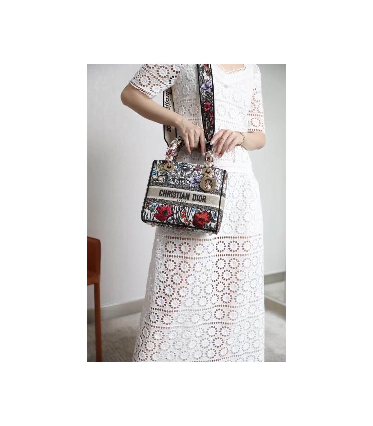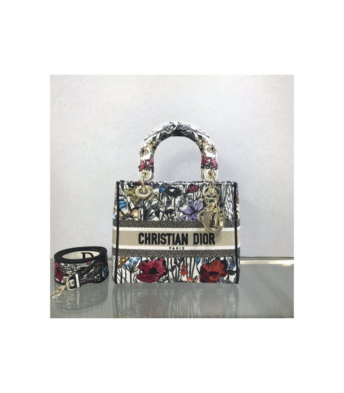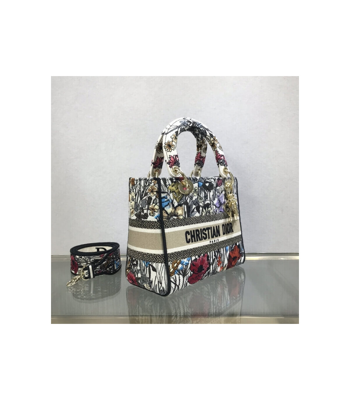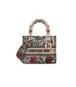 The Lady D-Lite bag combines classic elegance with the modernity of the House. The lightweight silhouette is embroidered with the Mille Fleurs motif which, inspired by bucolic Apulian landscapes, is a central theme of the collection. Featuring the ‘Christian Dior’ signature on the front along with the thick pale gold-finish metal ‘D.I.O.R.’ charms, it is equipped with a wide, reversible and removable embroidered shoulder strap. The medium bag can be carried by hand, worn over the shoulder or crossbody and can be paired with other Mille Fleurs creations of the season.