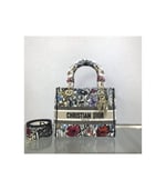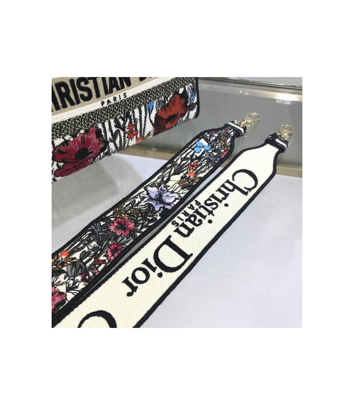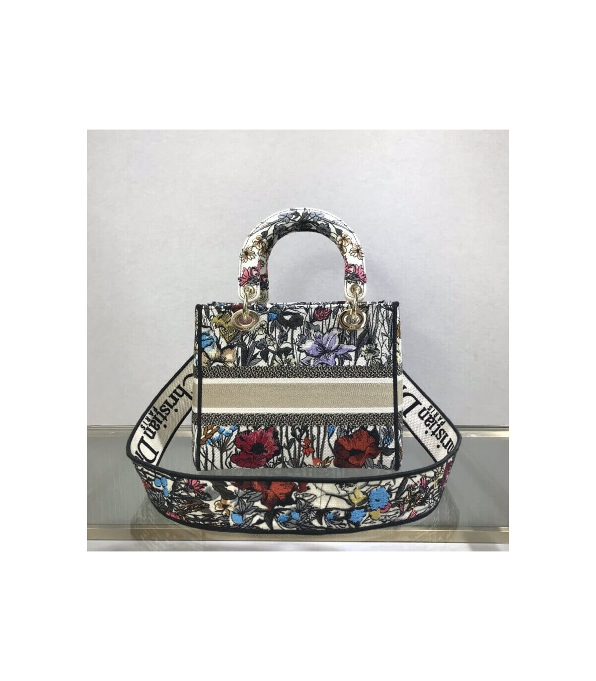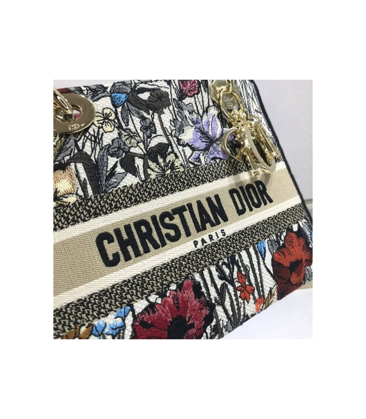 The Lady D-Lite bag combines classic elegance with the modernity of the House. The lightweight silhouette is embroidered with the Mille Fleurs motif which, inspired by bucolic Apulian landscapes, is a central theme of the collection. Featuring the ‘Christian Dior’ signature on the front along with the thick pale gold-finish metal ‘D.I.O.R.’ charms, it is equipped with a wide, reversible and removable embroidered shoulder strap. The medium bag can be carried by hand, worn over the shoulder or crossbody and can be paired with other Mille Fleurs creations of the season.