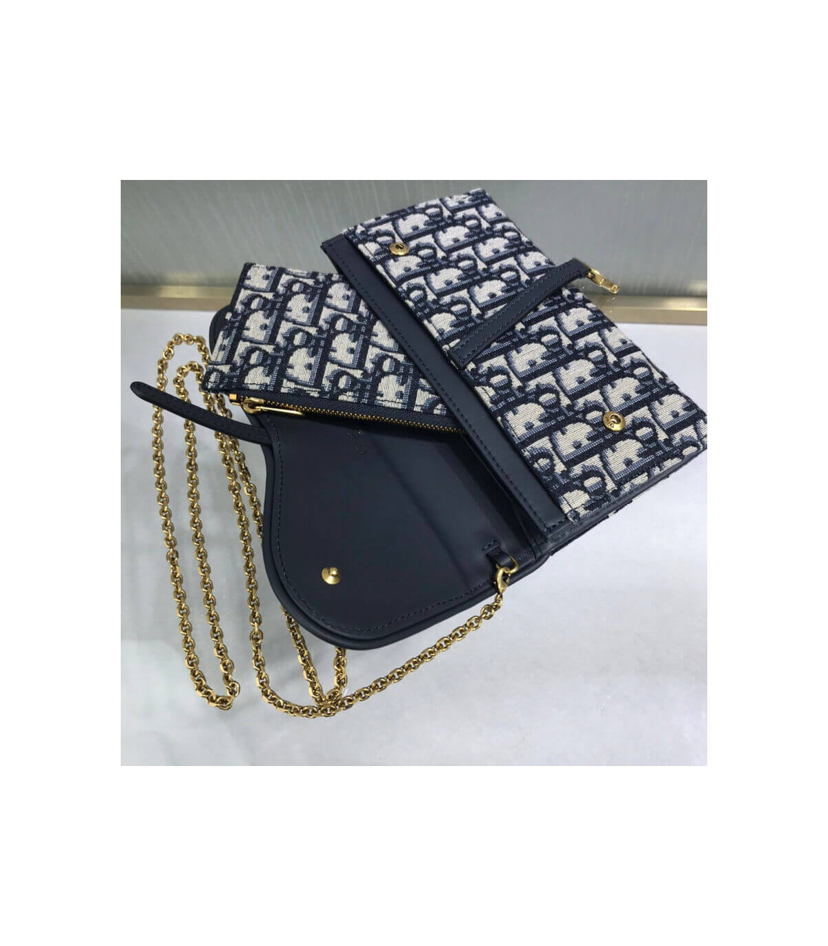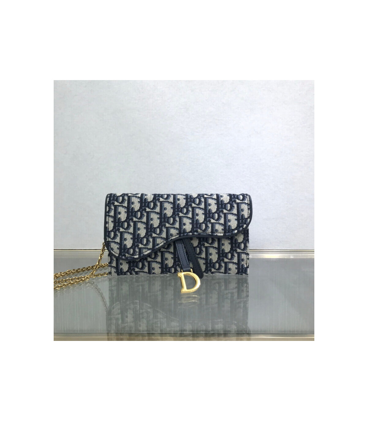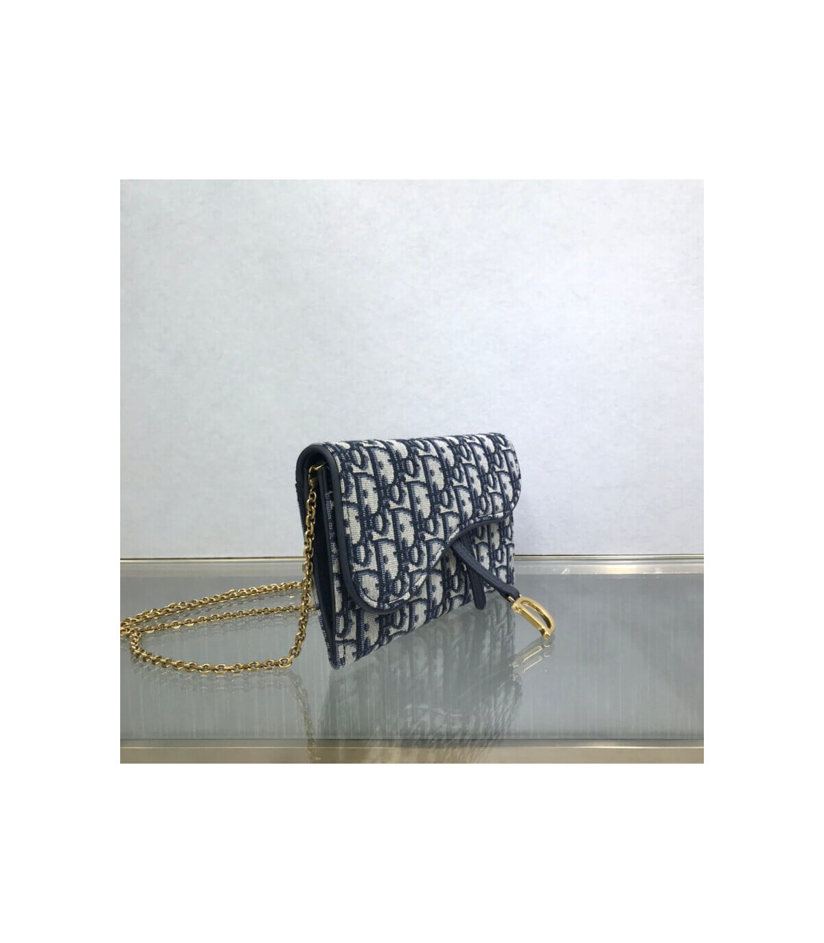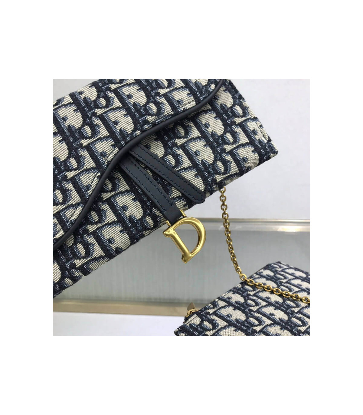 The Saddle wallet, crafted in blue Dior Oblique jacquard, is a hybrid item with a modern and streamlined design. The style is?embellished with an asymmetric flap and an antique gold-finish metal ‘D’ stirrup. Thanks to its removable chain, the wallet can be worn over the shoulder, crossbody or carried by hand.