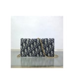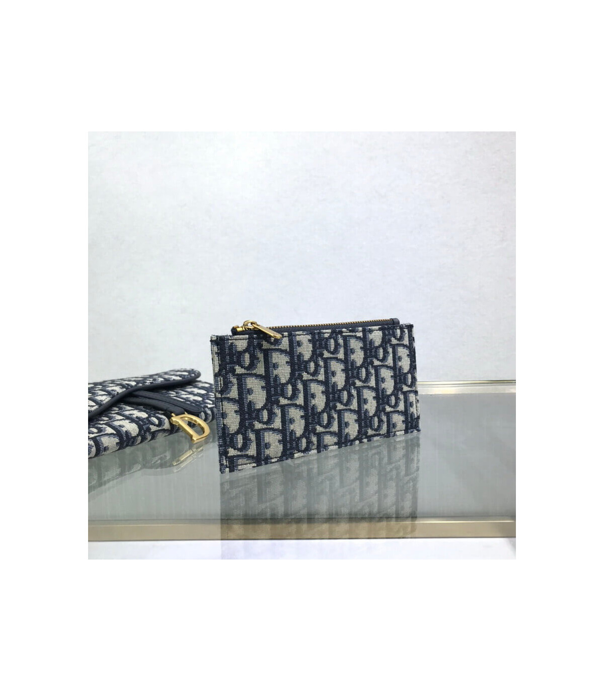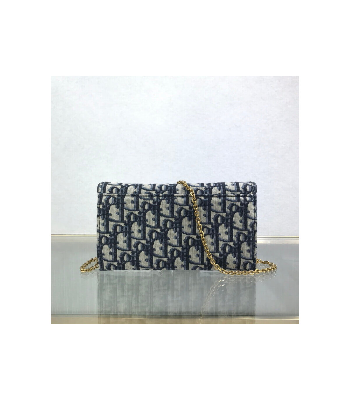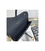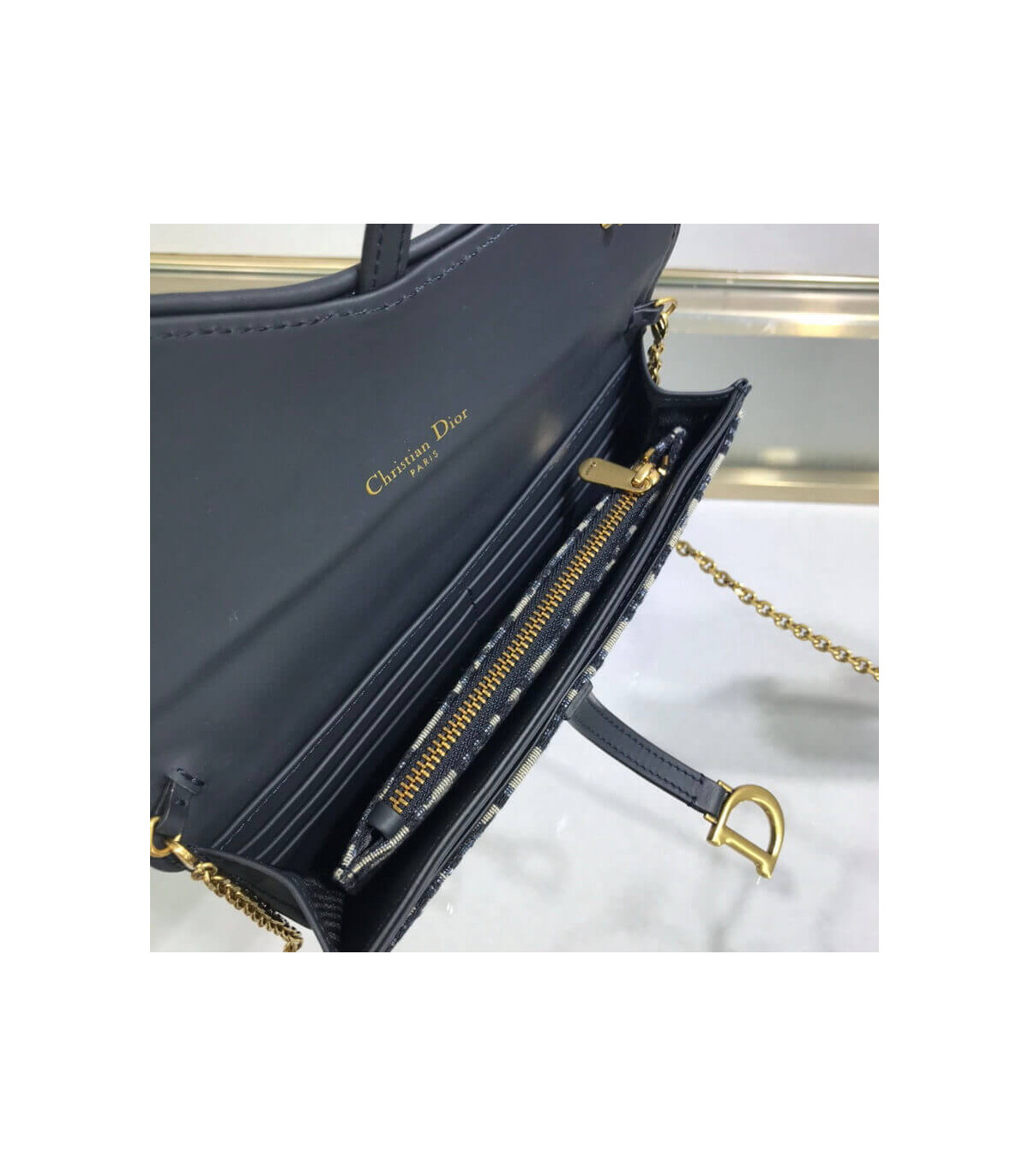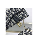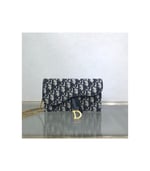 The Saddle wallet, crafted in blue Dior Oblique jacquard, is a hybrid item with a modern and streamlined design. The style is?embellished with an asymmetric flap and an antique gold-finish metal ‘D’ stirrup. Thanks to its removable chain, the wallet can be worn over the shoulder, crossbody or carried by hand.