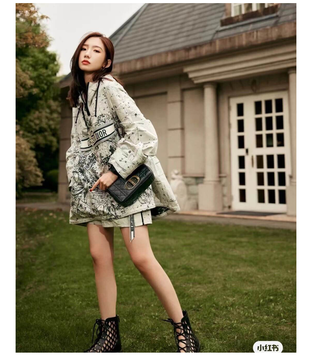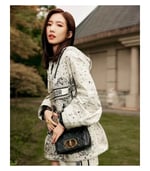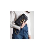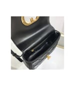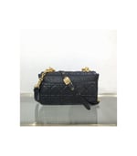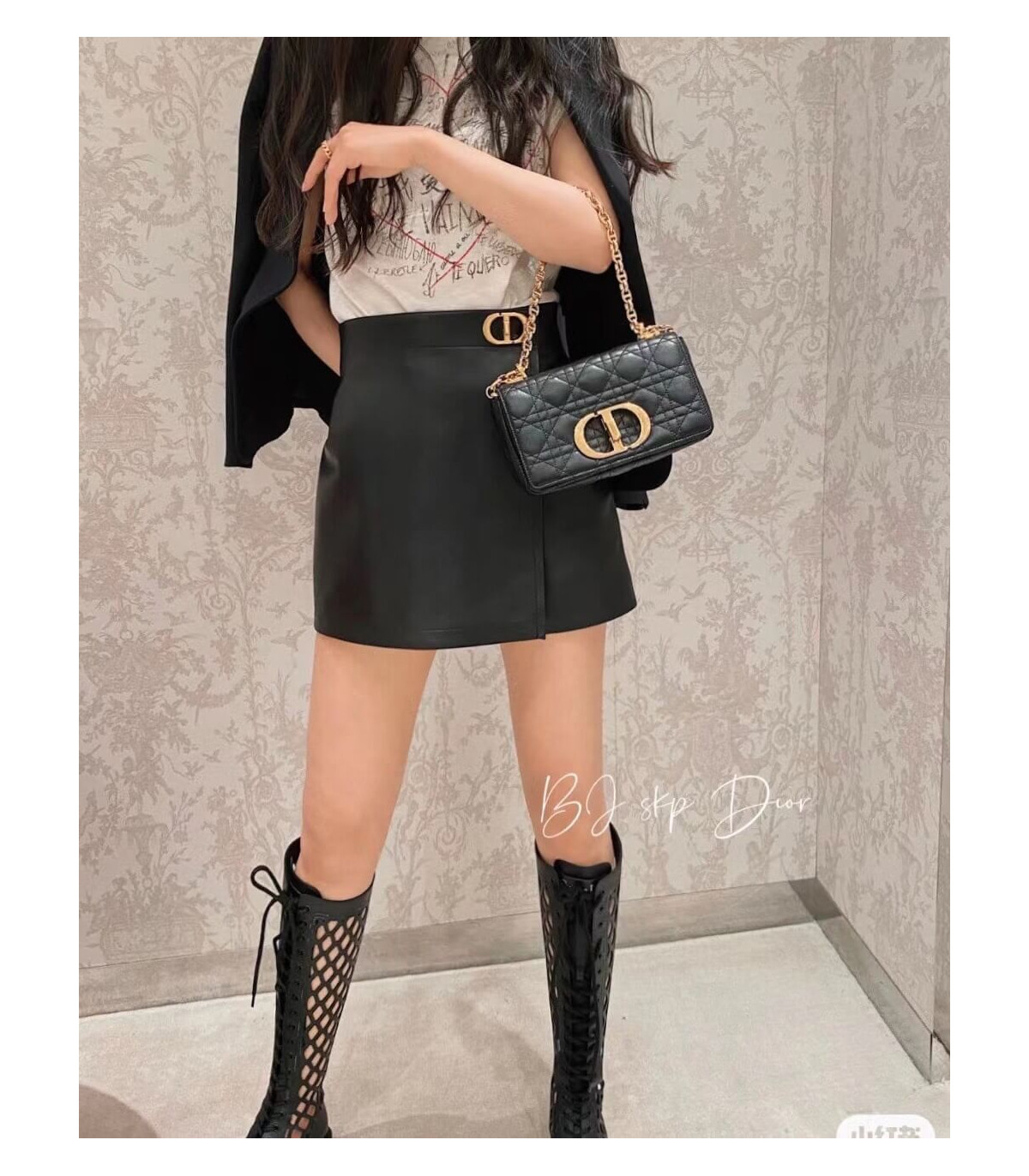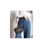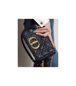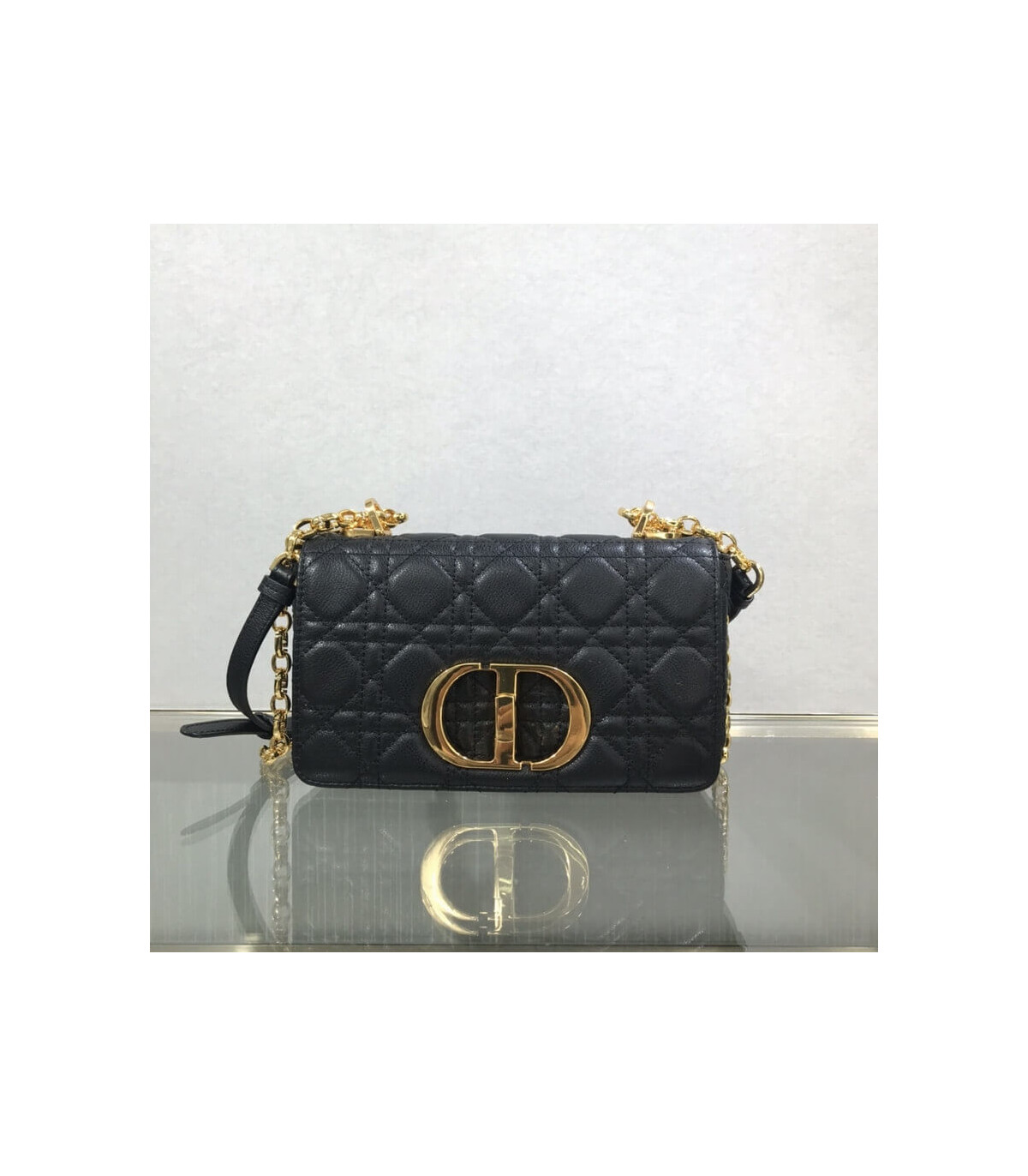 The new Dior Caro bag, in black calfskin, is adorned with the instantly recognizable Cannage stitching. The supple bag features a flap with an antique gold-finish metal twist ‘CD’ clasp, inspired by the seal of a Christian Dior perfume bottle. The removable signature ‘CD’ chain link shoulder strap can be replaced with a wide embroidered strap, allowing the small style to be worn during both the day and the evening for a modern, elegant look.