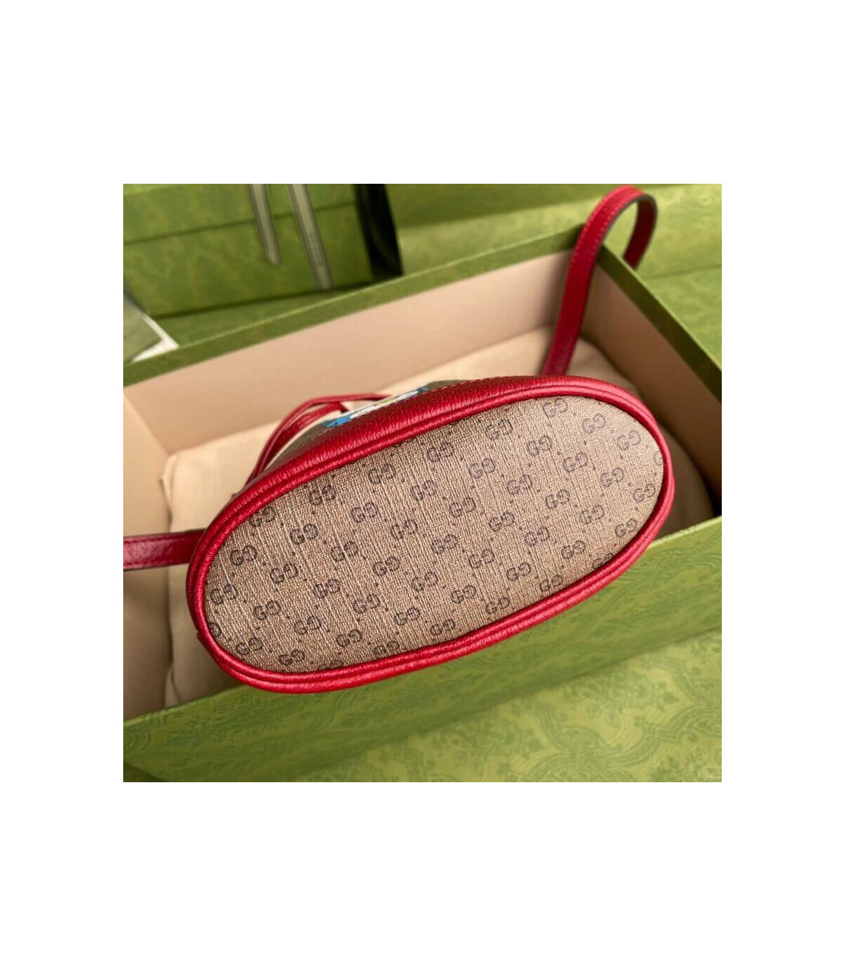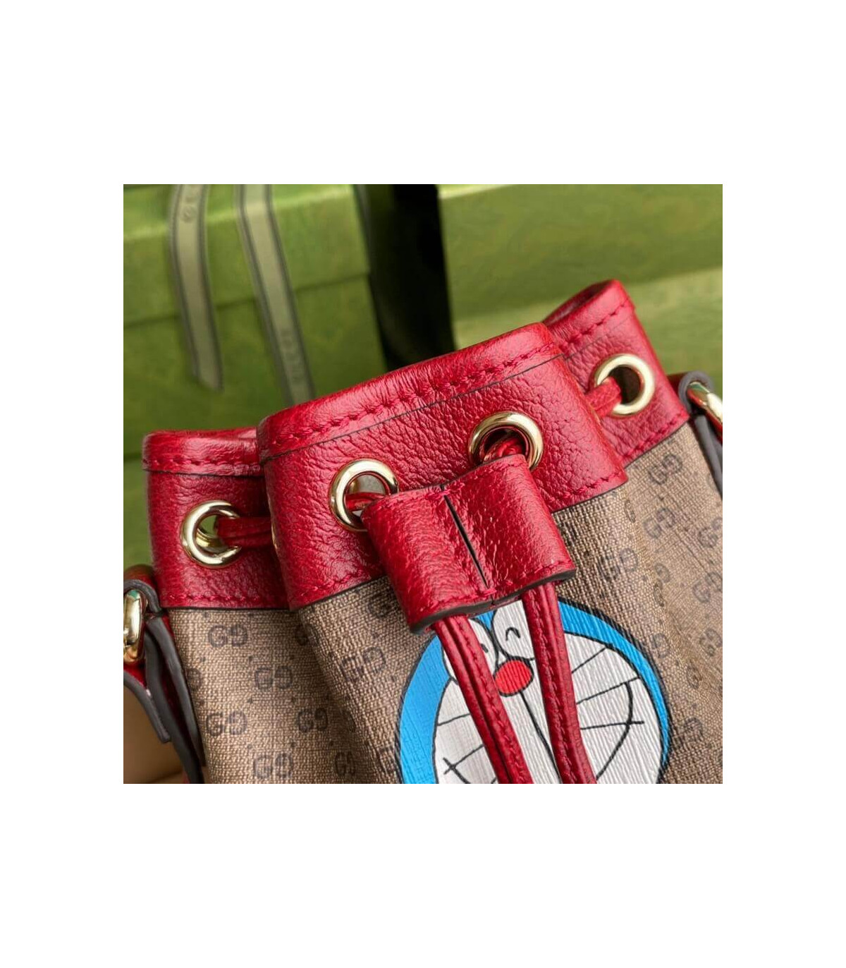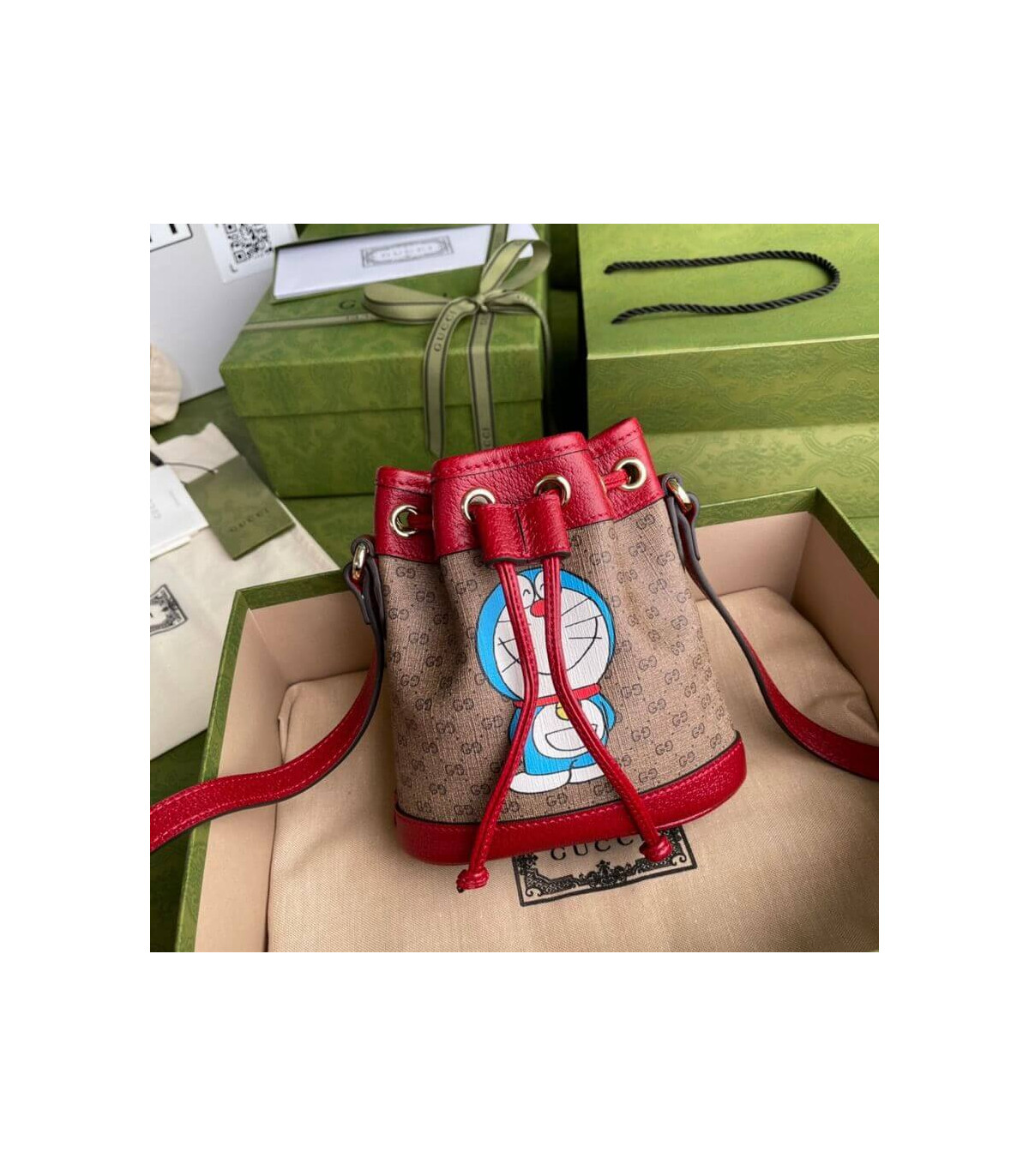 This mini bucket bag is part of a special collaboration between Doraemon and Gucci. Born on September 3rd, 2112, a cat-type robot was sent from the 22nd century to help a young boy called Nobita with secret gadgets from his four-dimensional pouch. A playful character, Doraemon hates mice and loves Dorayaki, a sweet pancake.