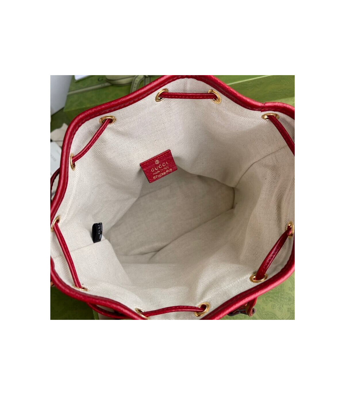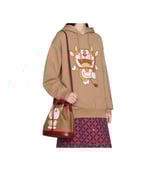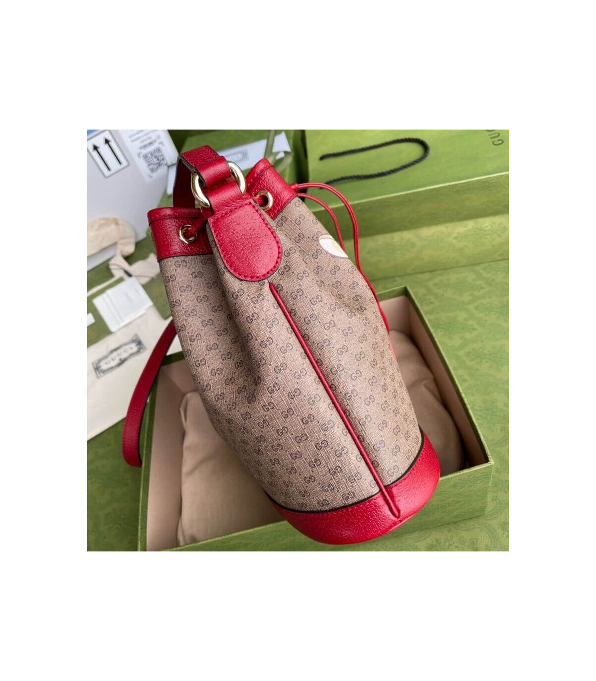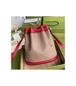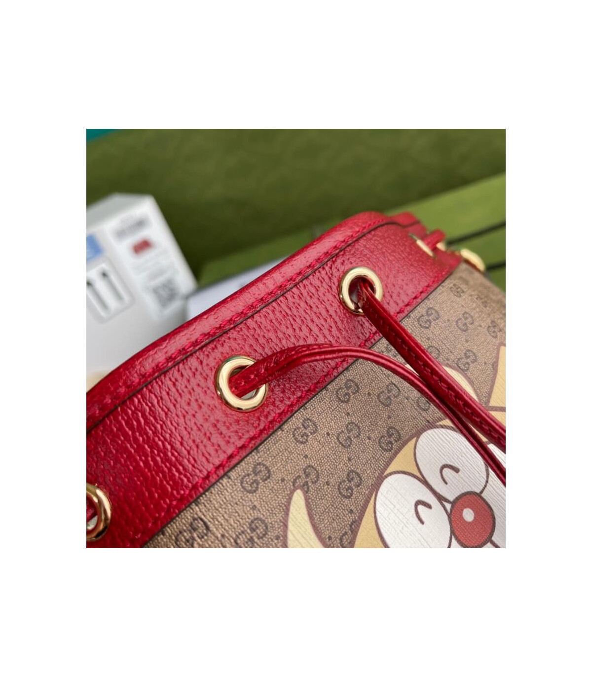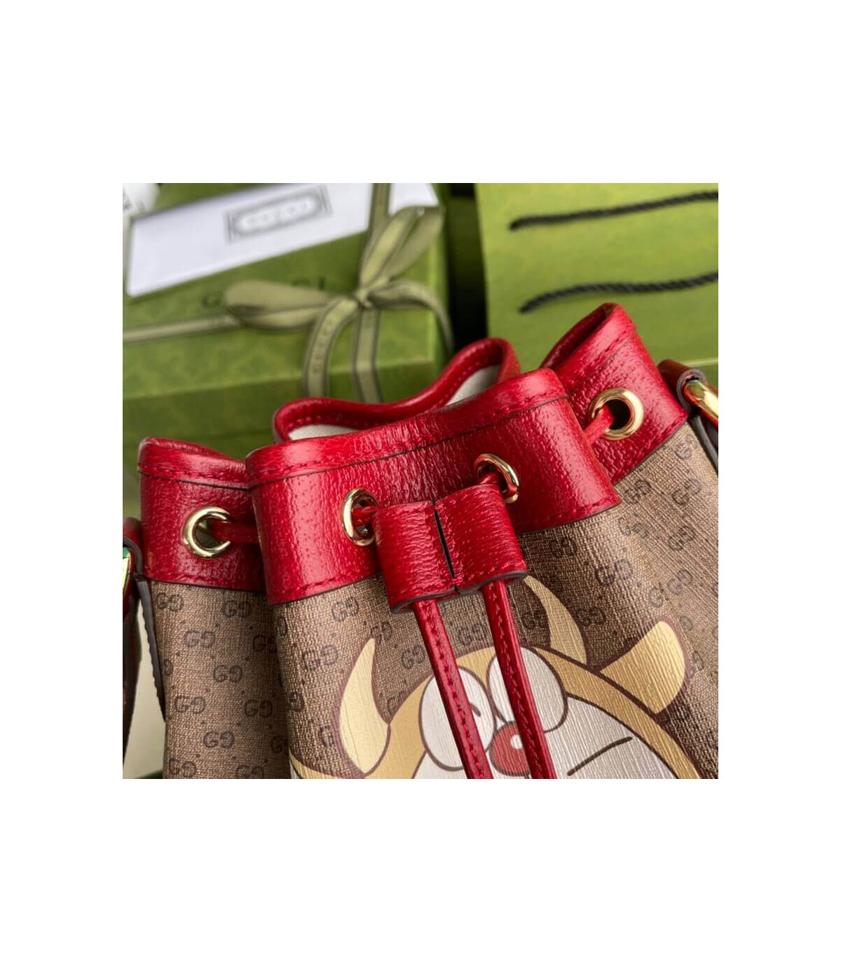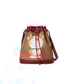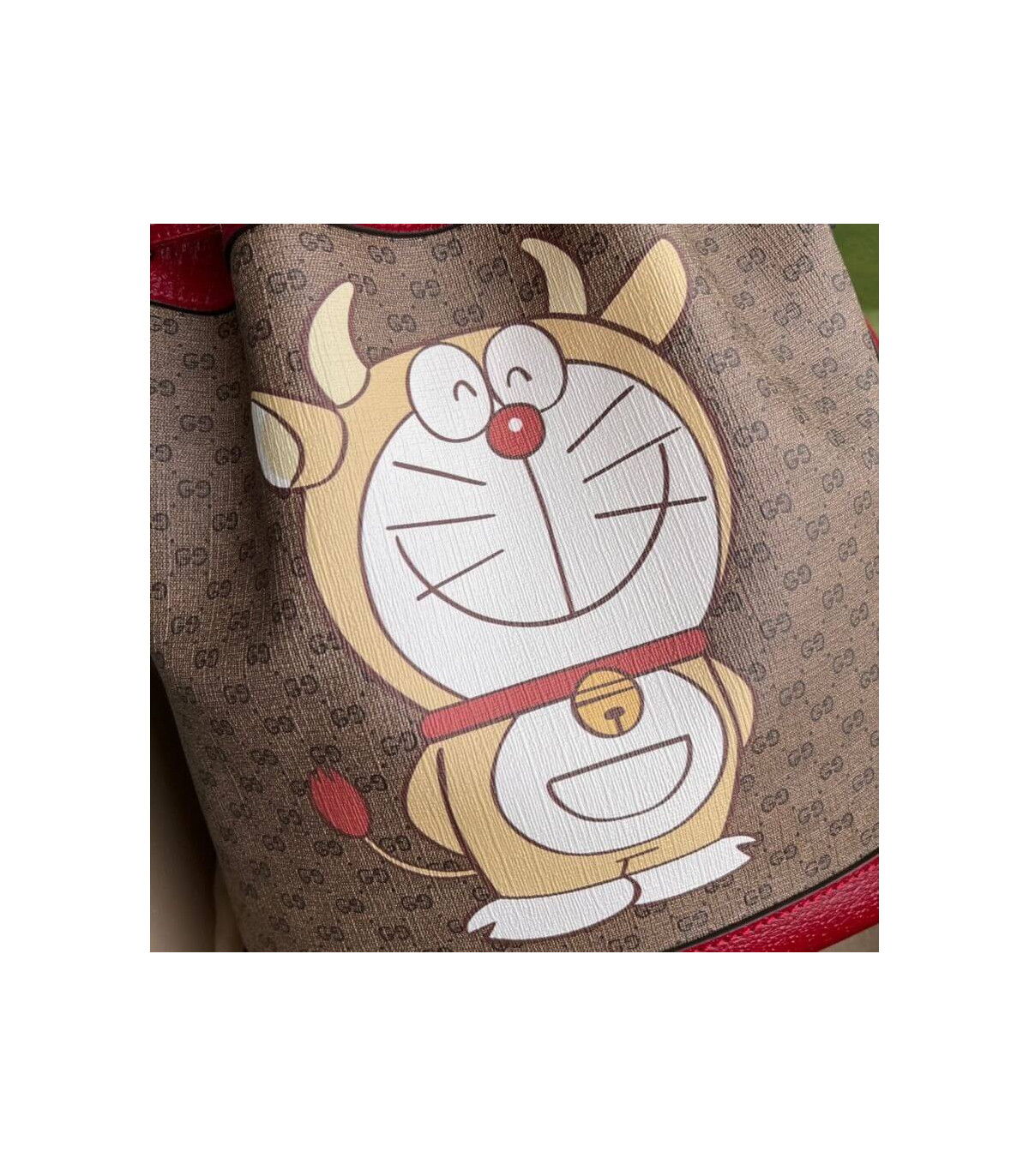 This small bucket bag is part of a special collaboration between Doraemon and Gucci. Born on September 3rd, 2112, a cat-type robot was sent from the 22nd century to help a young boy called Nobita with secret gadgets from his four-dimensional pouch. A playful character, Doraemon hates mice and loves Dorayaki, a sweet pancake.