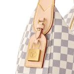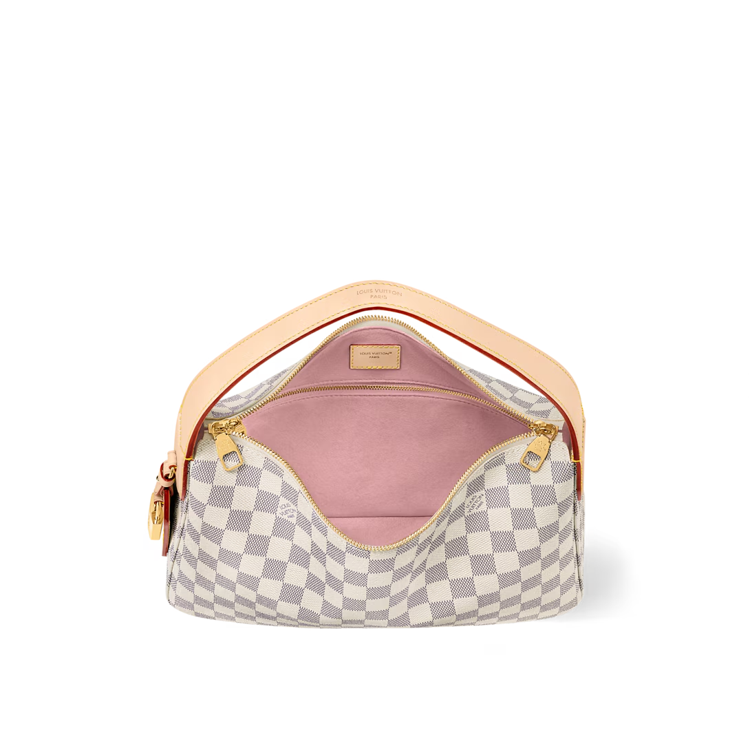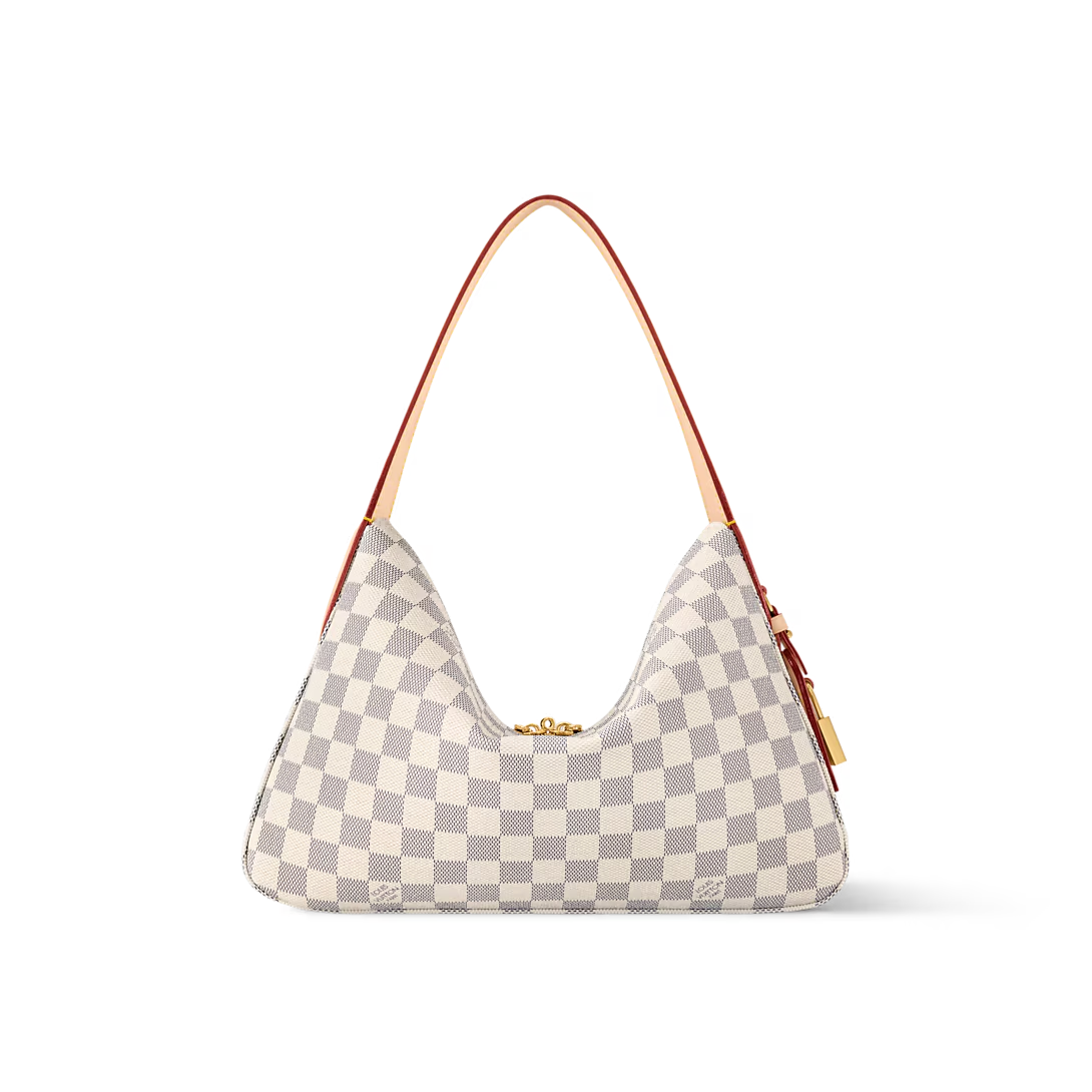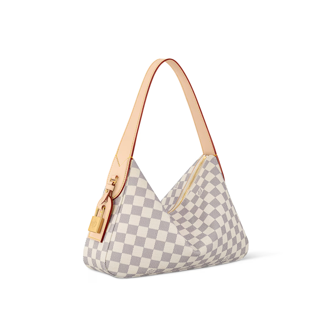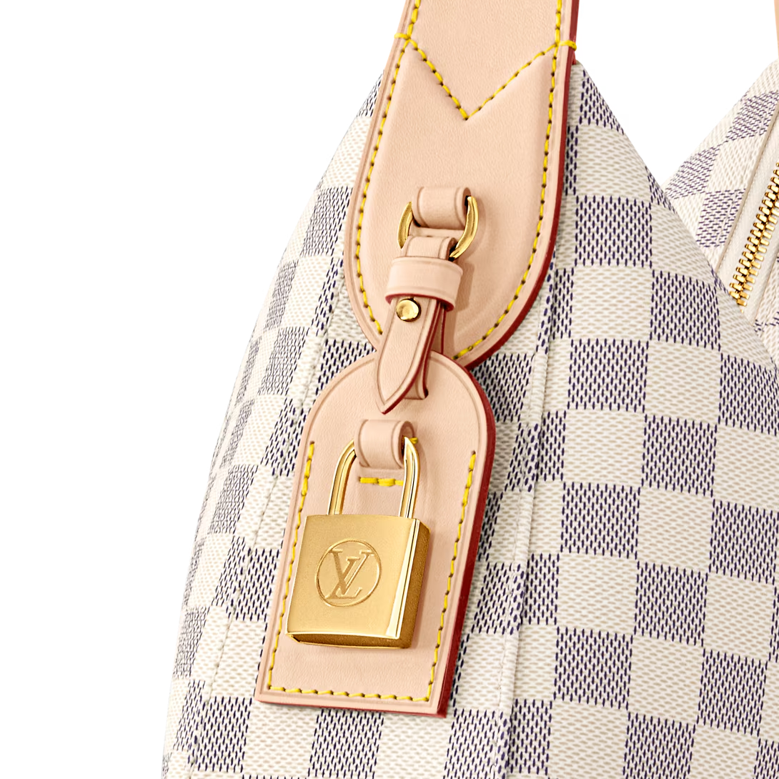 Part of the Damier Azur collection, this edition of the Slouchy PM is inspired by the elegant lifestyle of the French Riviera. The unique pattern is created using a heliogravure printing process and is complemented with sleek gold-toned hardware. Signature details include the natural leather name tag, which includes a padlock that symbolizes the House’s heritage and craftsmanship.