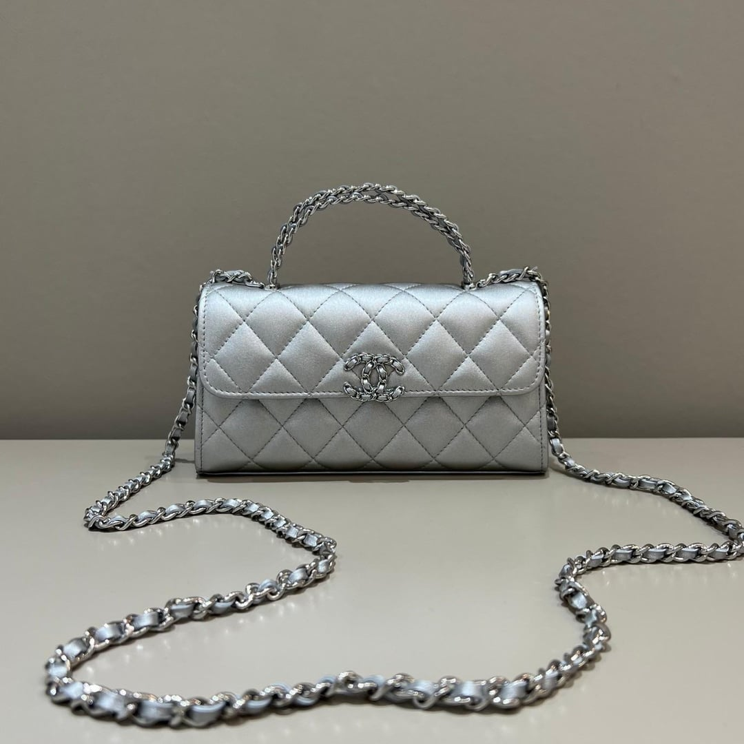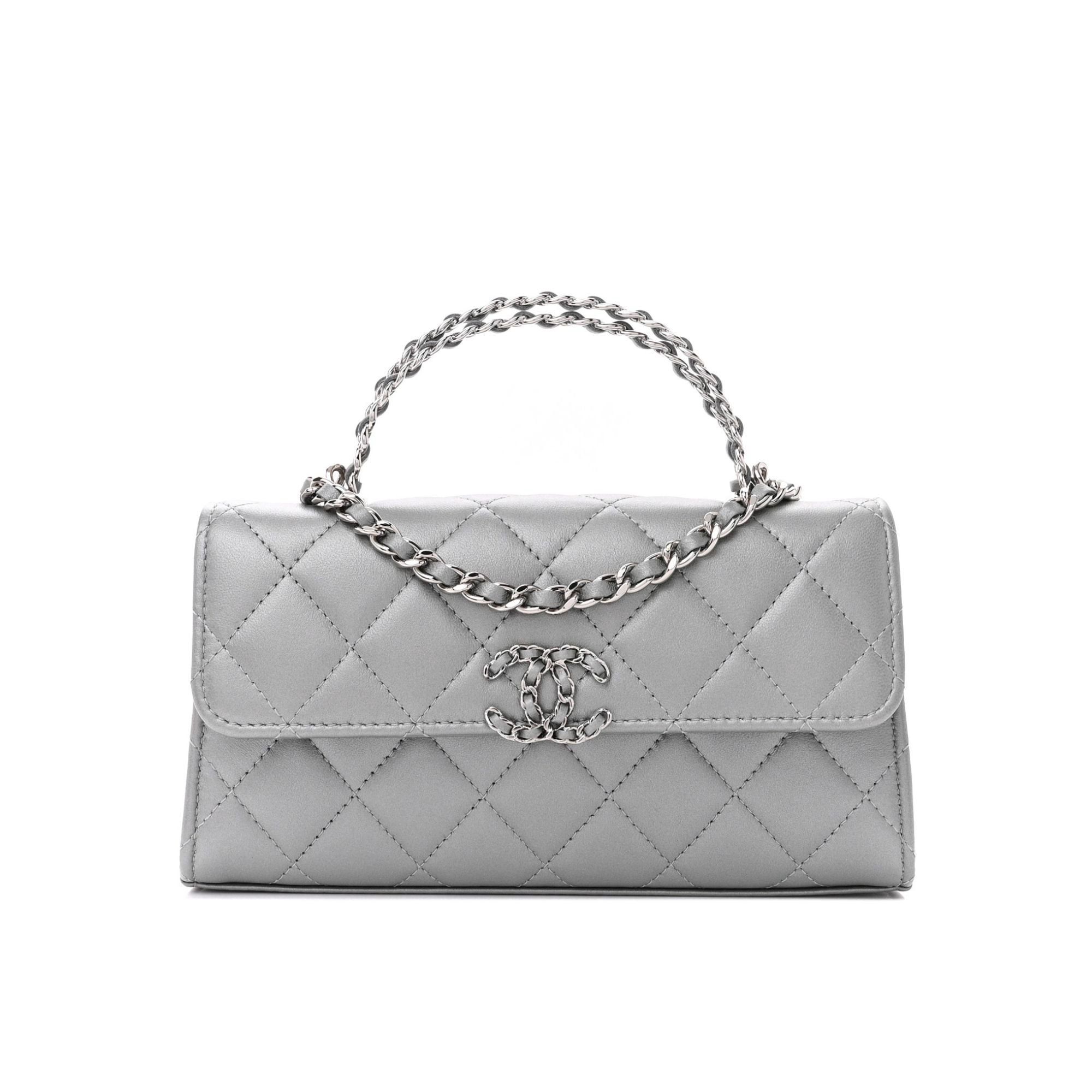 Chanel Lambskin Quilted Chain Top Handle Phone Holder With Chain Silver 18Cm