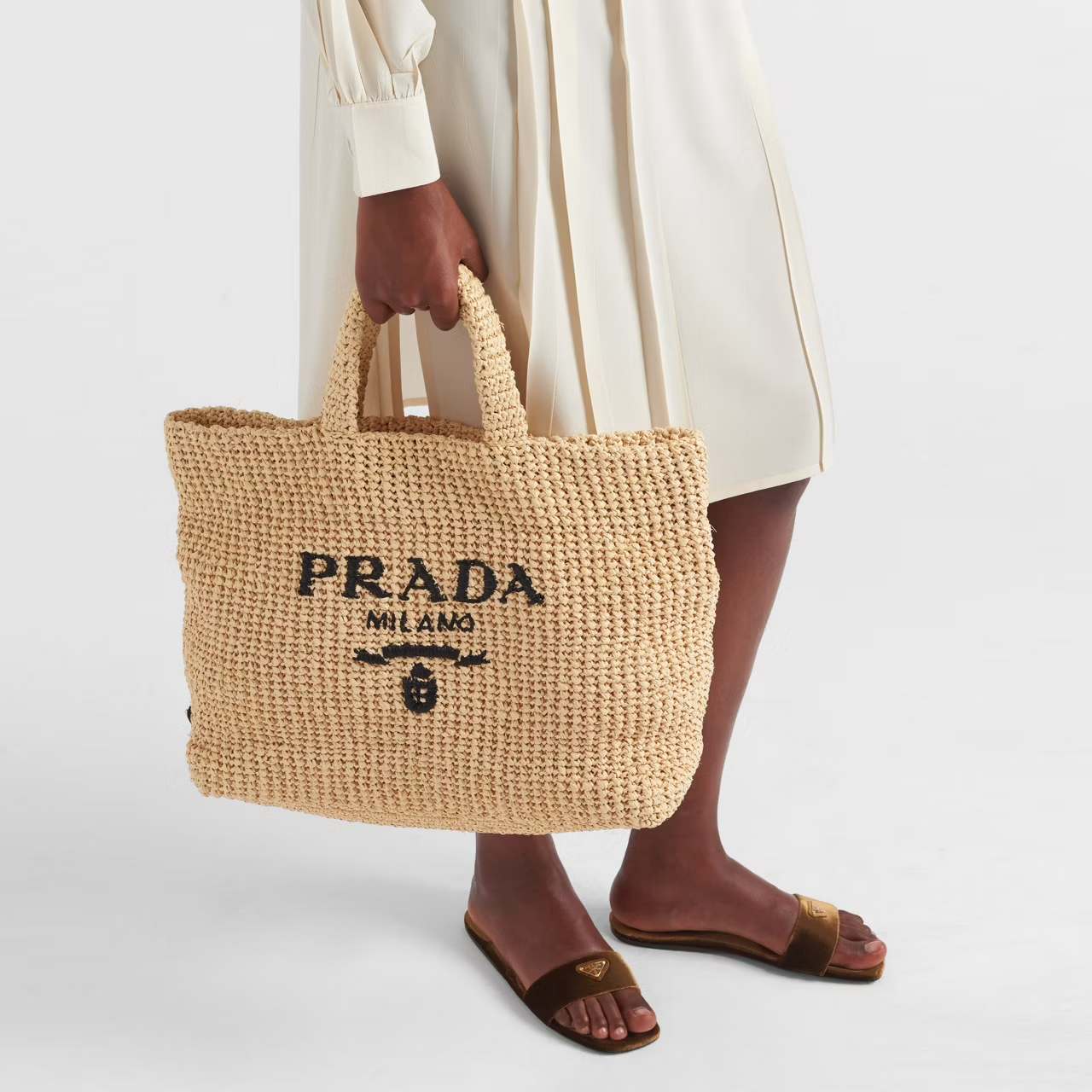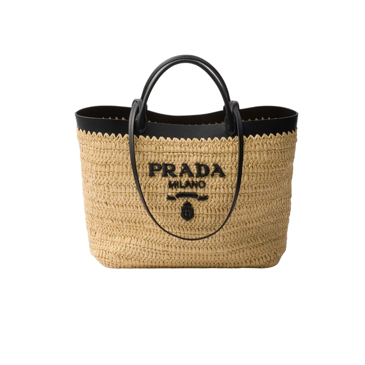 Prada Crochet And Leather Tote Bag Tan And Black 33Cm