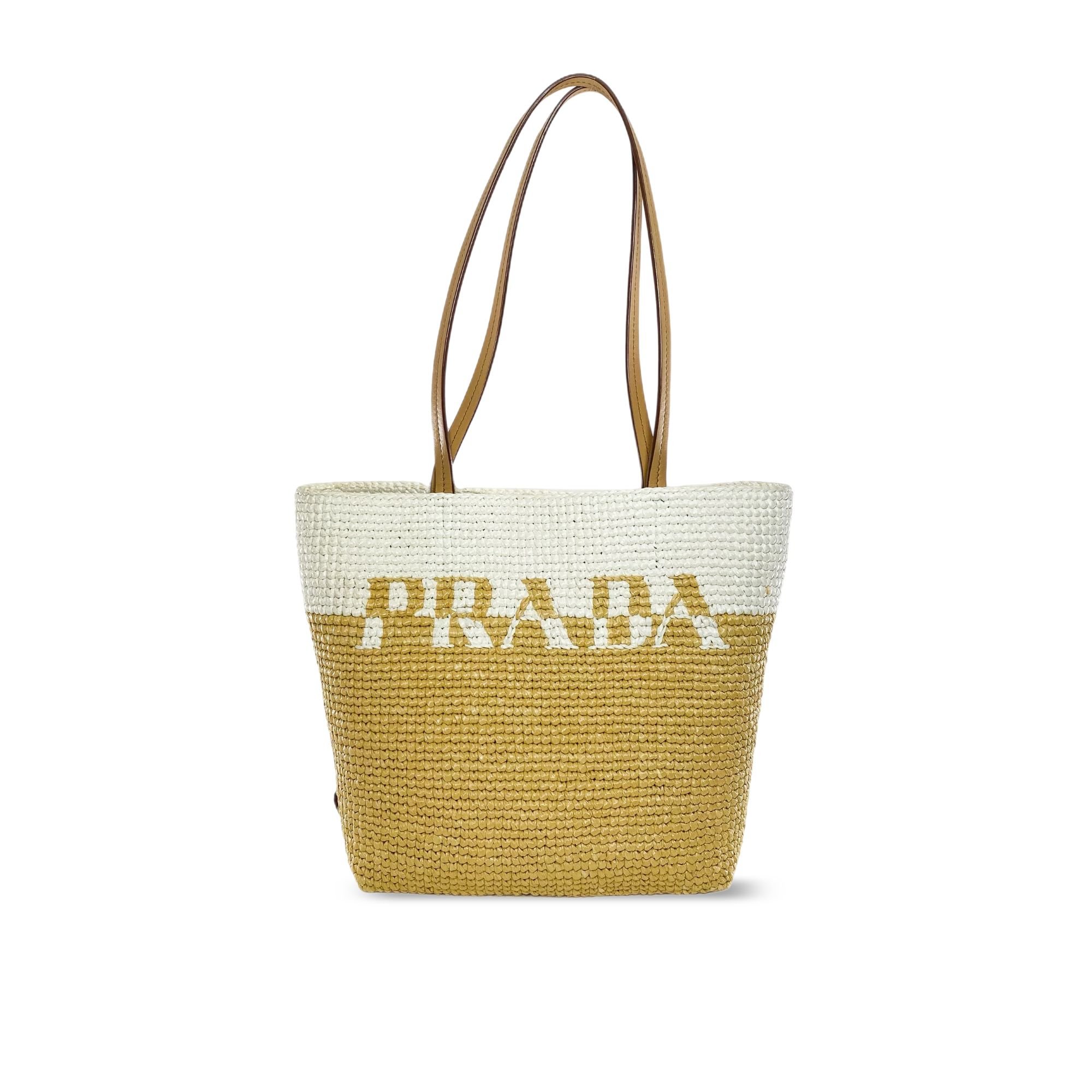 Prada Logo Embossed Raffia Shoulder Bag Beige 33Cm