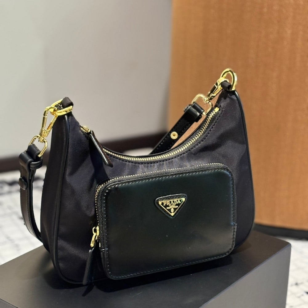 Prada Leather Pocket Re Nylon Shoulder Bag Black 22Cm