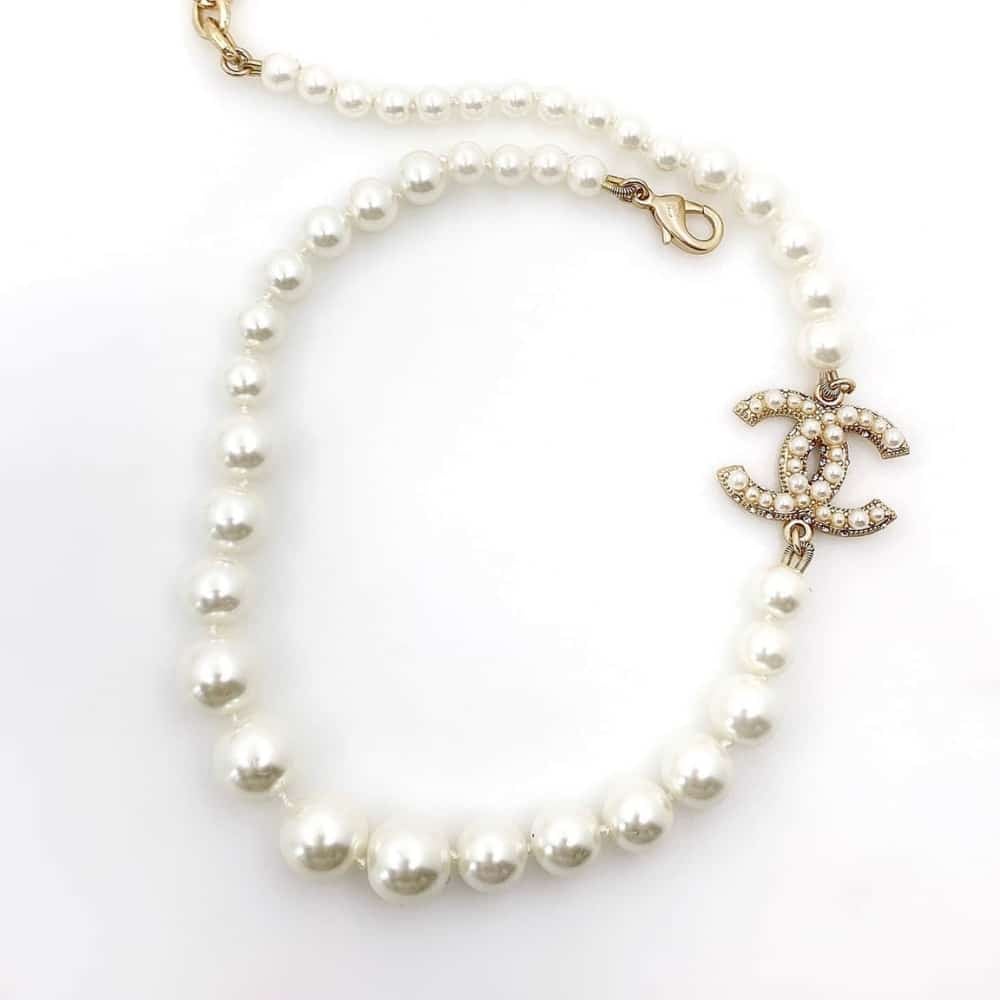 Chanel Metallic Silver Tone Coco Faux Pearl Cc Necklace