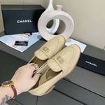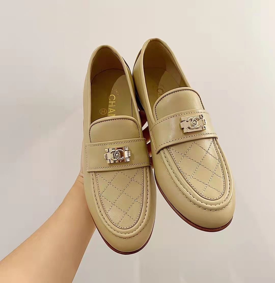 Chanel 20B Quilted Boy Lego Metal Logo Gold Mule Slip On Flat Loafers Beige