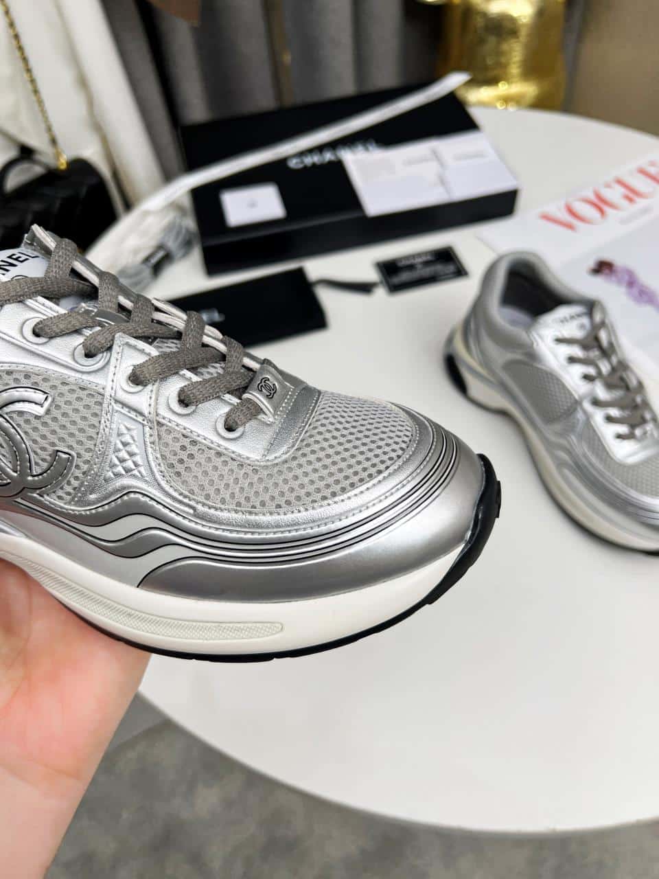 Chanel 23C Silver Metallic Cc Logo Lace Up Flat Runner Trainer Sneaker Gray