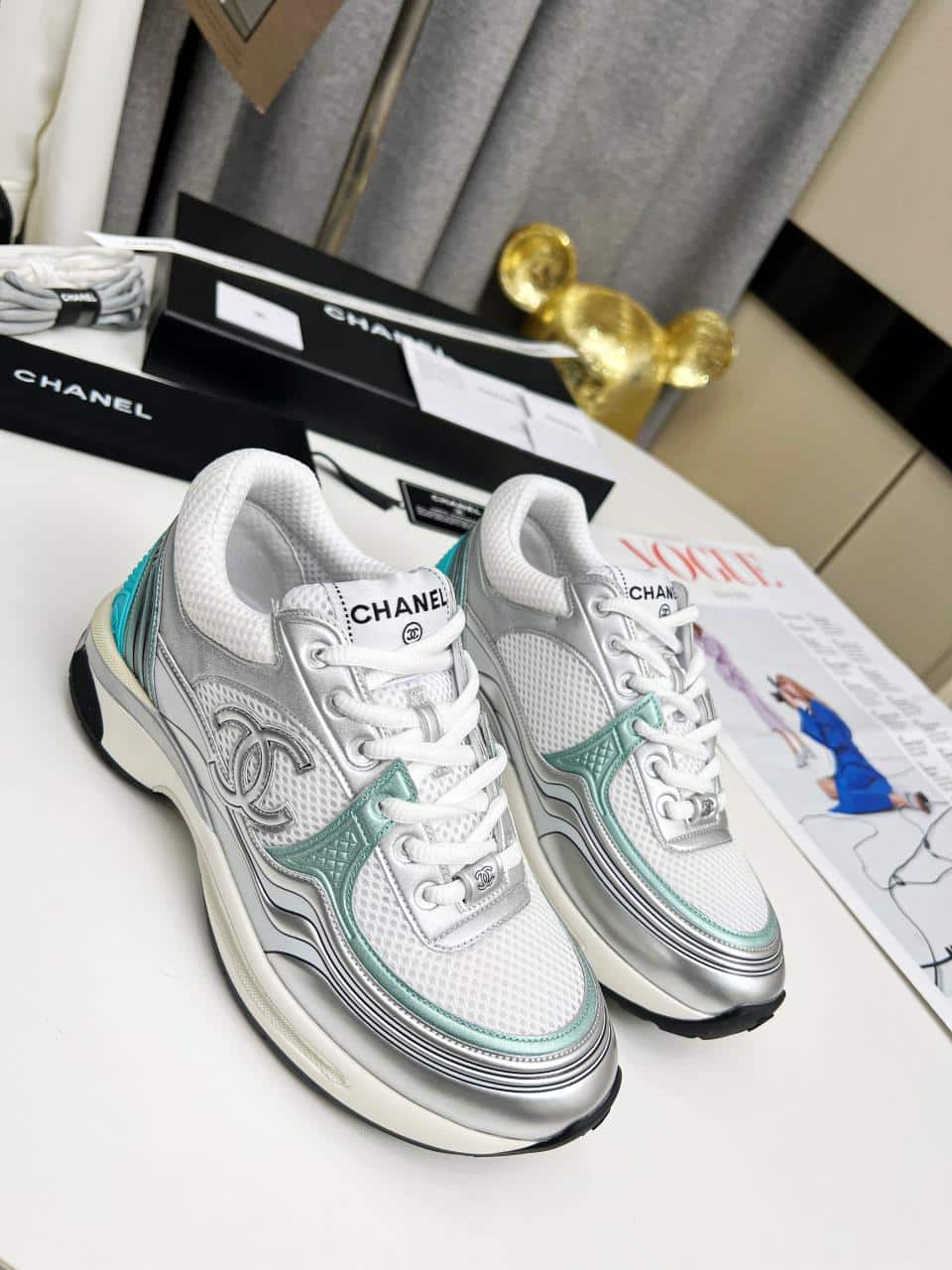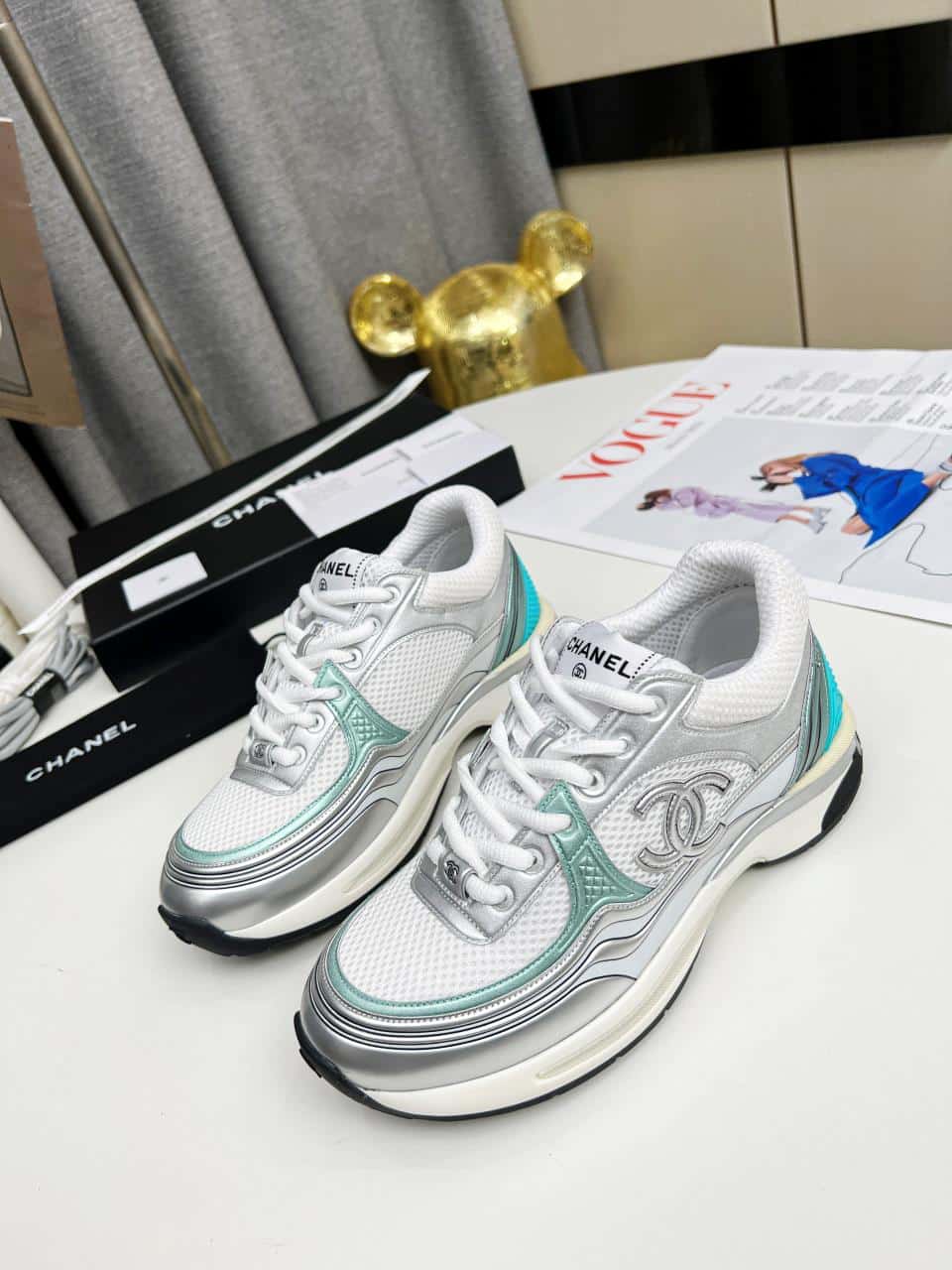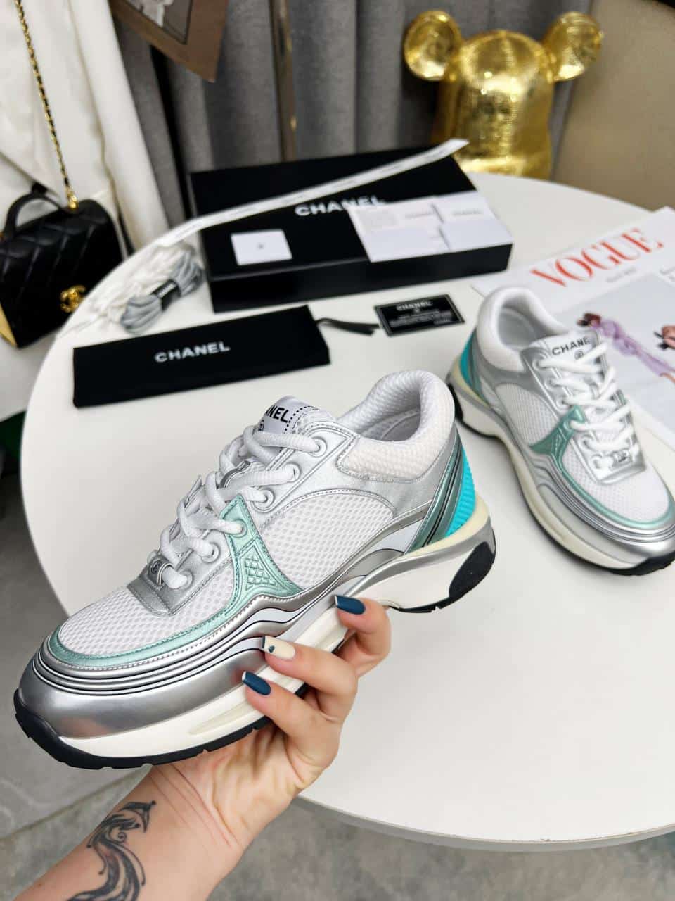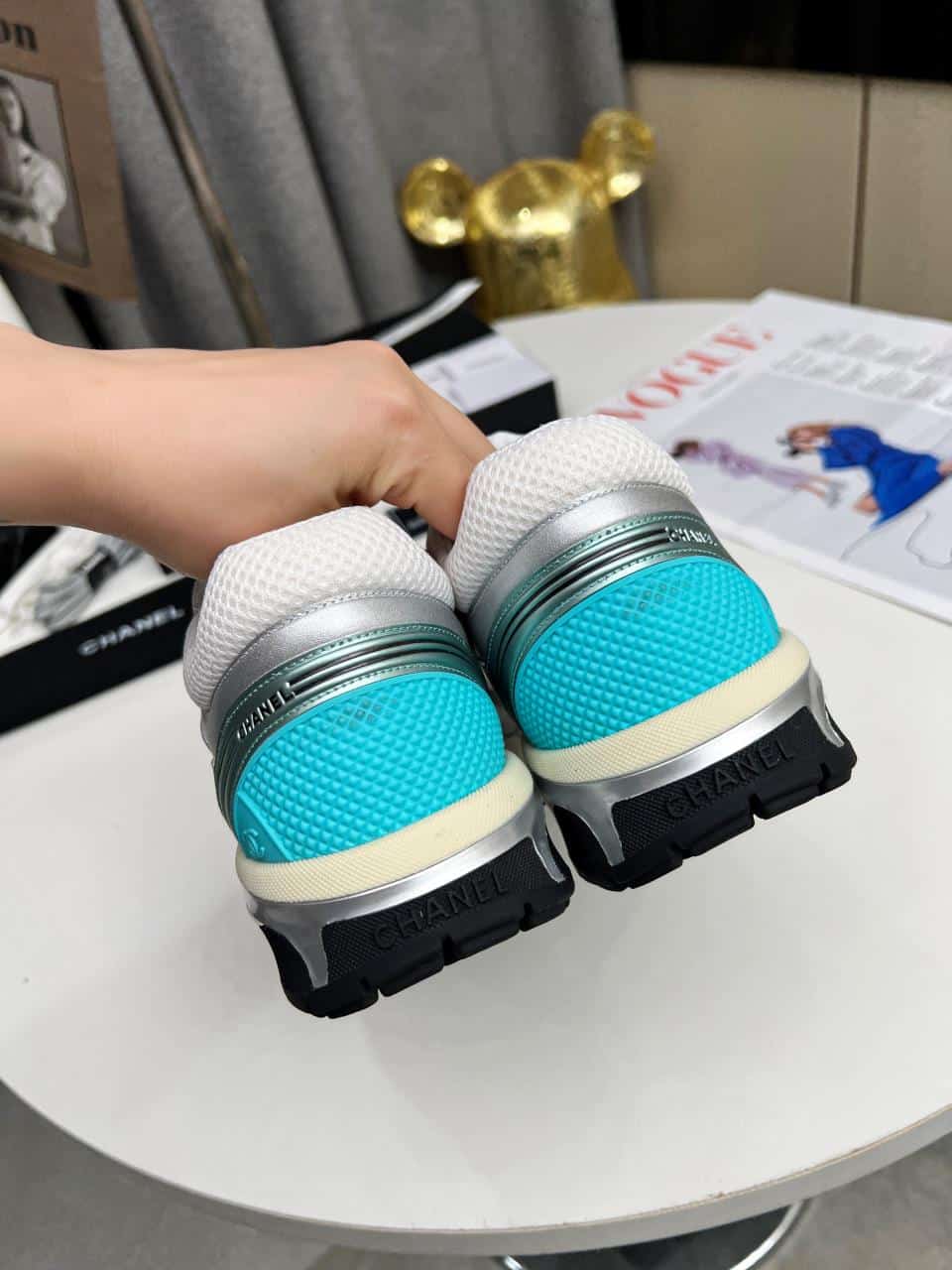 Chanel 23C Silver Metallic Cc Logo Lace Up Flat Runner Trainer Sneaker White Turquoise