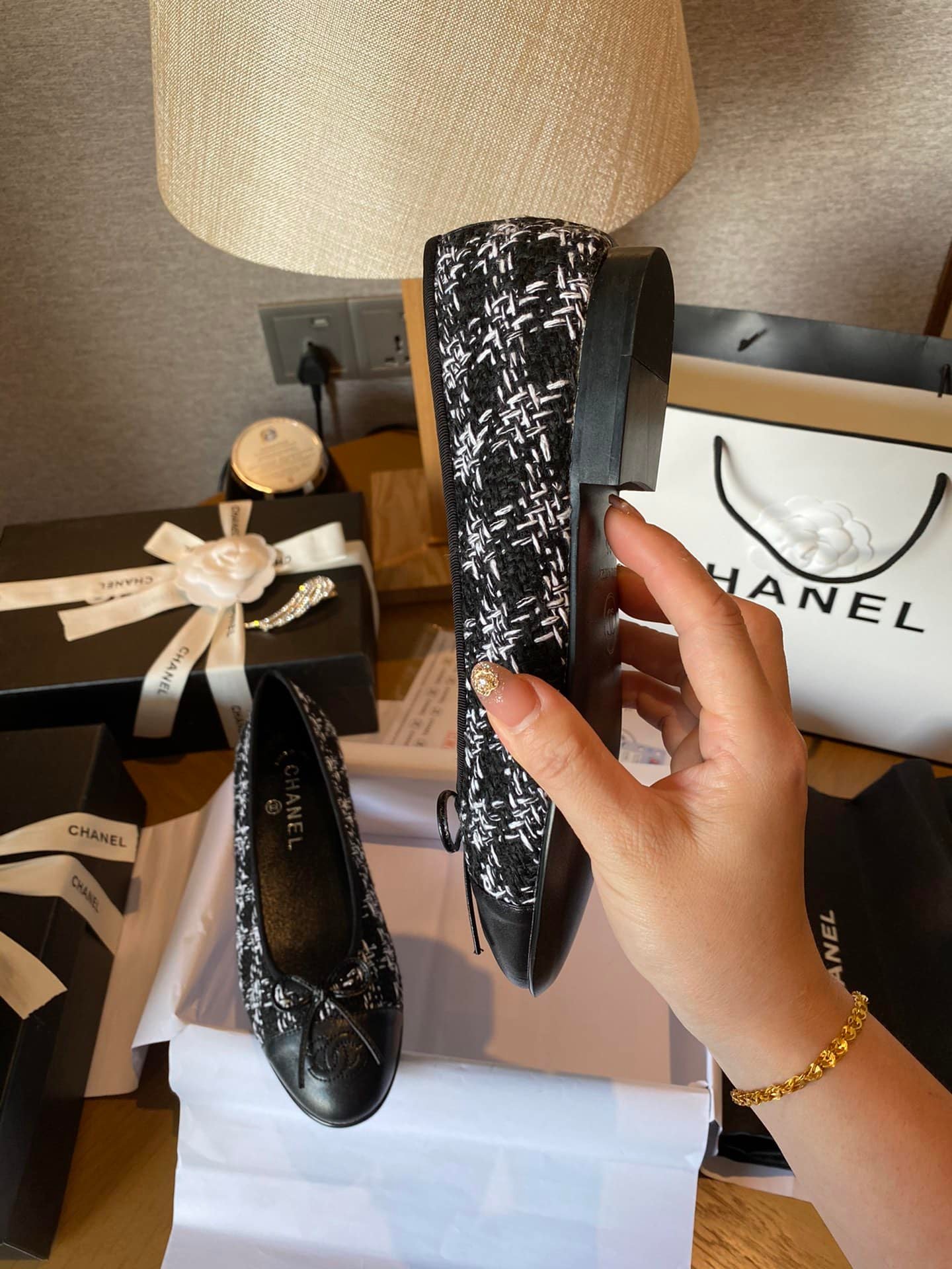 Chanel Plain Toe Rubber Sole Casual Style Tweed Black