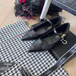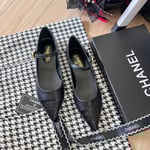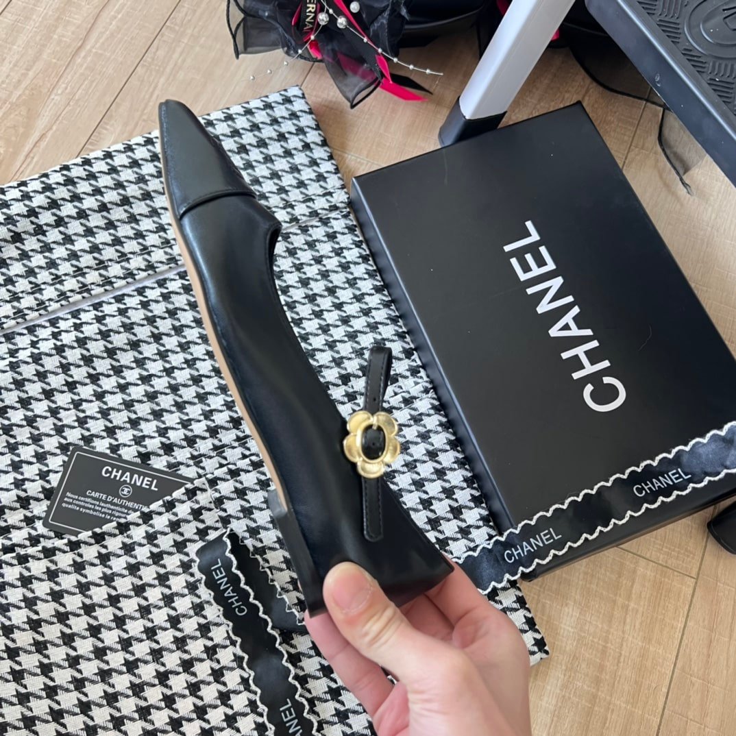 Chanel Pointed Toe Doll Shoes With Gold Flower In Black
