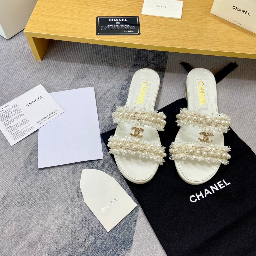 Chanel Mule Slippers Pearl Tweed White