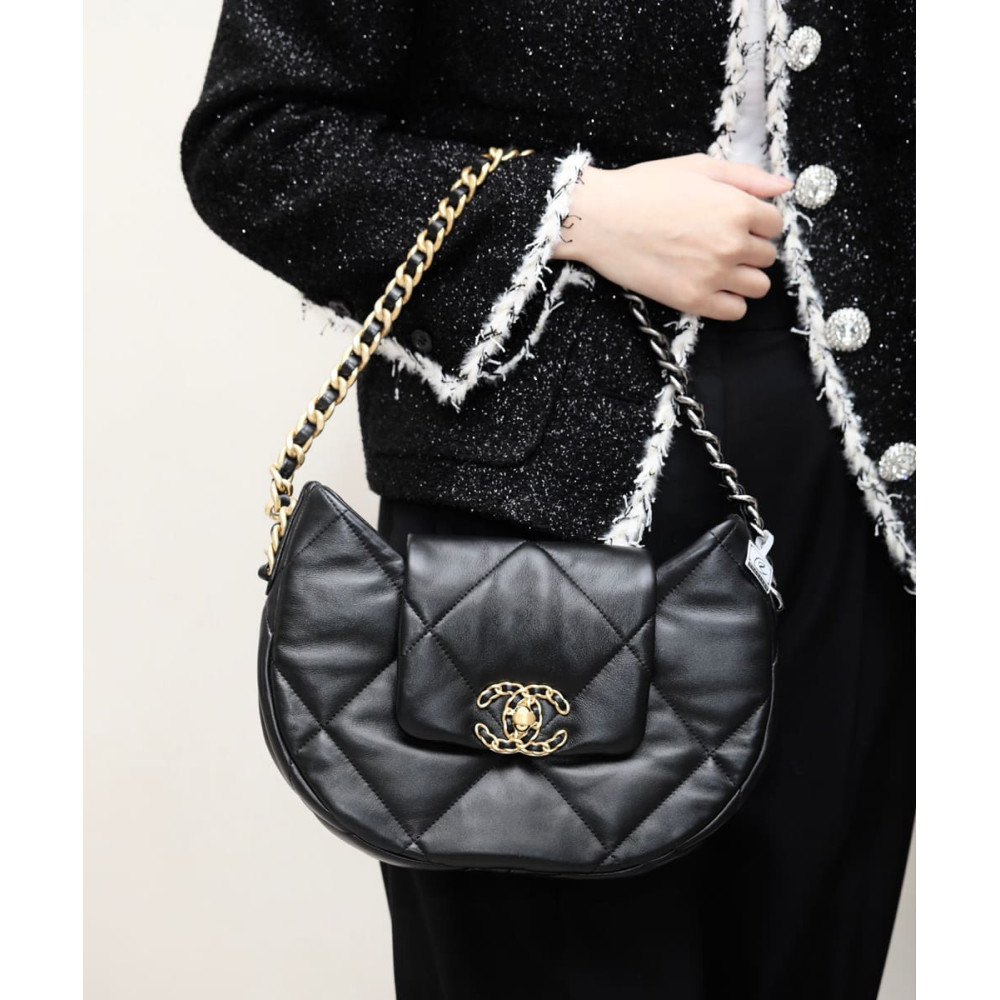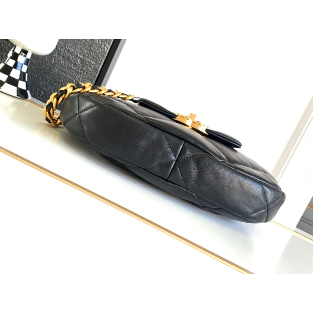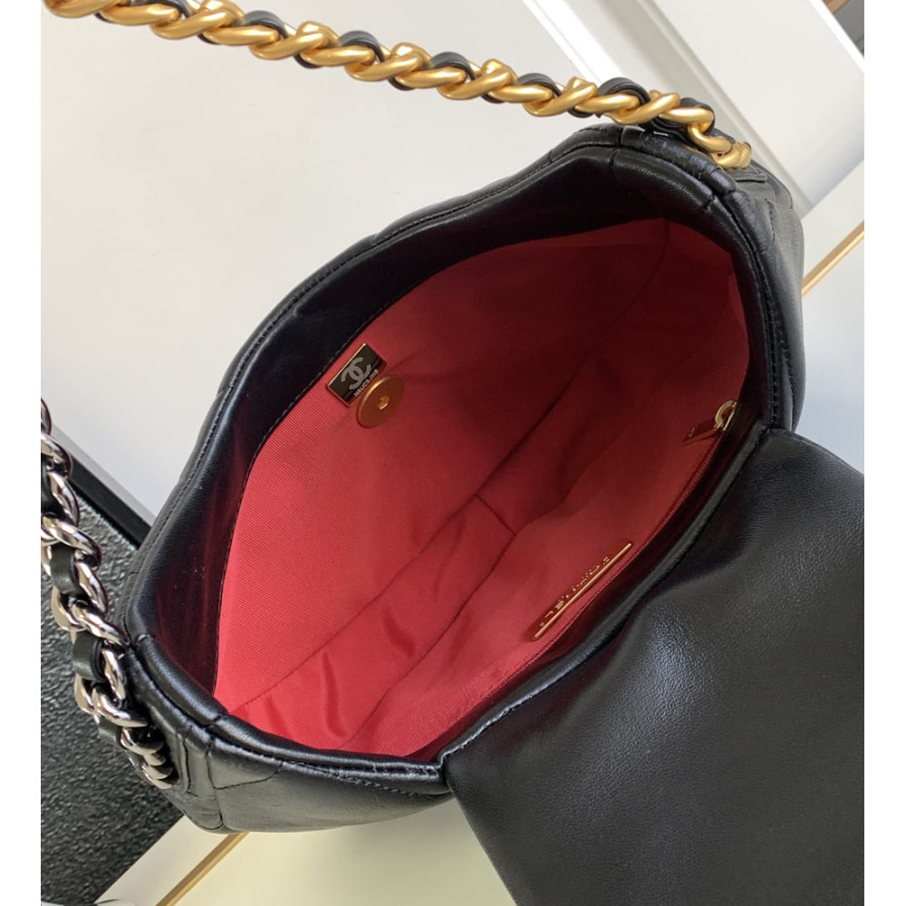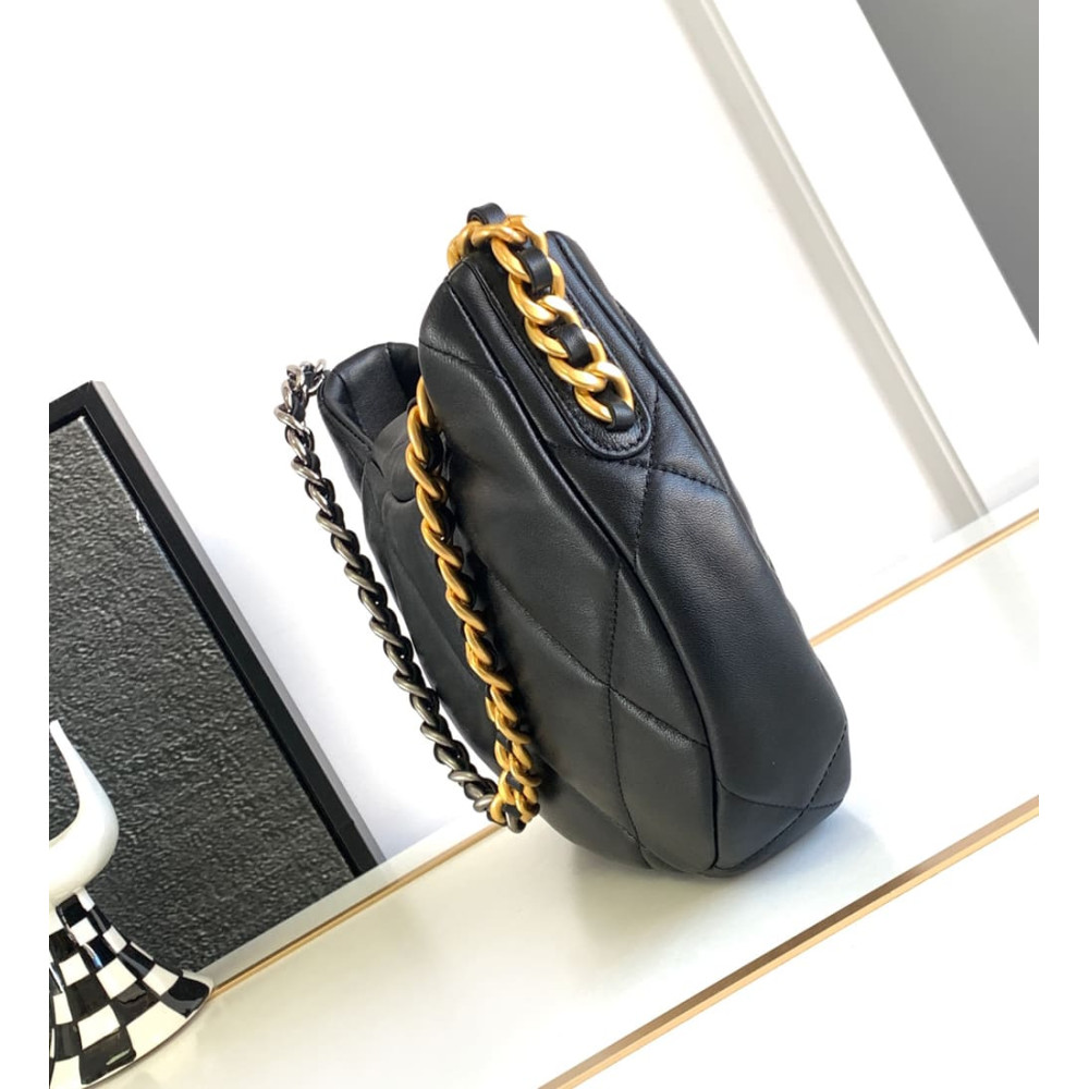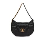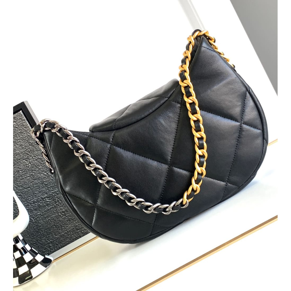 This 19 Hobo Shoulder Bag is in black lambskin with mixed metal hardware and has tonal stitching, 19 style CC on front of bag, and an interwoven mixed metal chain woven with black leather.