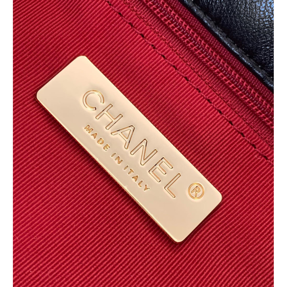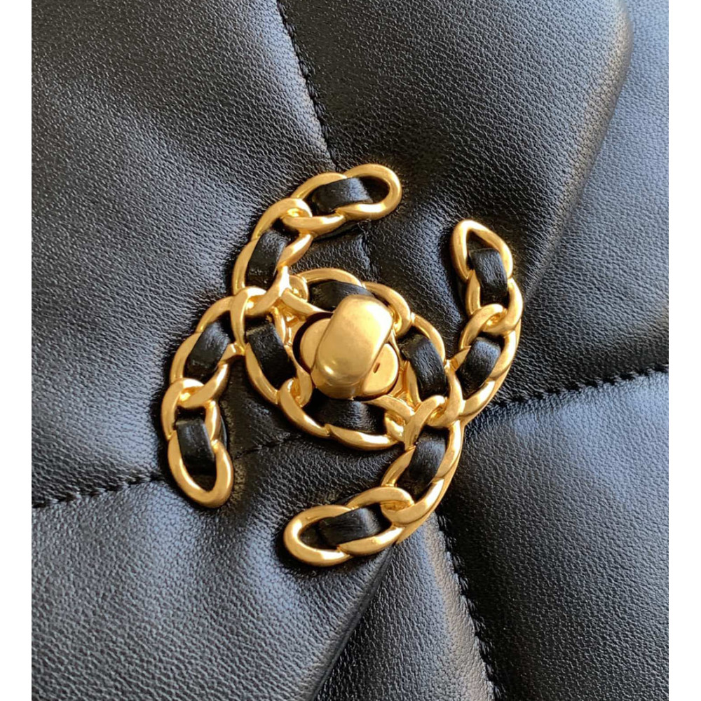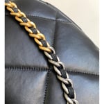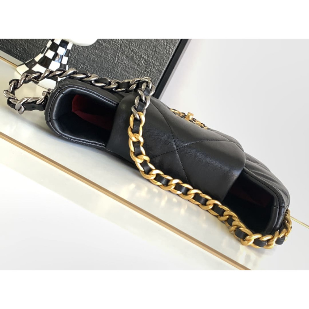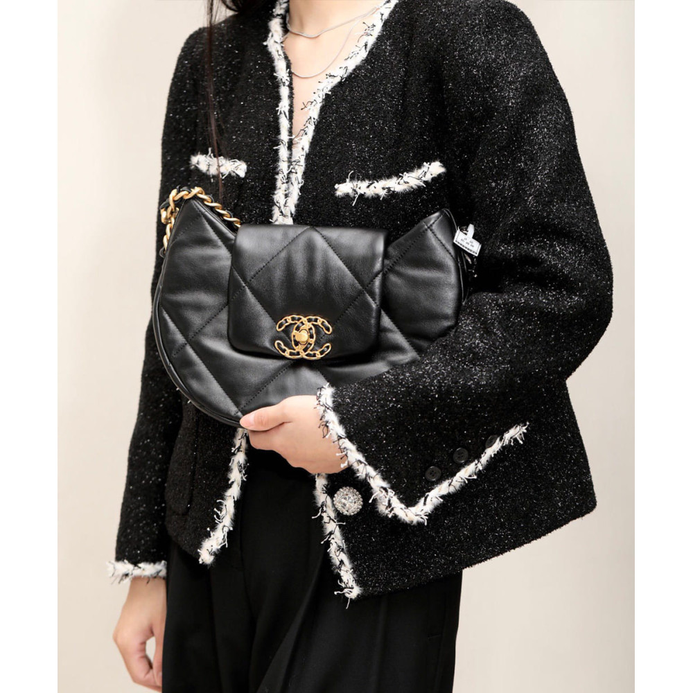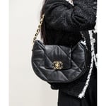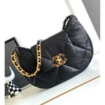 This 19 Hobo Shoulder Bag is in black lambskin with mixed metal hardware and has tonal stitching, 19 style CC on front of bag, and an interwoven mixed metal chain woven with black leather.