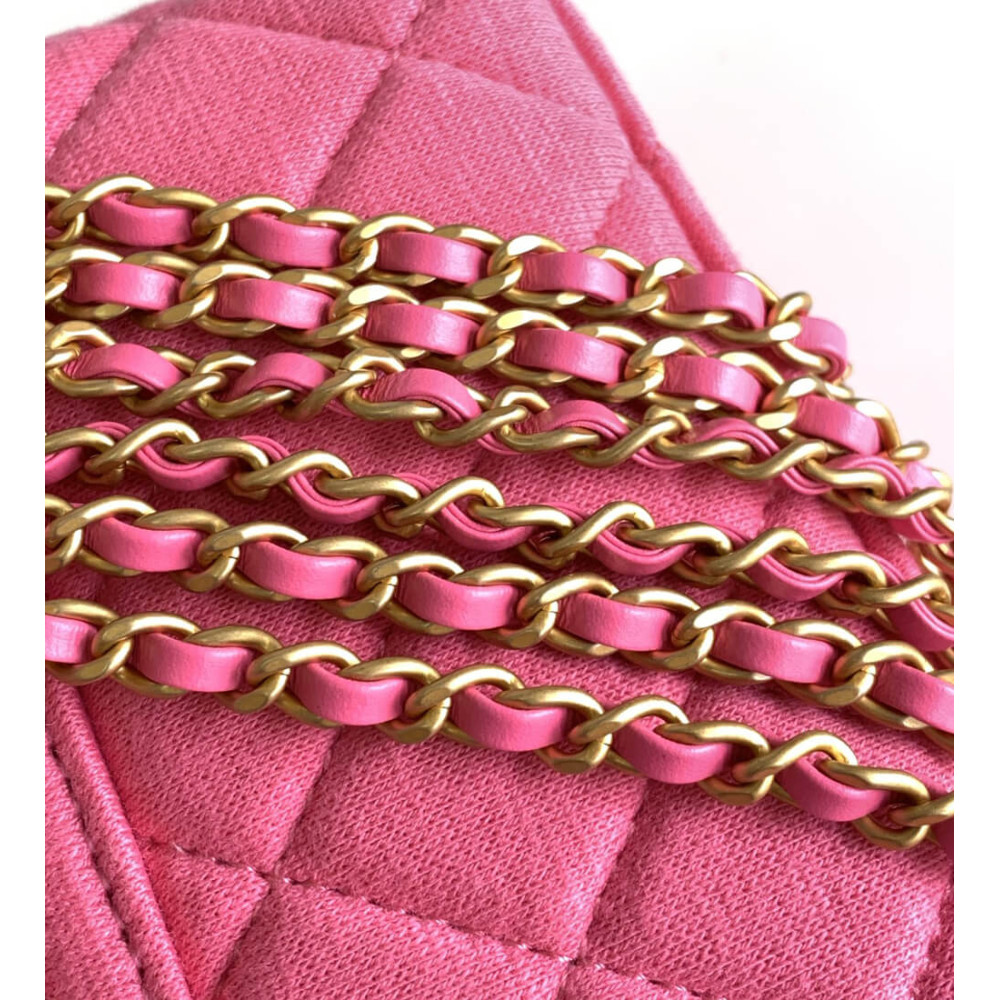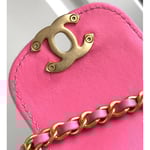 This Nano Kelly is in Chanel Nano Kelly Hot Pink Jersey with Brushed Gold Hardware, tonal stitching, two flat back top handles and an interwoven aged gold with hot pink jersey shoulder strap, and CC turnlock closure.
