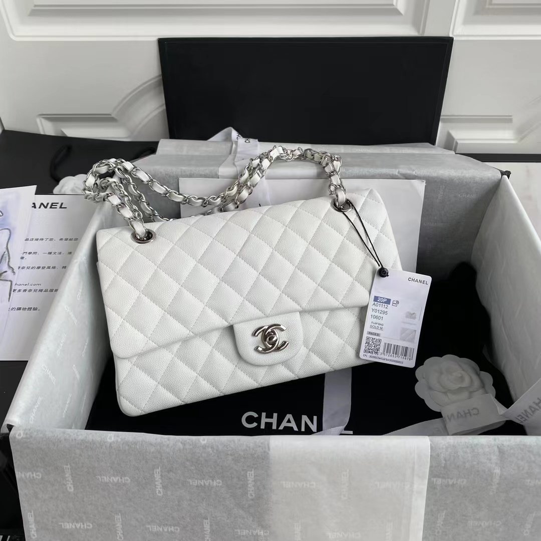 Chanel Classic Double Flap Bag White Silver Hardware 25Cm/10in