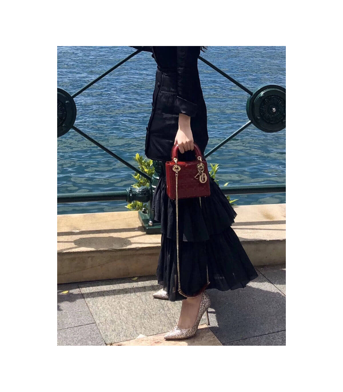 The Lady Dior handbag epitomizes the House’s vision of elegance and beauty. Sleek and refined the timeless yet relevant style is crafted in black patent calfskin with Cannage stitching, creating the instantly recognizable quilted texture. The pale gold-finish metal signature ‘D.I.O.R.’ charms embellish and illuminate its silhouette. Featuring a removable chain shoulder strap, the miniature Lady Dior bag can be carried by hand, worn over the shoulder or crossbody as an ideal evening companion.