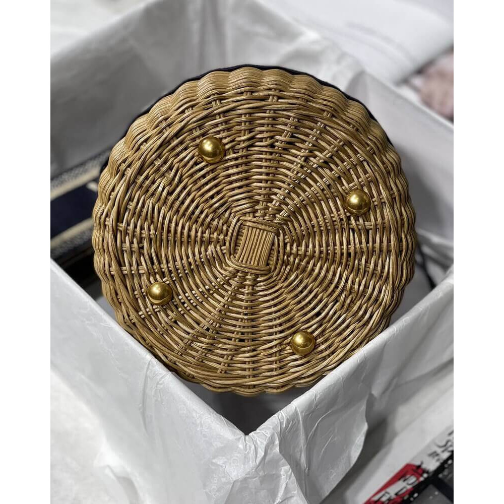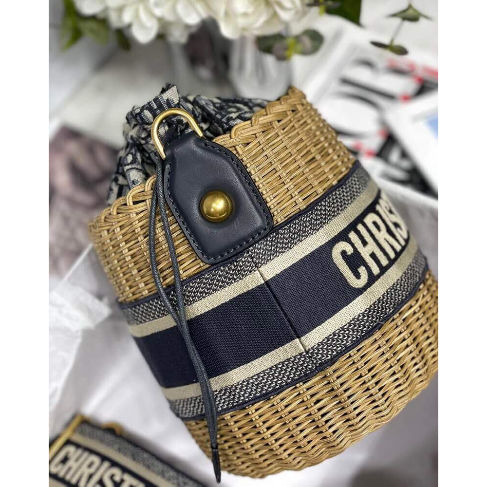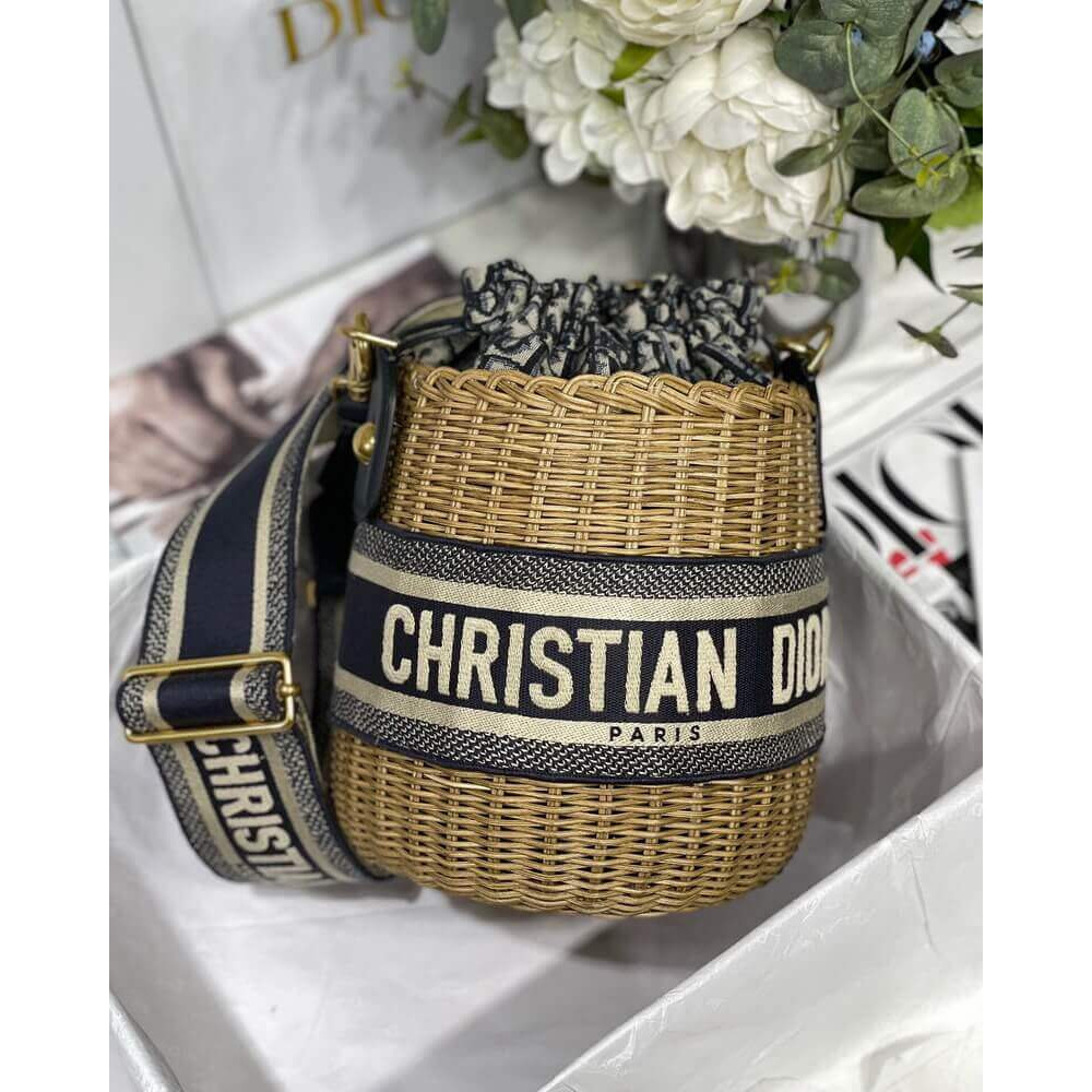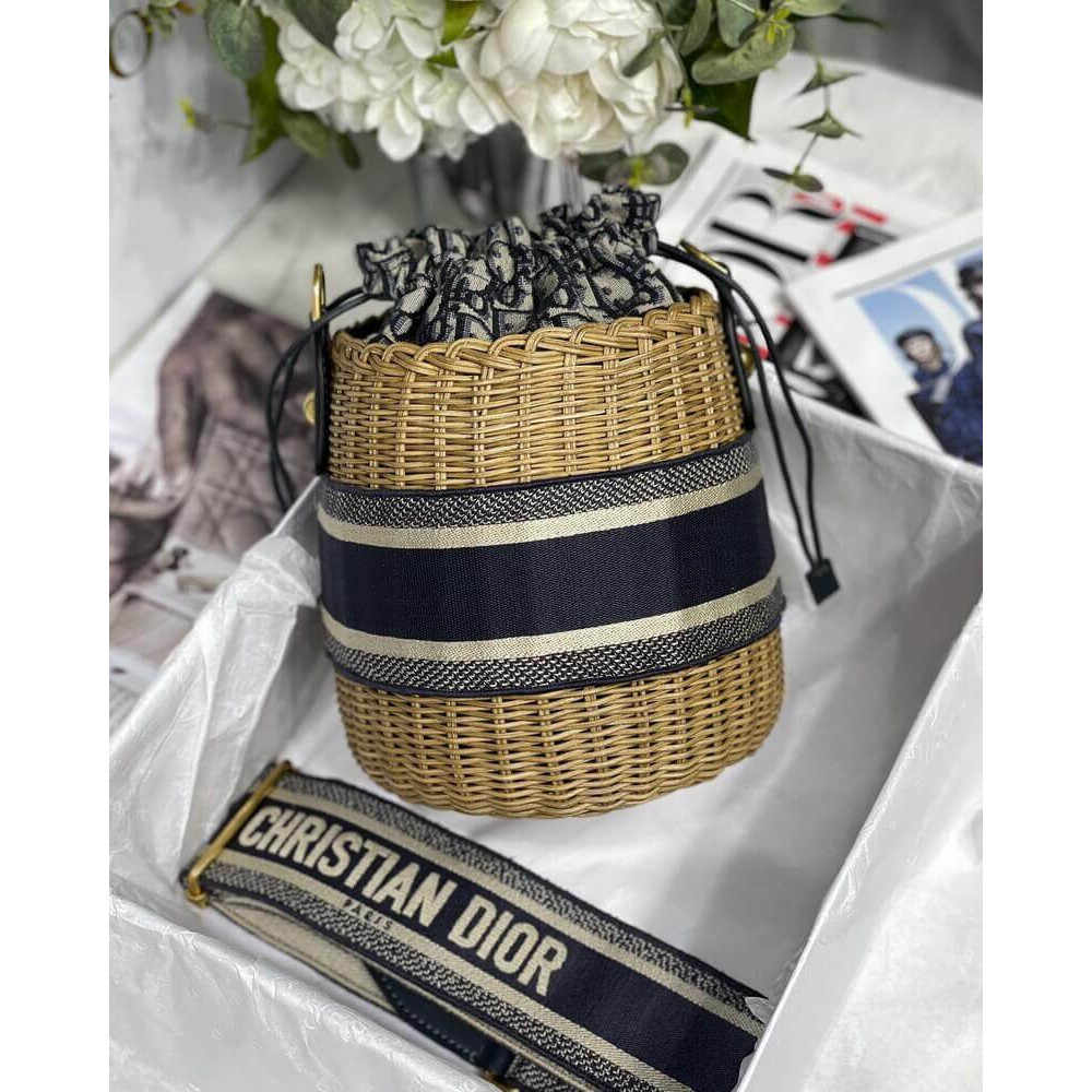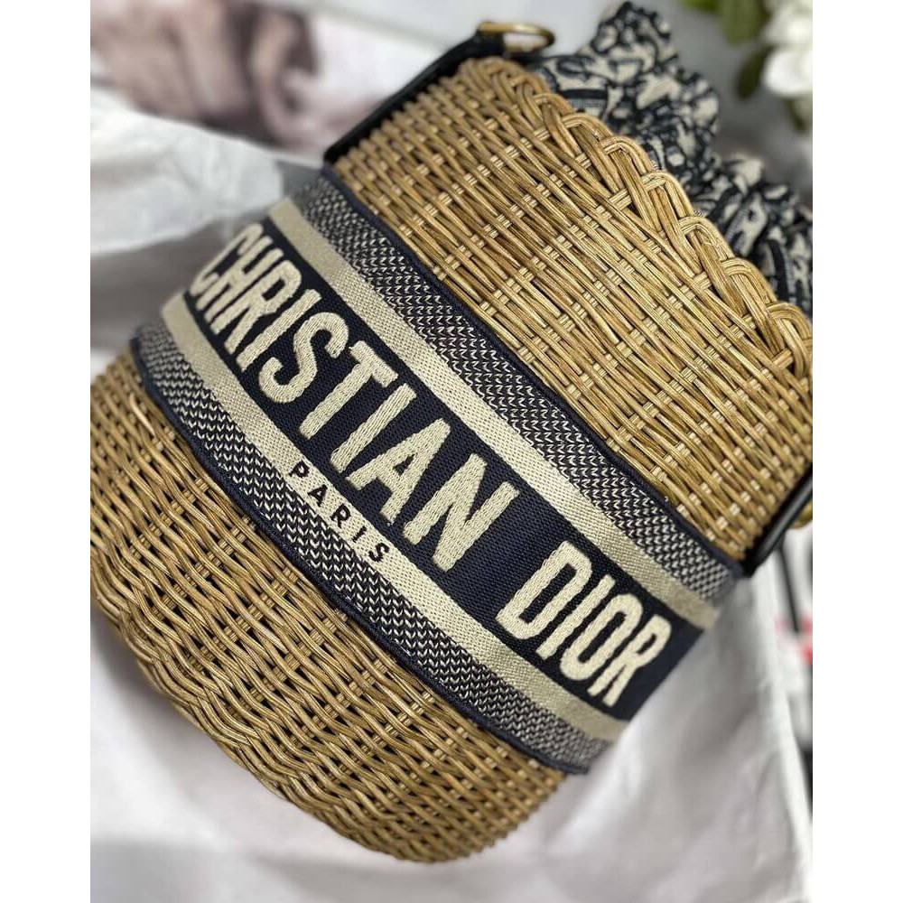 The Dior Wicker bucket bag is a timeless creation traditionally crafted in natural hand-woven wicker and exemplifies Dior’s savoir-faire. The design features a blue Dior Oblique jacquard interior pouch with a patch pocket and drawstring closure. Inspired by the hallmark Dior Book Tote, it showcases a band embroidered with the ‘CHRISTIAN DIOR’ signature, while the wide embroidered shoulder strap allows it to be worn over the shoulder or crossbody.