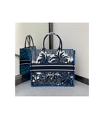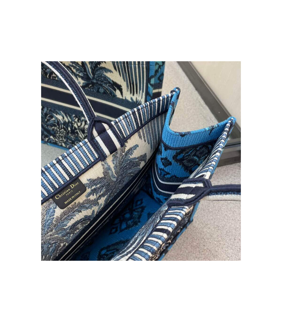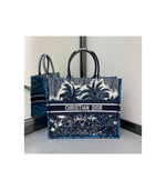 The Dior Book Tote, an original style introduced by Creative Director Maria Grazia Chiuri, has become a staple of the Dior aesthetic. Designed to carry all the daily essentials, the silhouette offers a new take on the hallmark Toile de Jouy with a fully embroidered variation with the blue Dior Palms motif. The front boasts a ‘Christian Dior’ signature while a graphic motif adorns the sides for a contrasting modern touch. The carryall is a prime example of Dior savoir-faire.