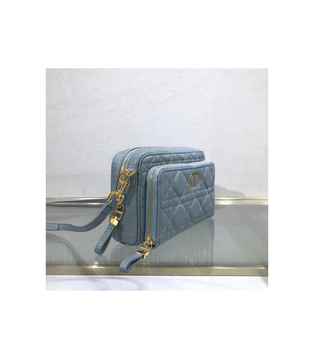 The Dior Caro double pouch, both spacious and compact, is ideal for daily life. Crafted in black calfskin, it is embellished with hallmark Cannage topstitching and features two large compartments, a zipped pocket and two card slots to hold all the essentials. The removable and adjustable strap allows it to be carried by hand, worn over the shoulder or crossbody.