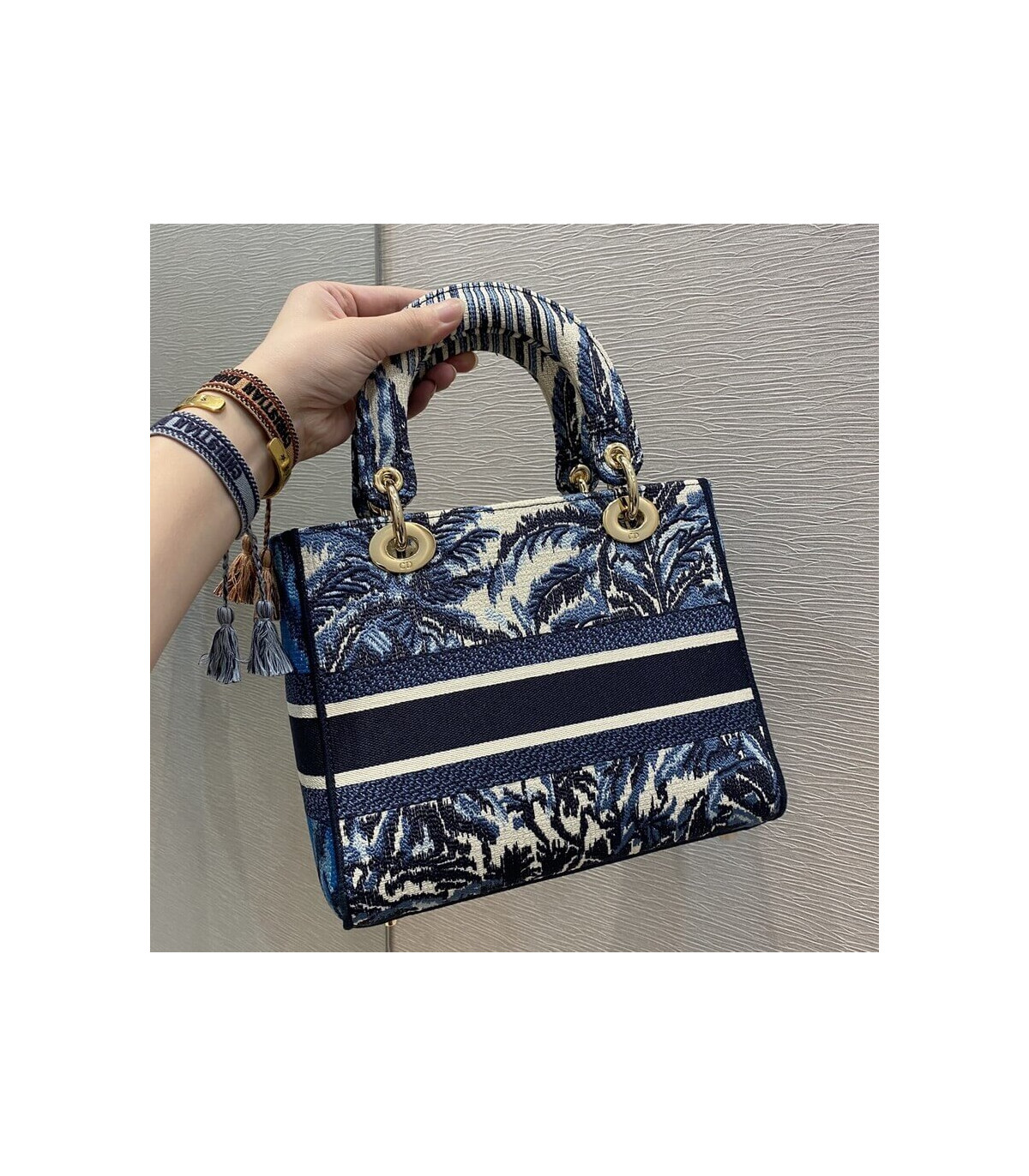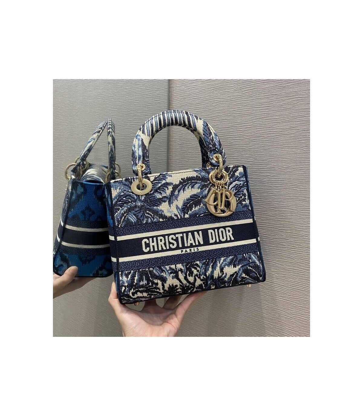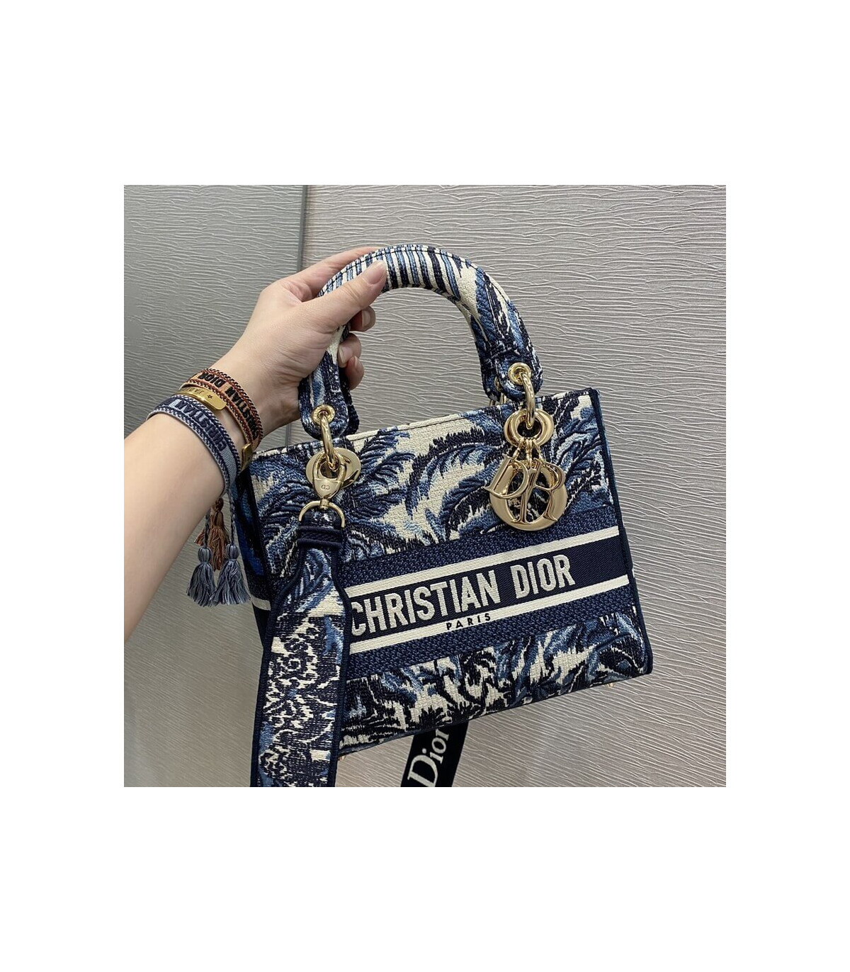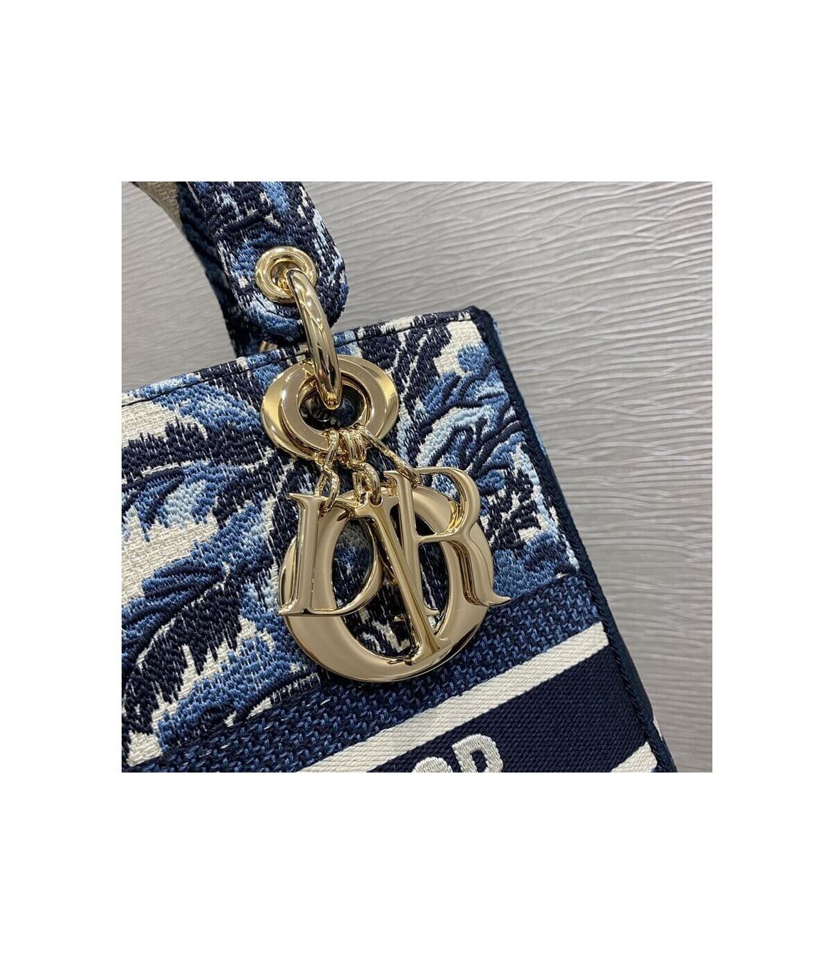 The Lady D-Lite bag combines classic elegance with House modernity. The style offers a new take on the hallmark Toile de Jouy with a variation fully embroidered with the blue Dior Palms motif. The front features a ‘Christian Dior’ signature while the thick ‘D.I.O.R.’ charms in pale gold-finish metal embellish the style with a graphic touch. Equipped with a wide, reversible, and removable embroidered shoulder strap, the medium Lady D-Lite bag can be carried by hand, worn over the shoulder or crossbody.
