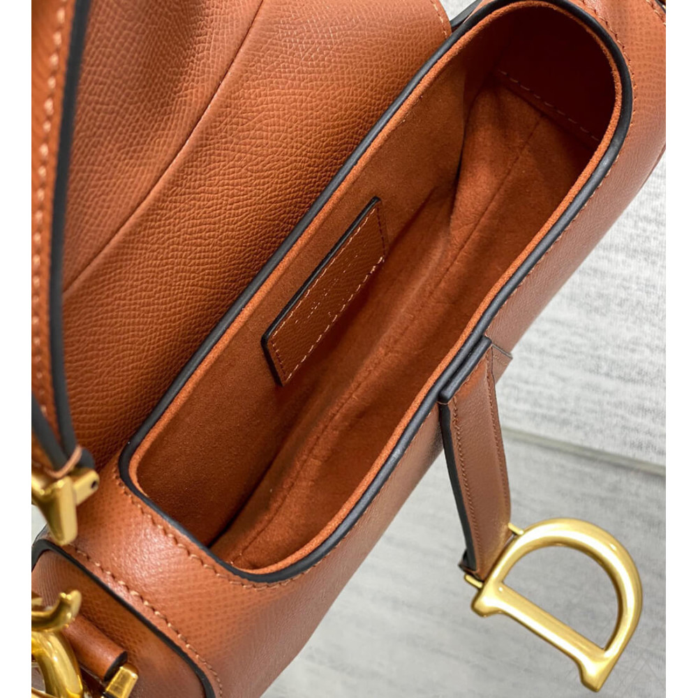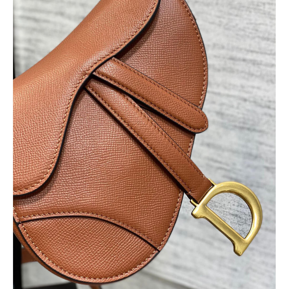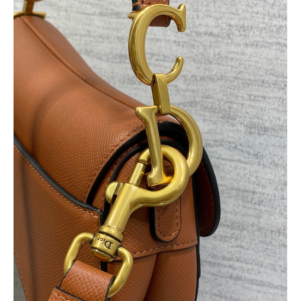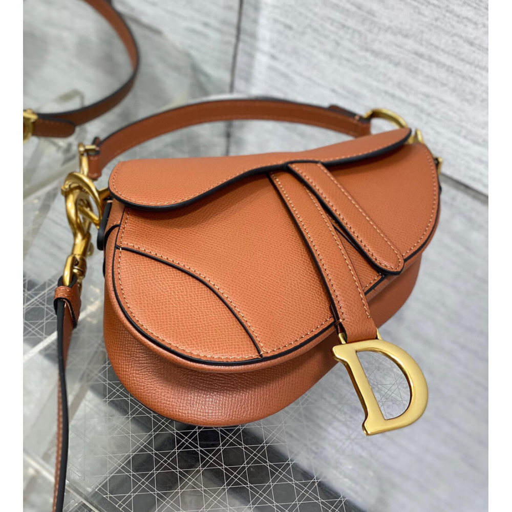 Maria Grazia Chiuri brings a fresh update to the iconic Saddle bag. Crafted in latte grained calfskin, the legendary design features a Saddle flap with a D stirrup clasp on a magnetic strap, as well as an antique gold-finish metal CD signature on either side of the strap. Equipped with a thin, adjustable and removable shoulder strap, the miniature Saddle bag may be carried by hand, worn over the shoulder or crossbody.