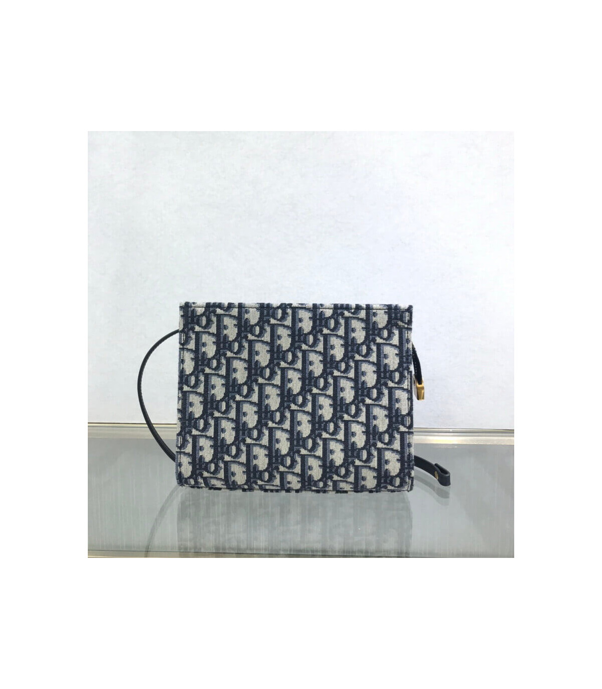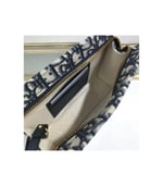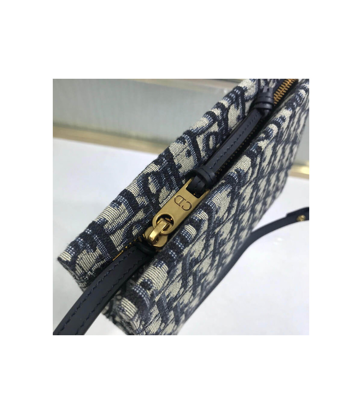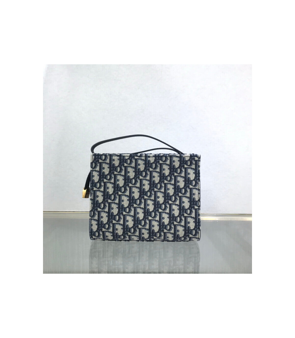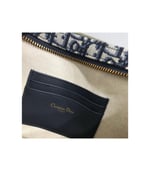 This bag is finely crafted of navy blue on beige Dior monogram canvas. The bag features a leather shoulder strap and polished aged?gold hardware. The top zipper opens to a beige fabric interior with card slots.?