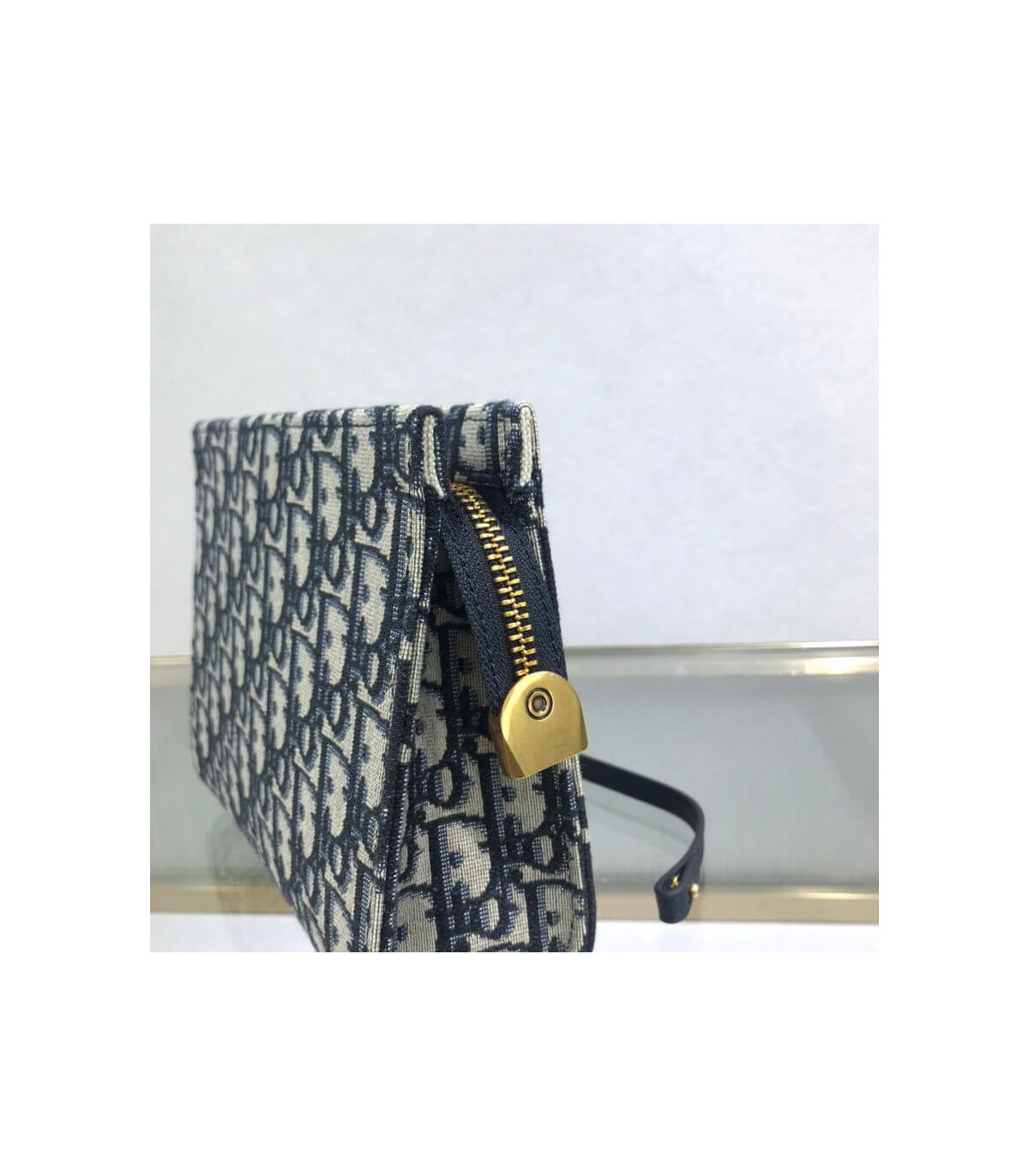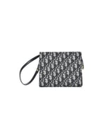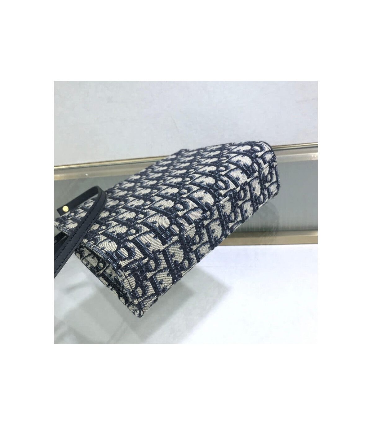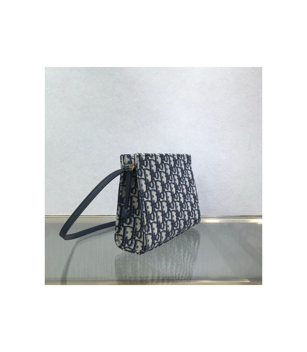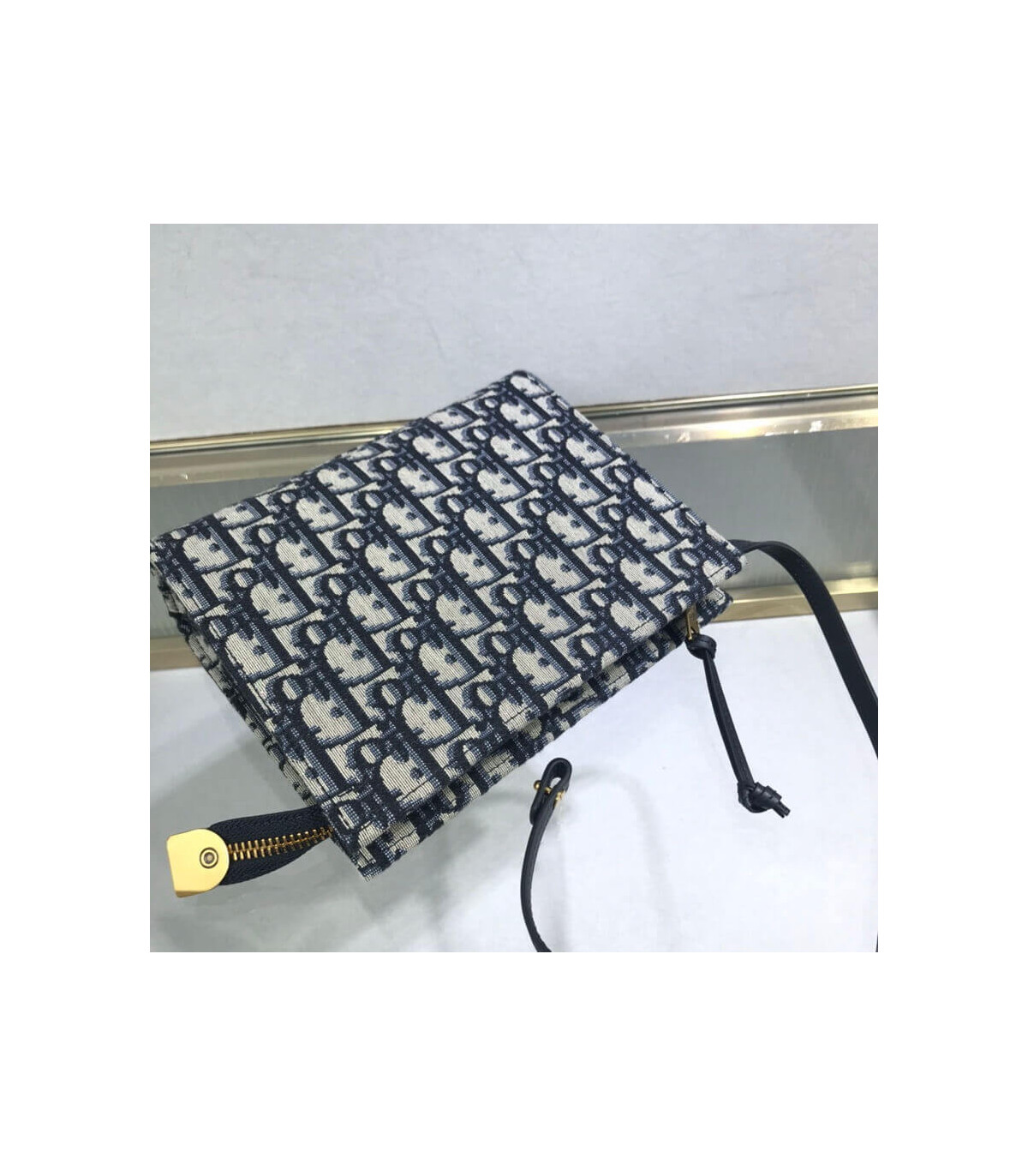This bag is finely crafted of navy blue on beige Dior monogram canvas. The bag features a leather shoulder strap and polished aged?gold hardware. The top zipper opens to a beige fabric interior with card slots.?