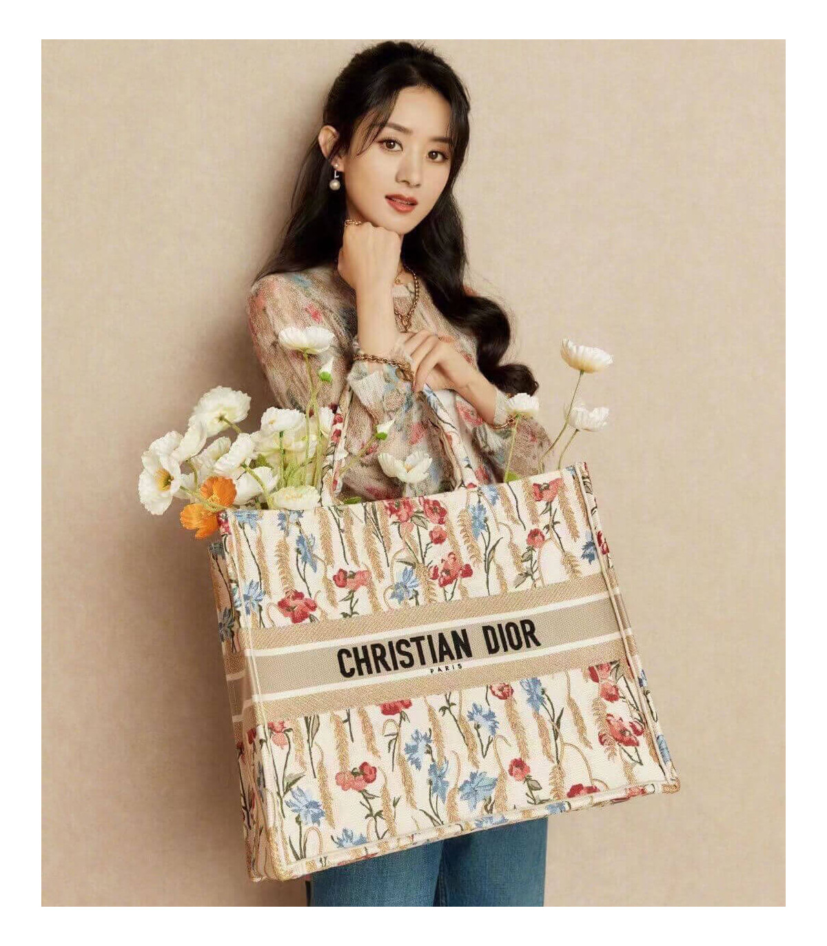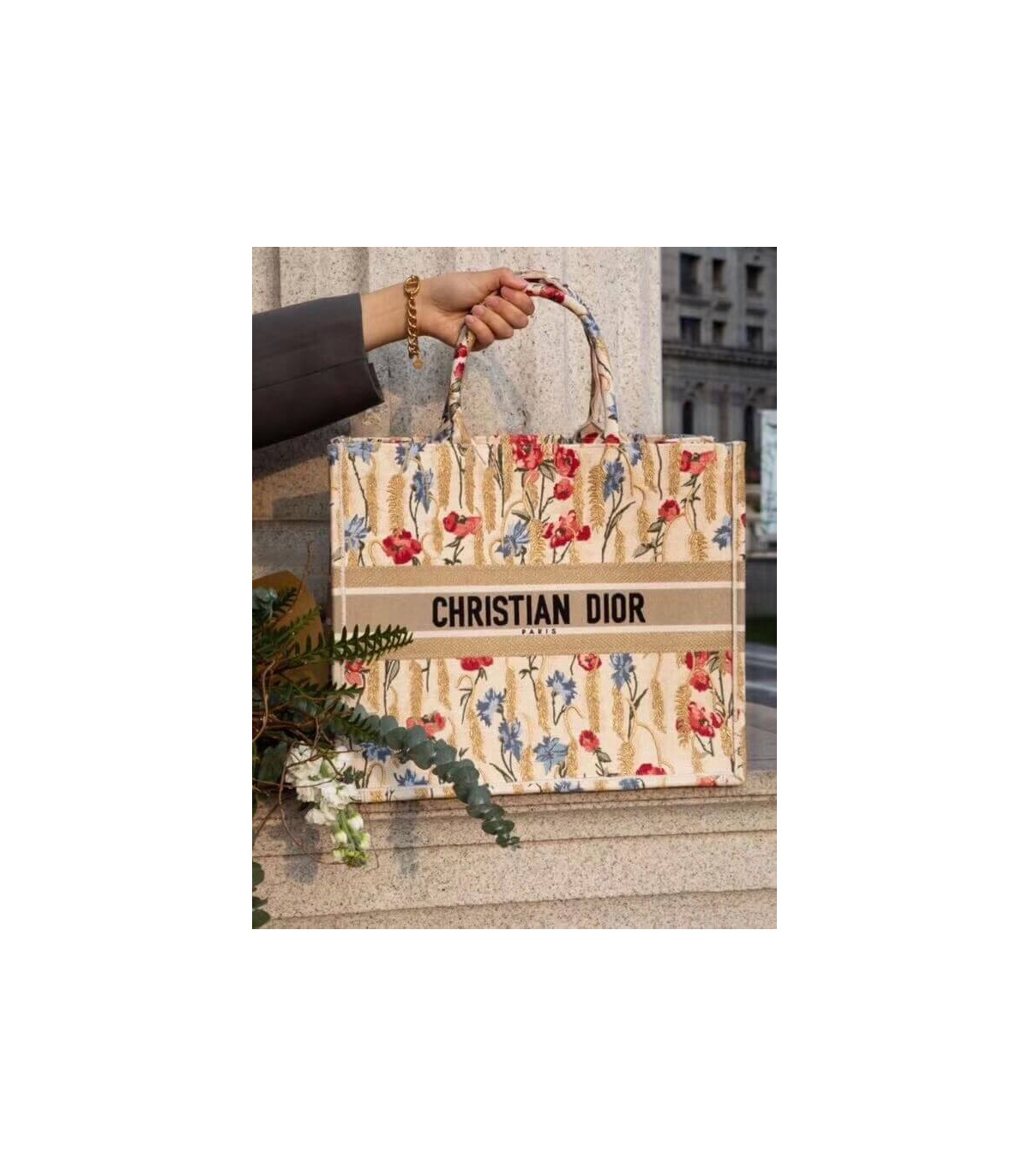 Dior Book Tote in Beige Multicolor Hibiscus Metallic Thread Embroidery